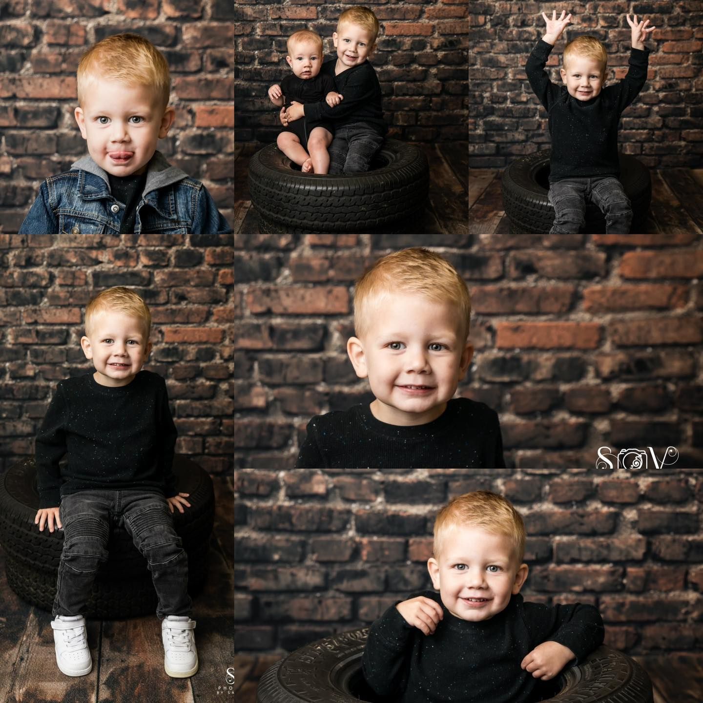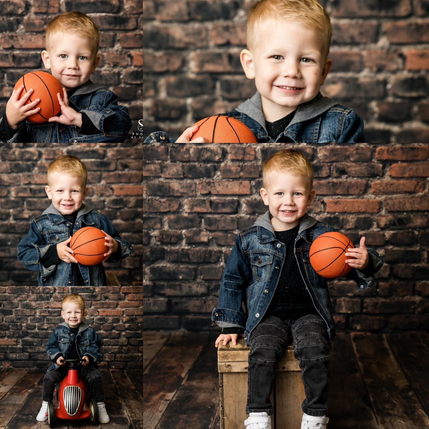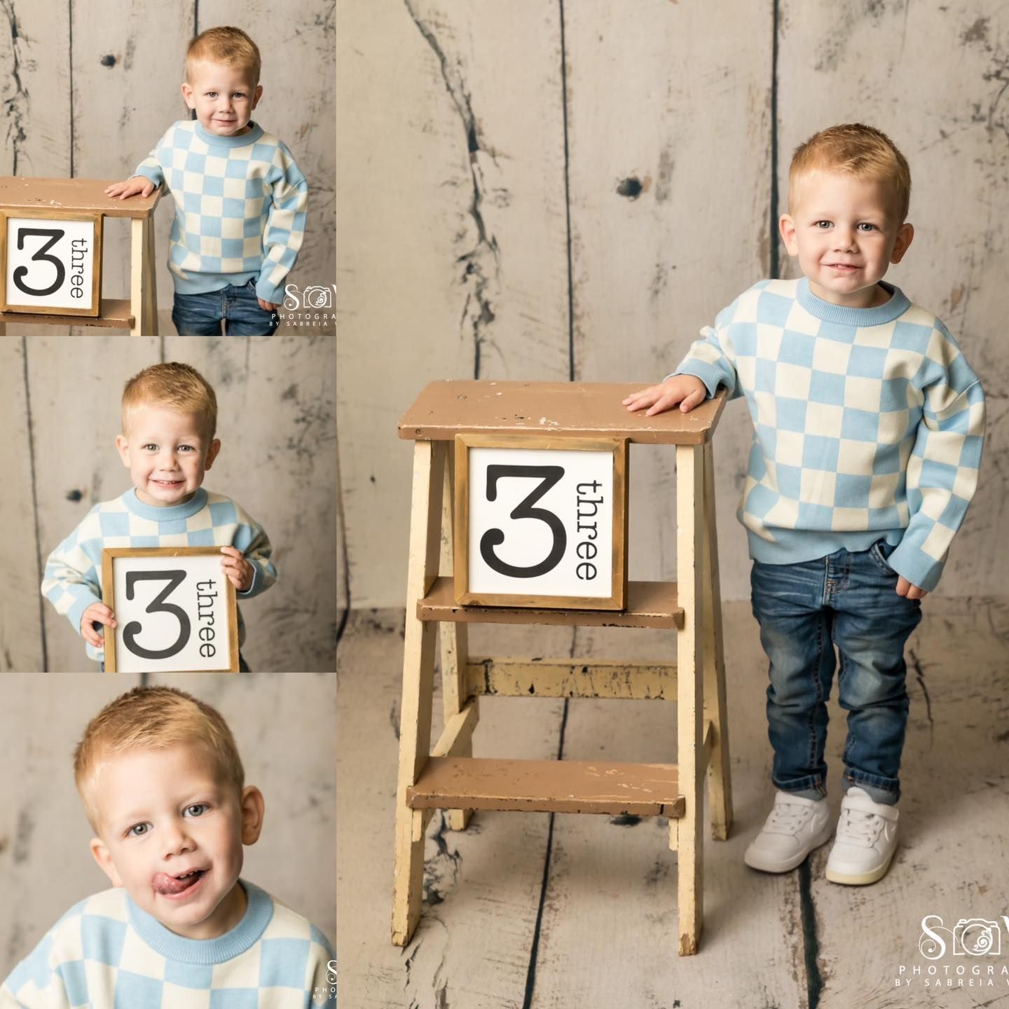 • Toddler on a wooden tricycle, smiling, wearing blue sweater and jeans. Against a blue textured backdrop.