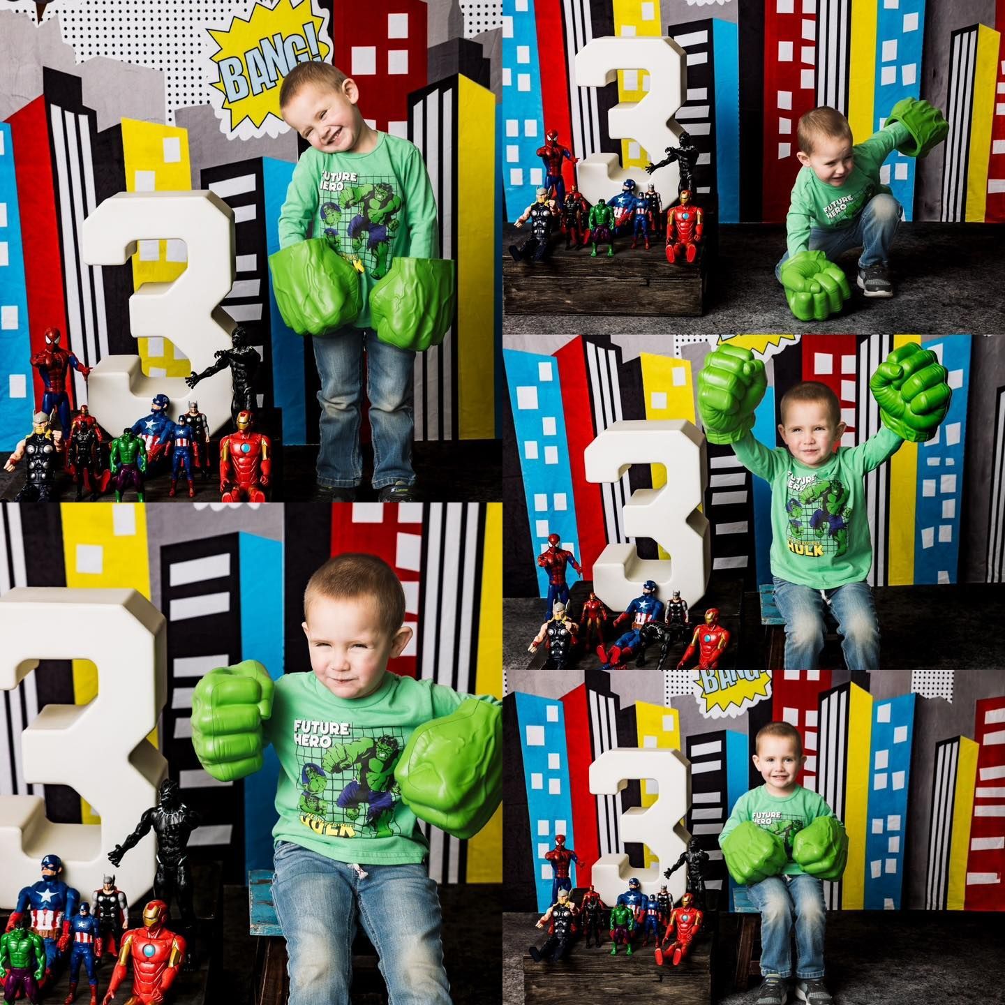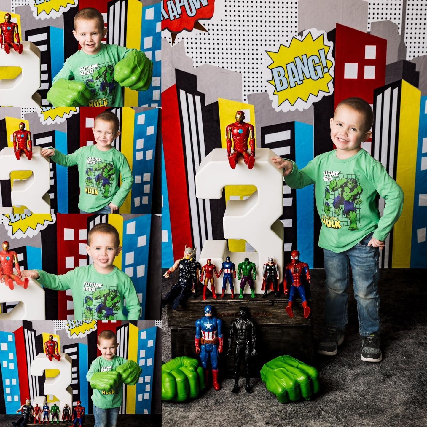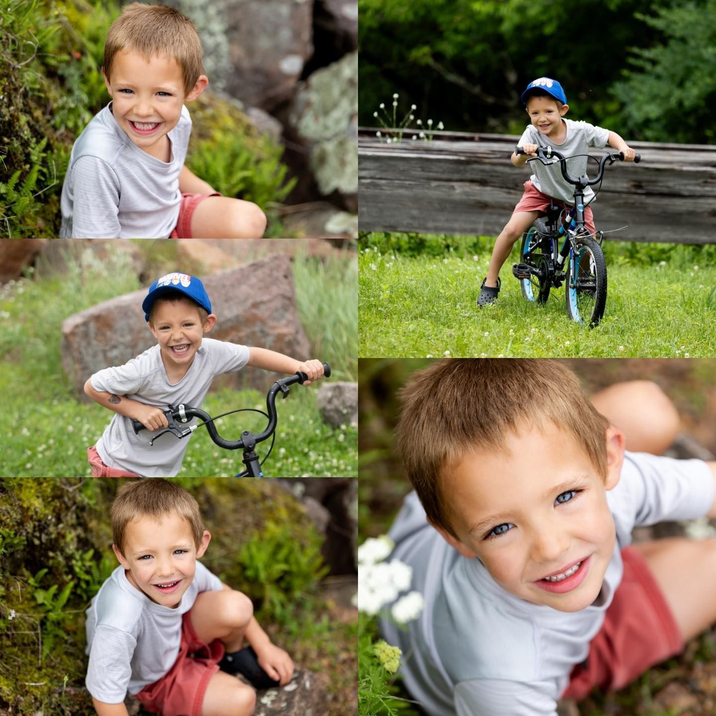 • Toddler on a wooden tricycle, smiling, wearing blue sweater and jeans. Against a blue textured backdrop.