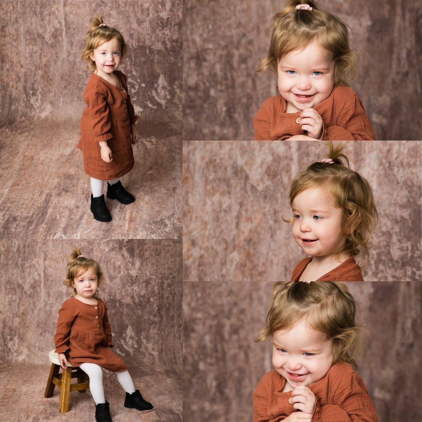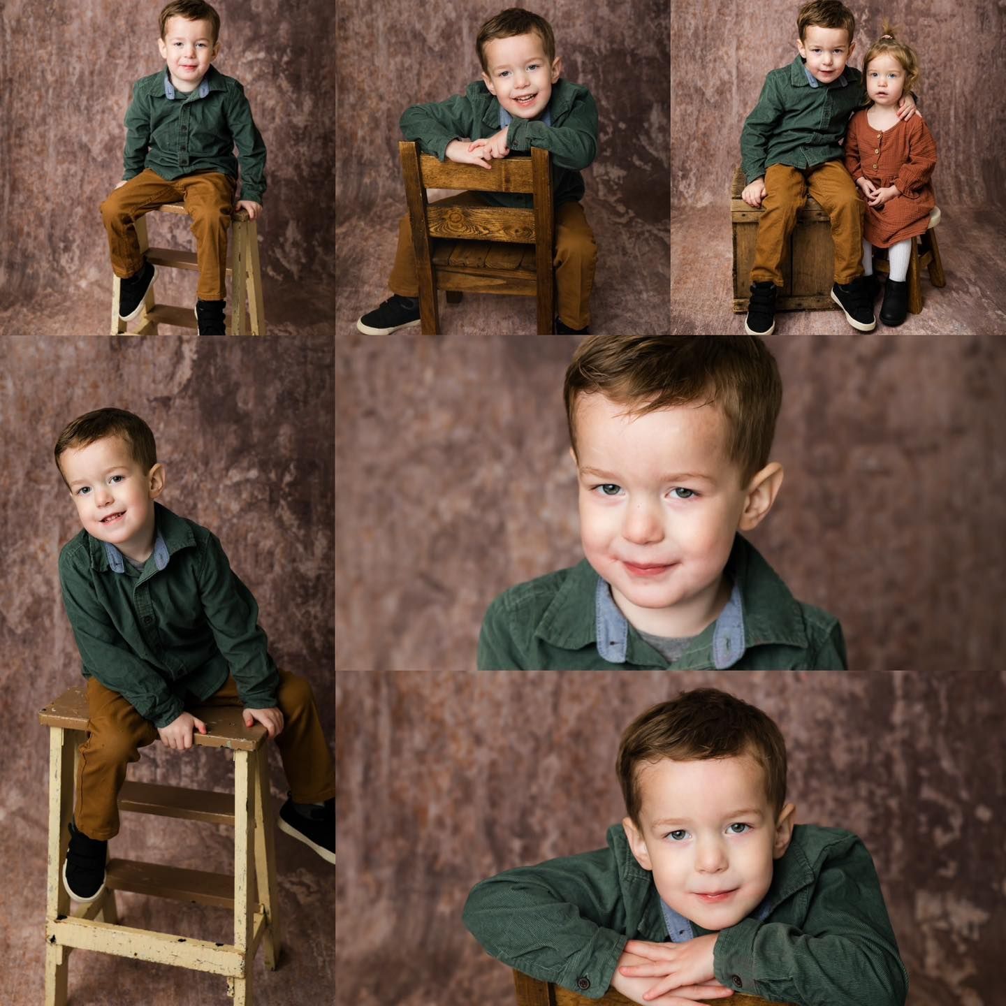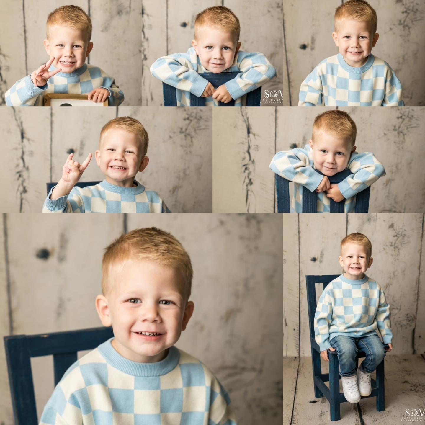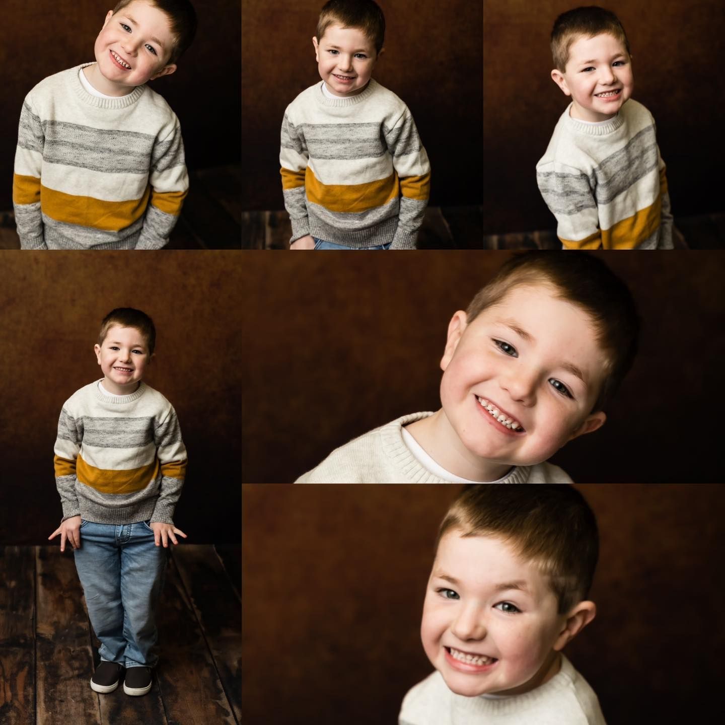 • Smiling toddler in plaid shirt, brown hair, against a light brown backdrop.