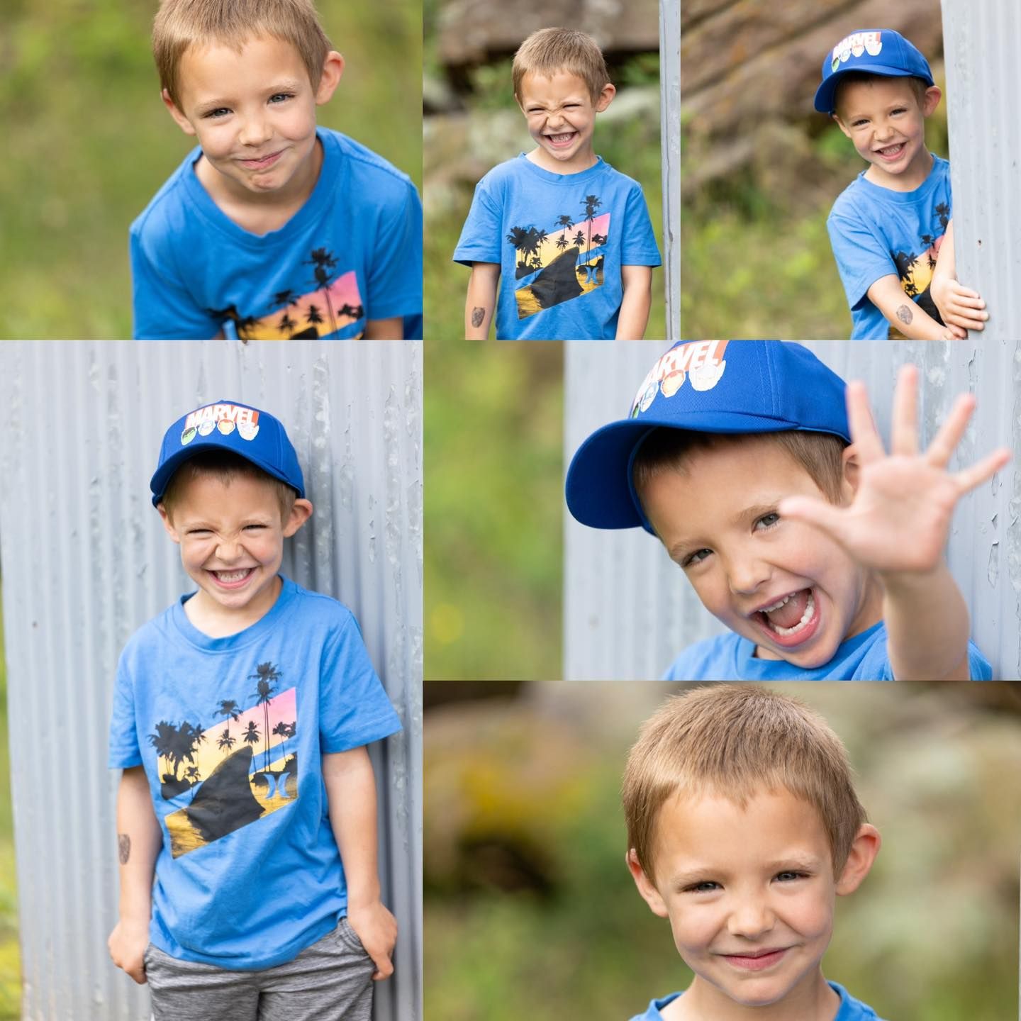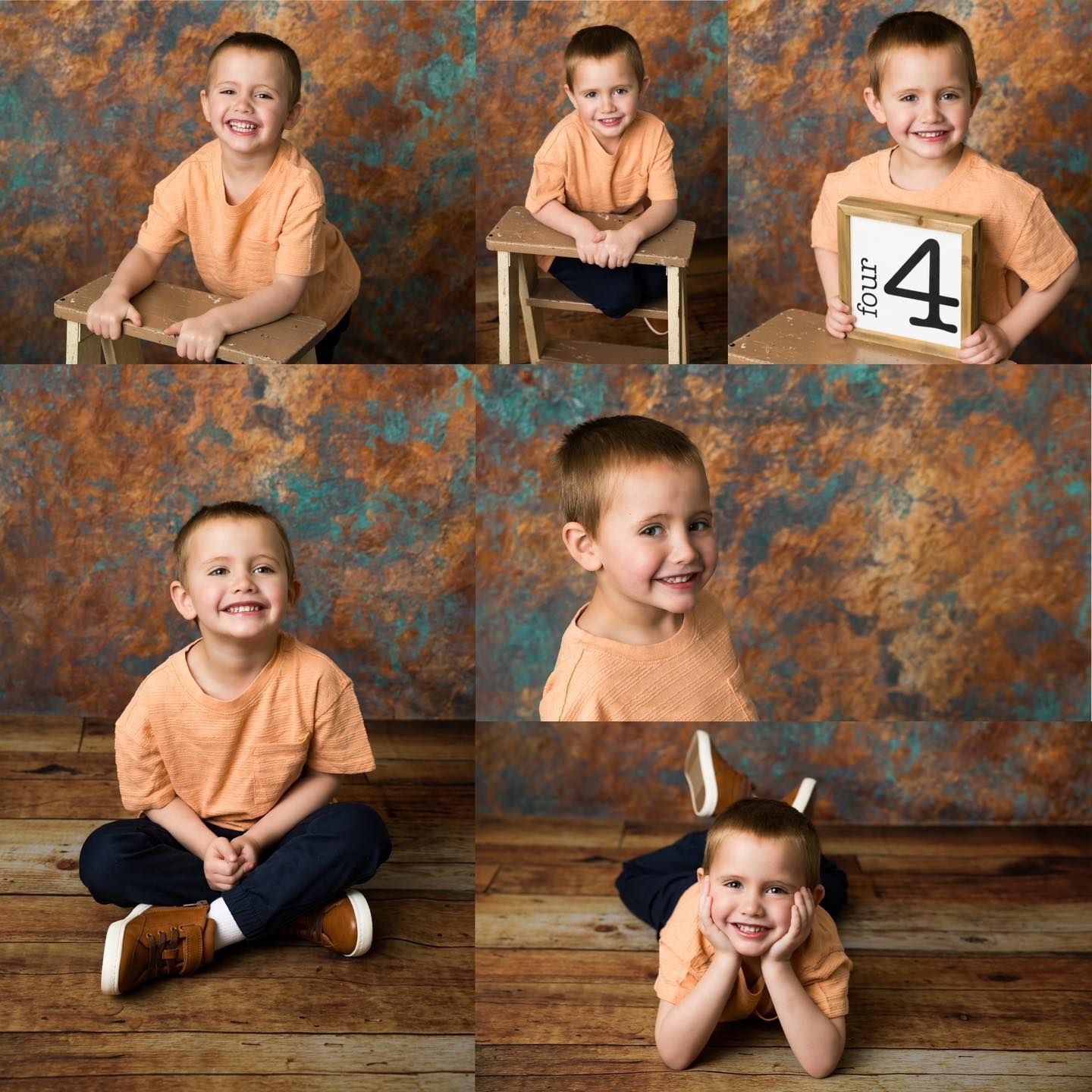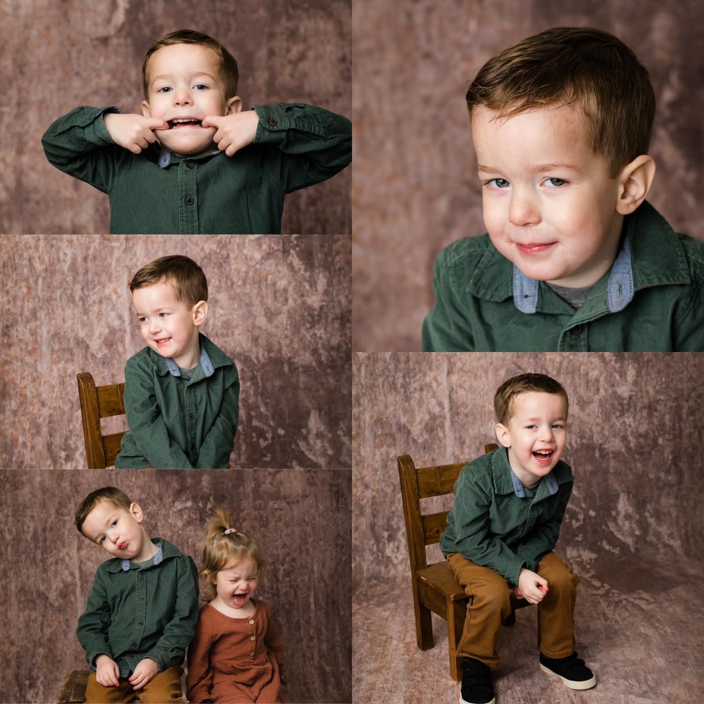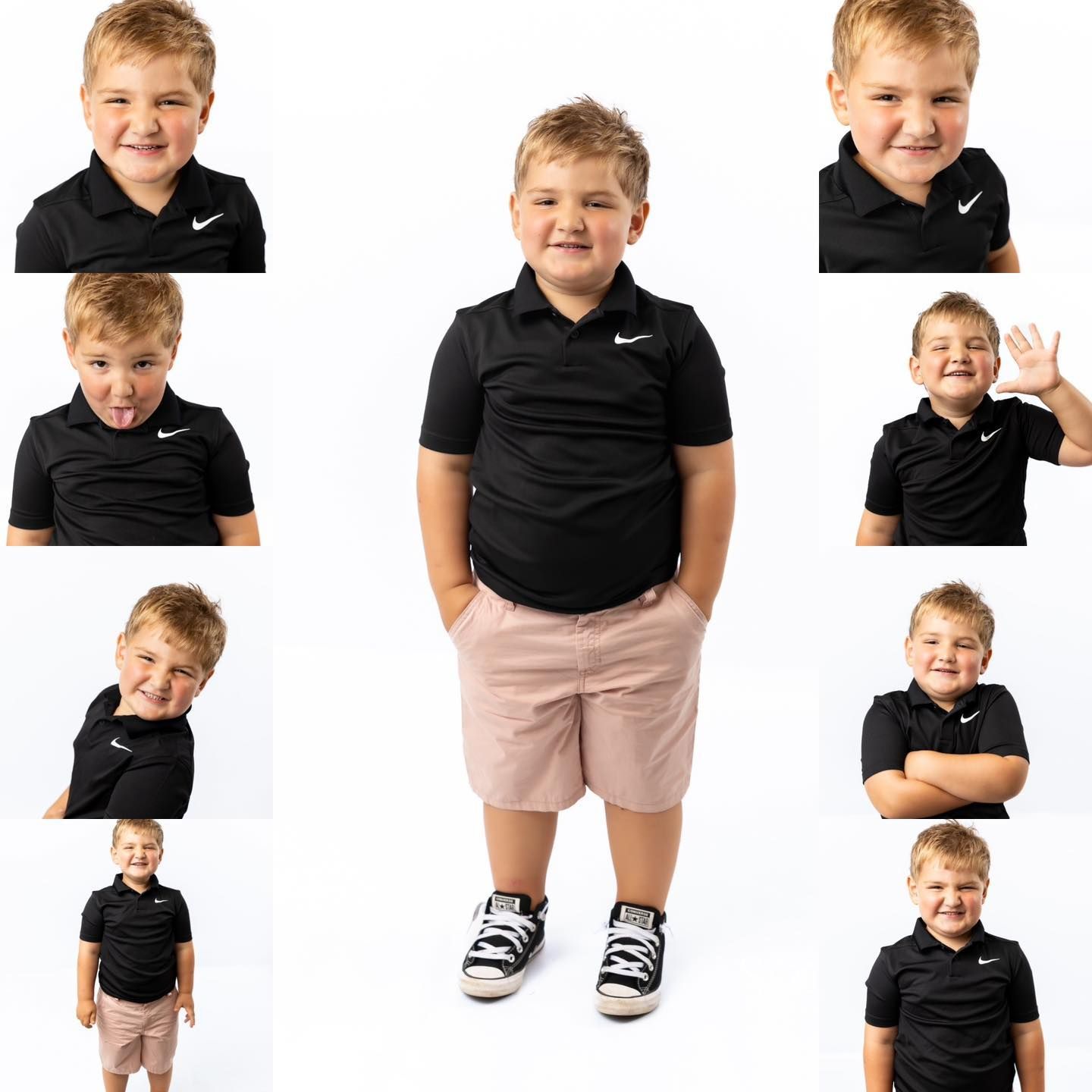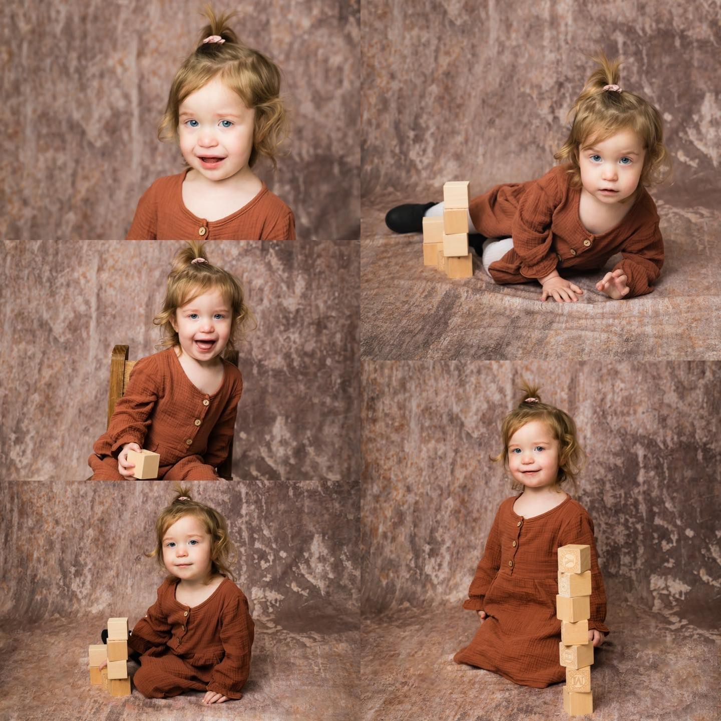 • Smiling toddler in plaid shirt, brown hair, against a light brown backdrop.