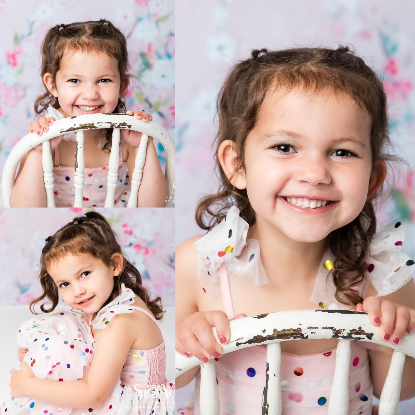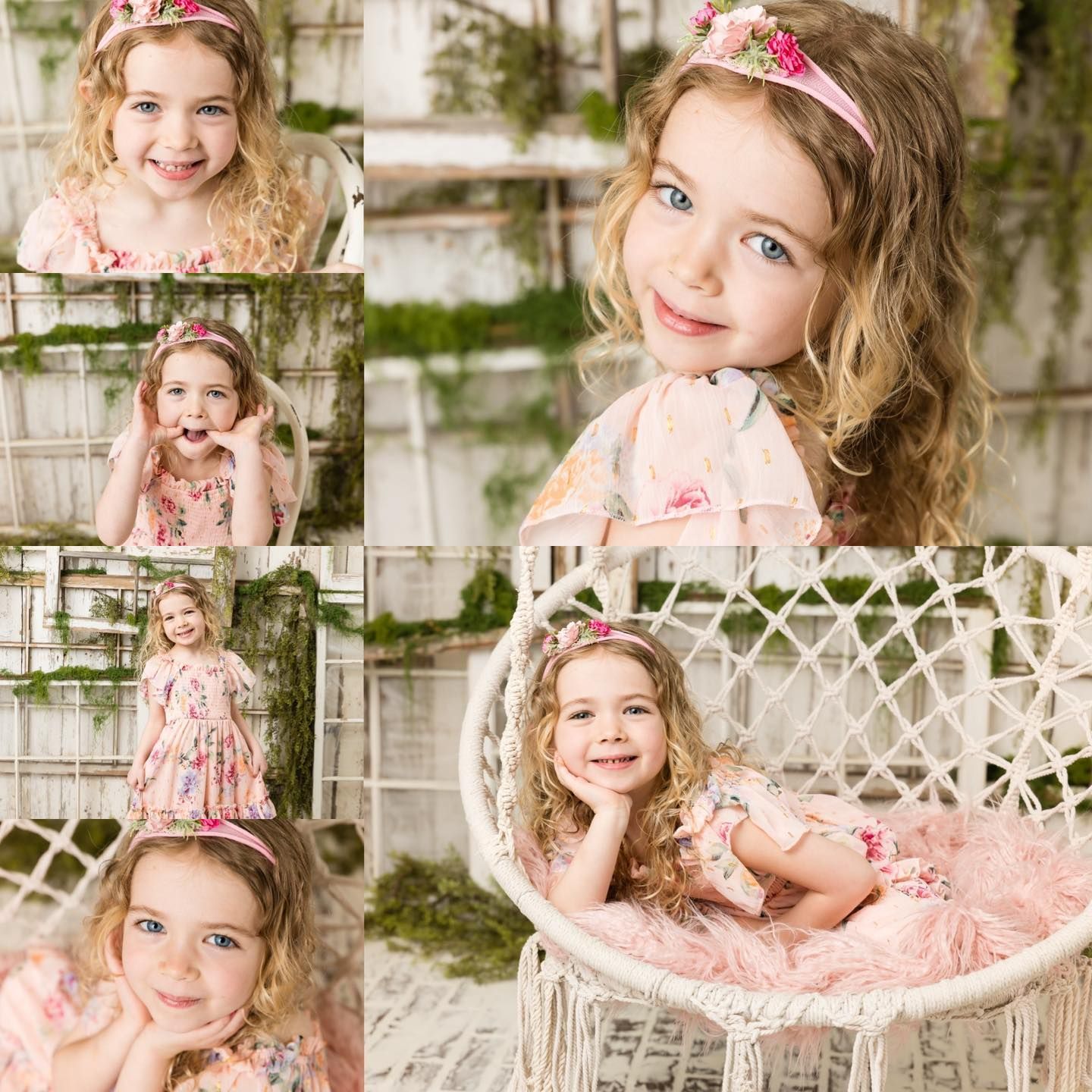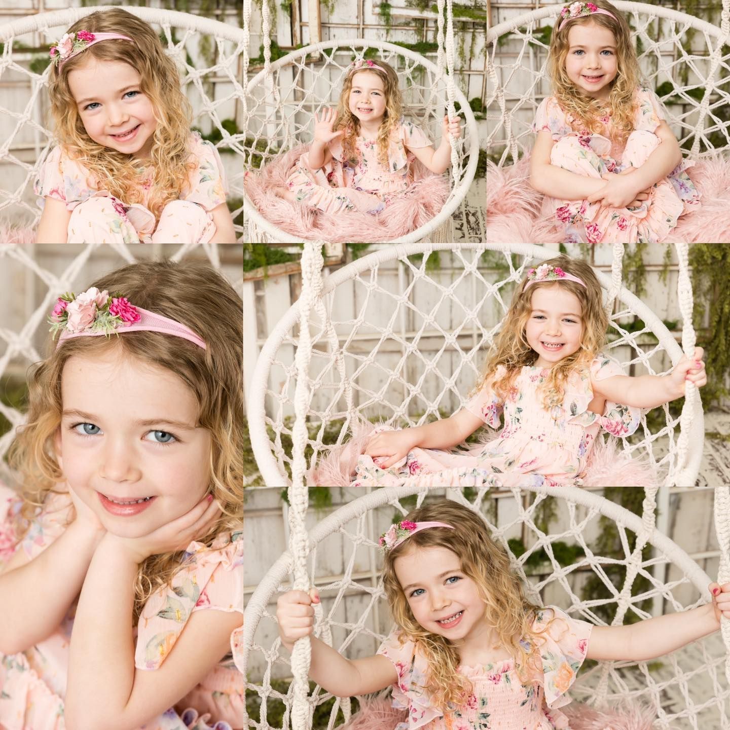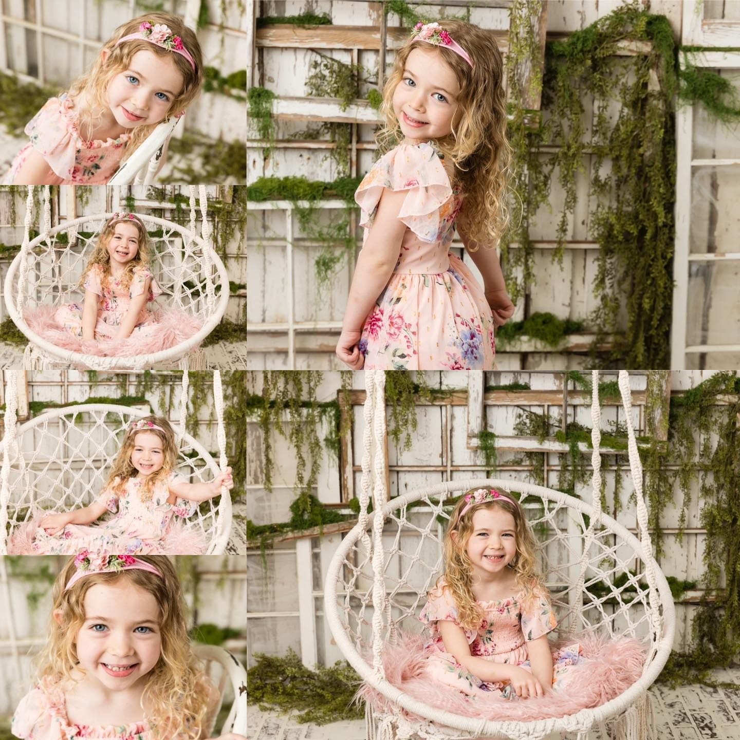 • Young girl with blue eyes smiles, seated on a swing, in front of a green floral backdrop.