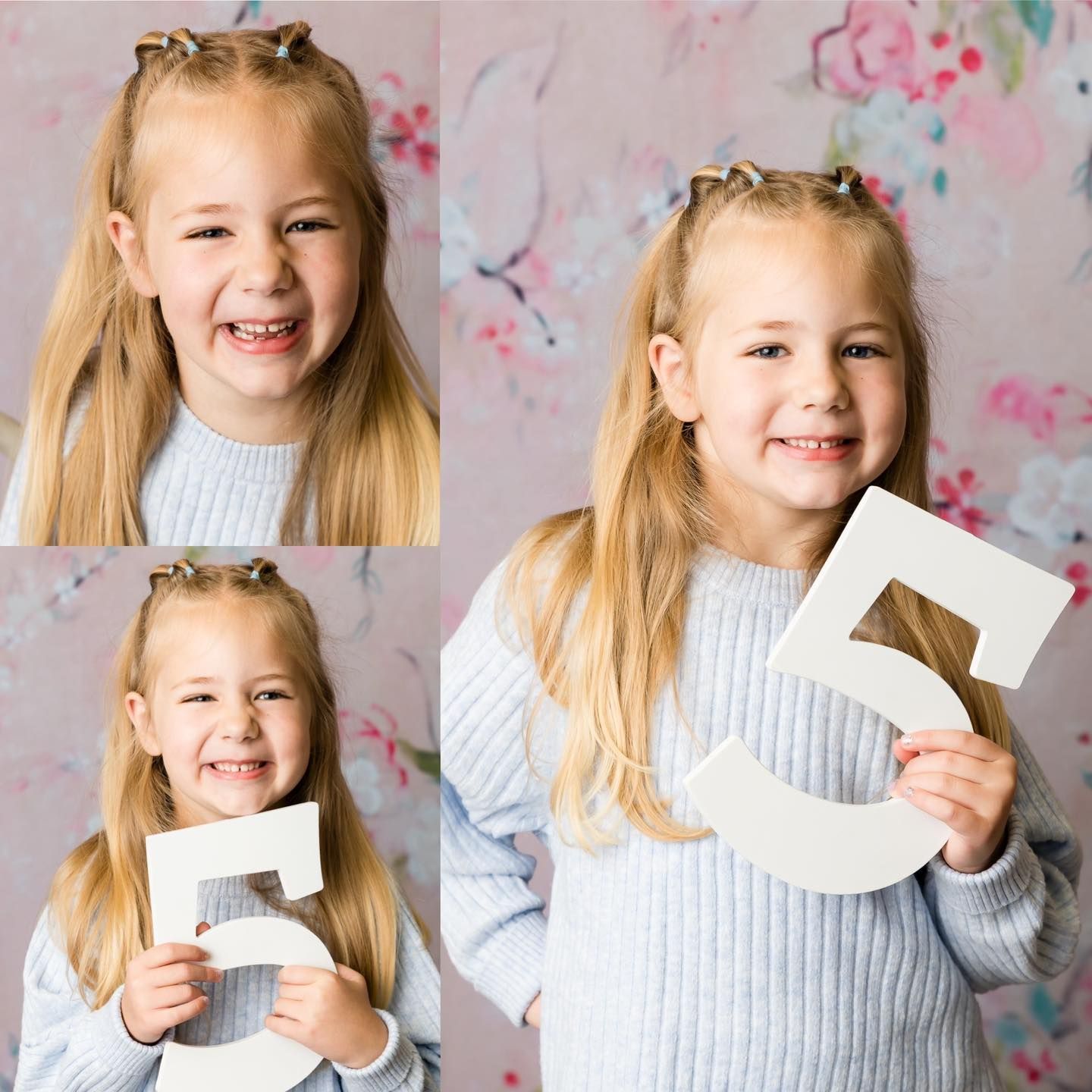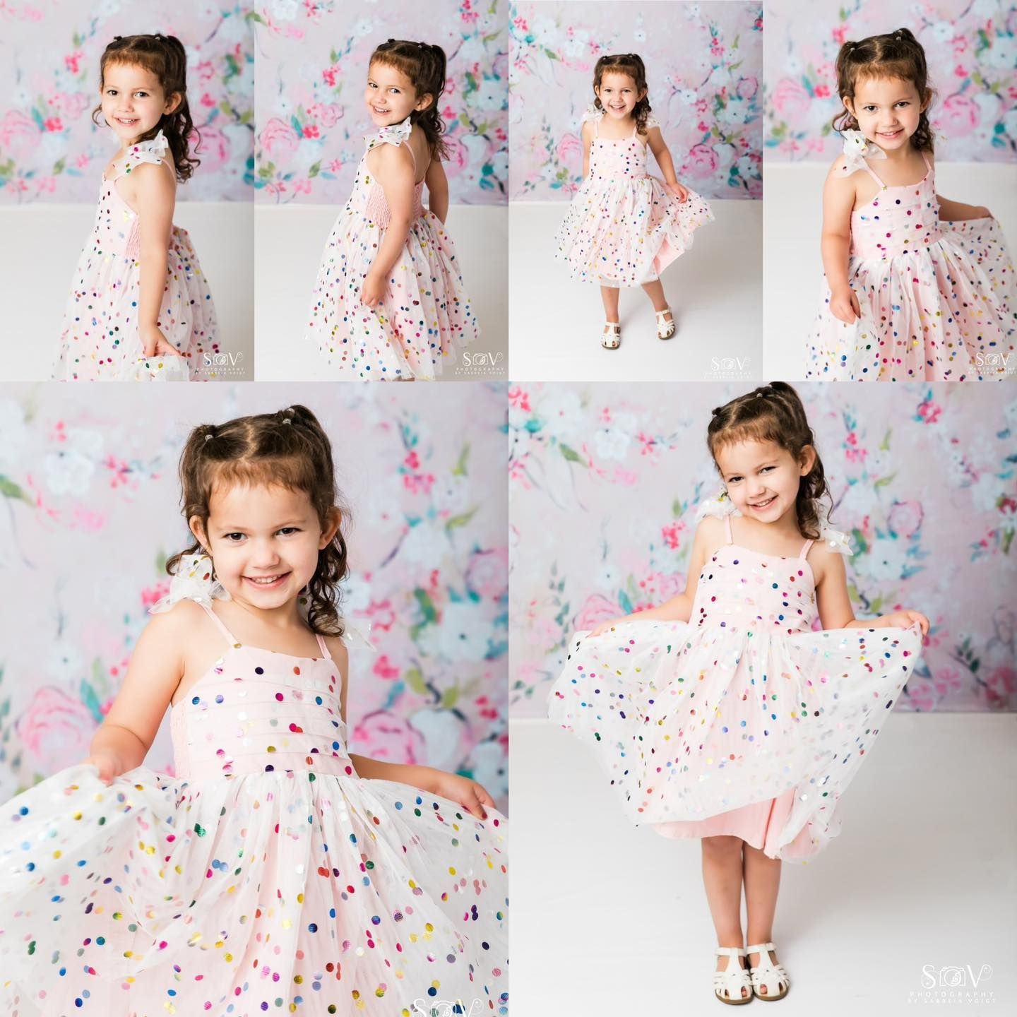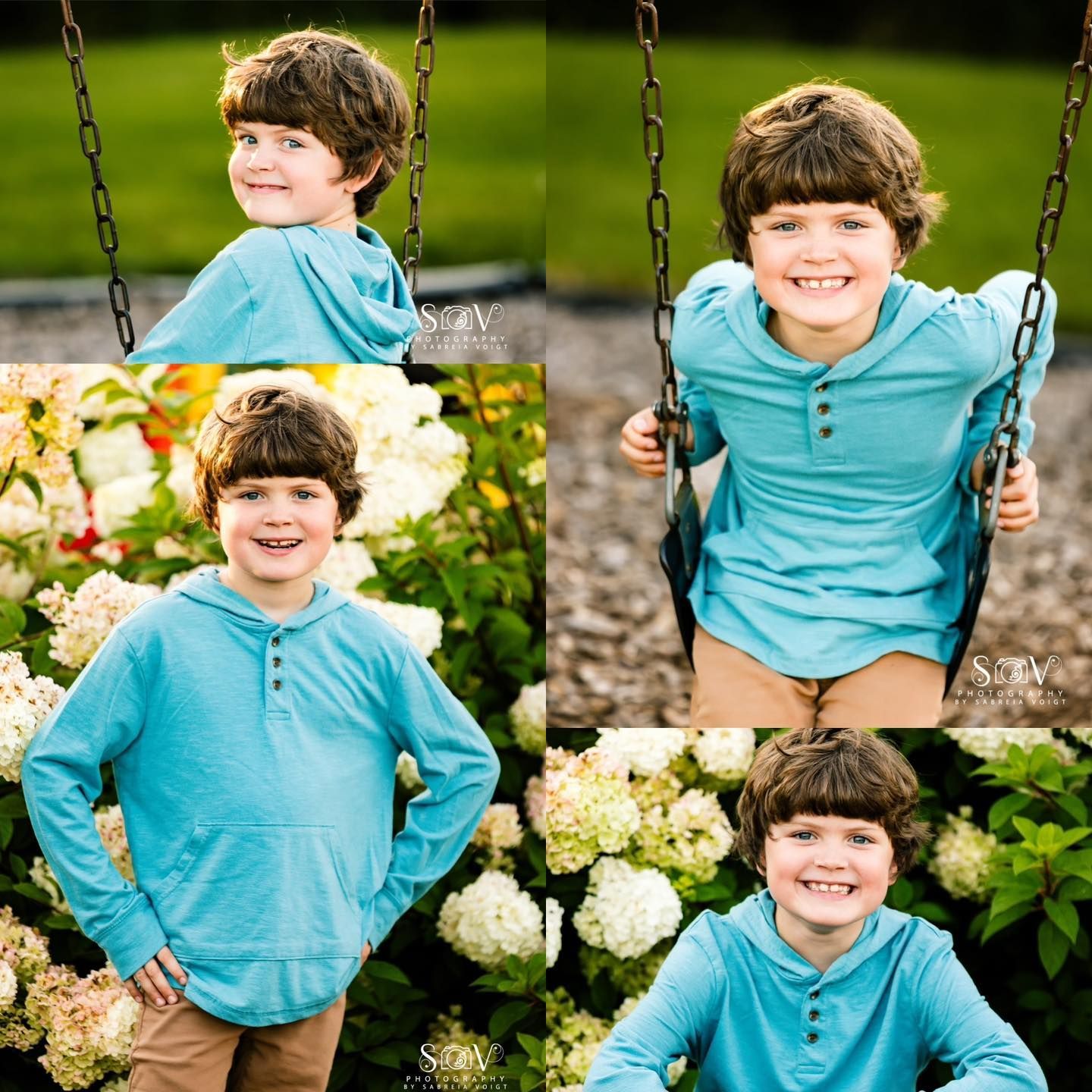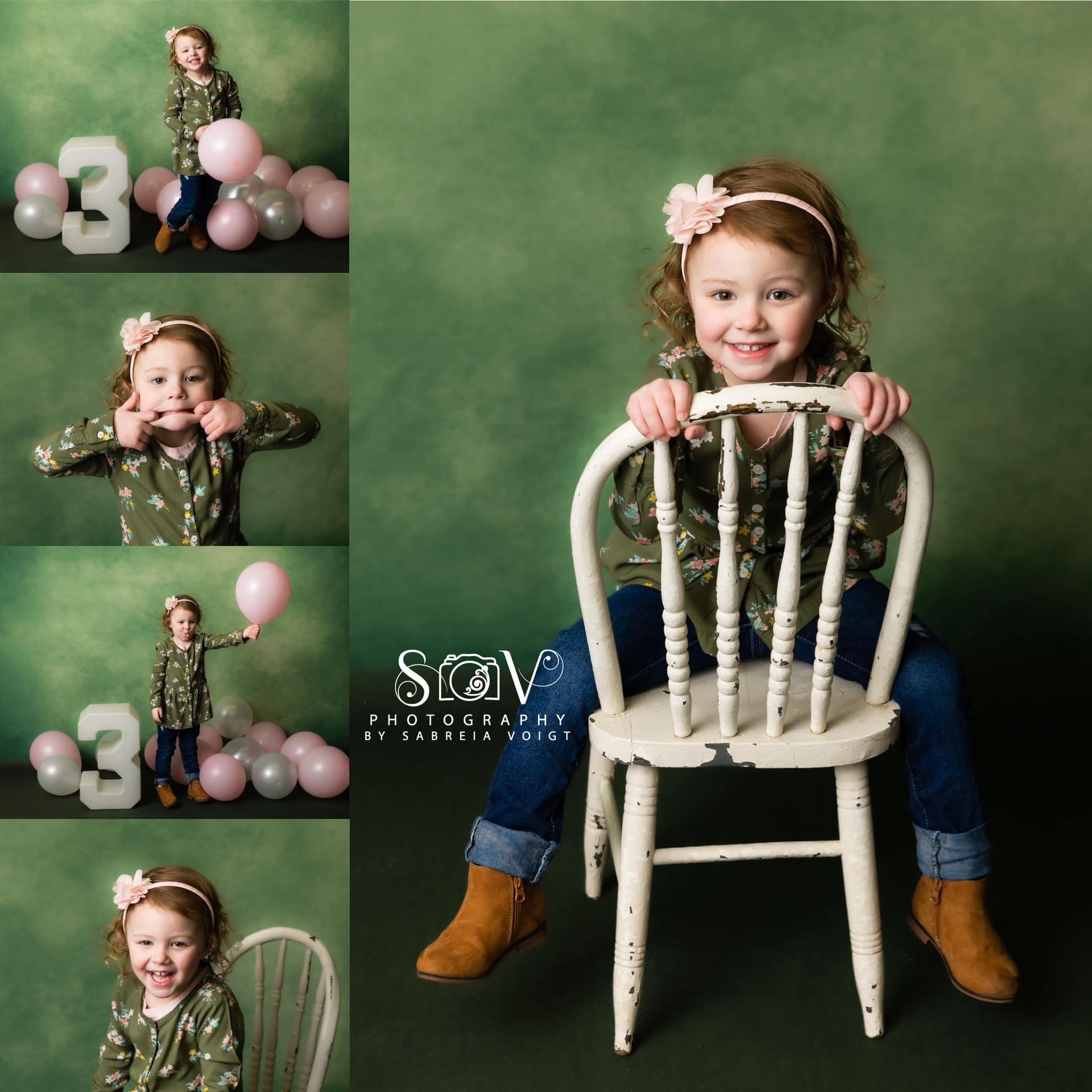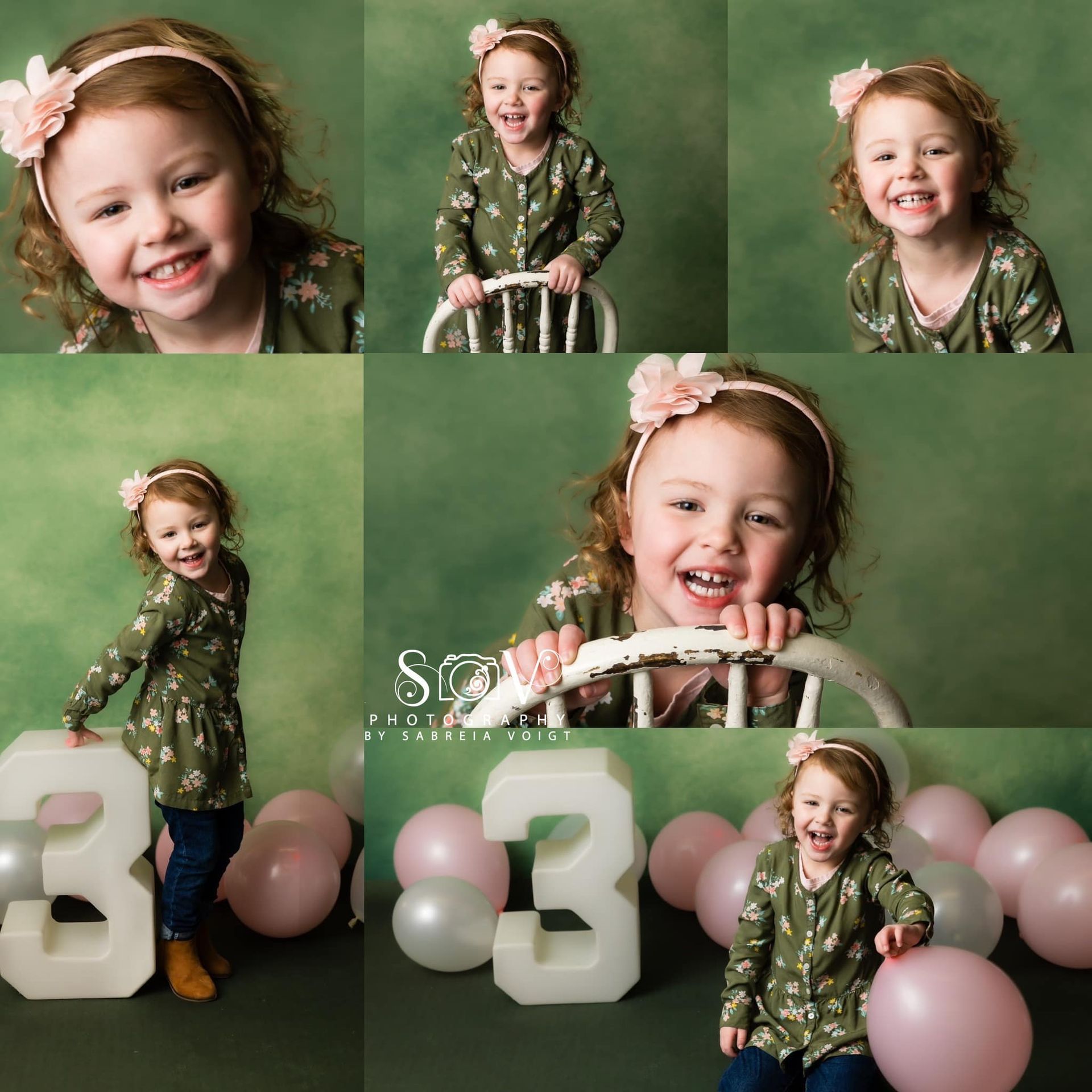 • Young girl with blue eyes smiles, seated on a swing, in front of a green floral backdrop.