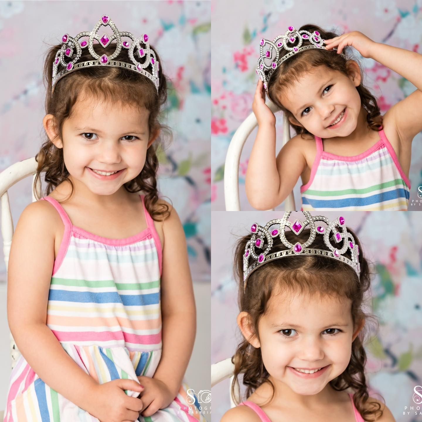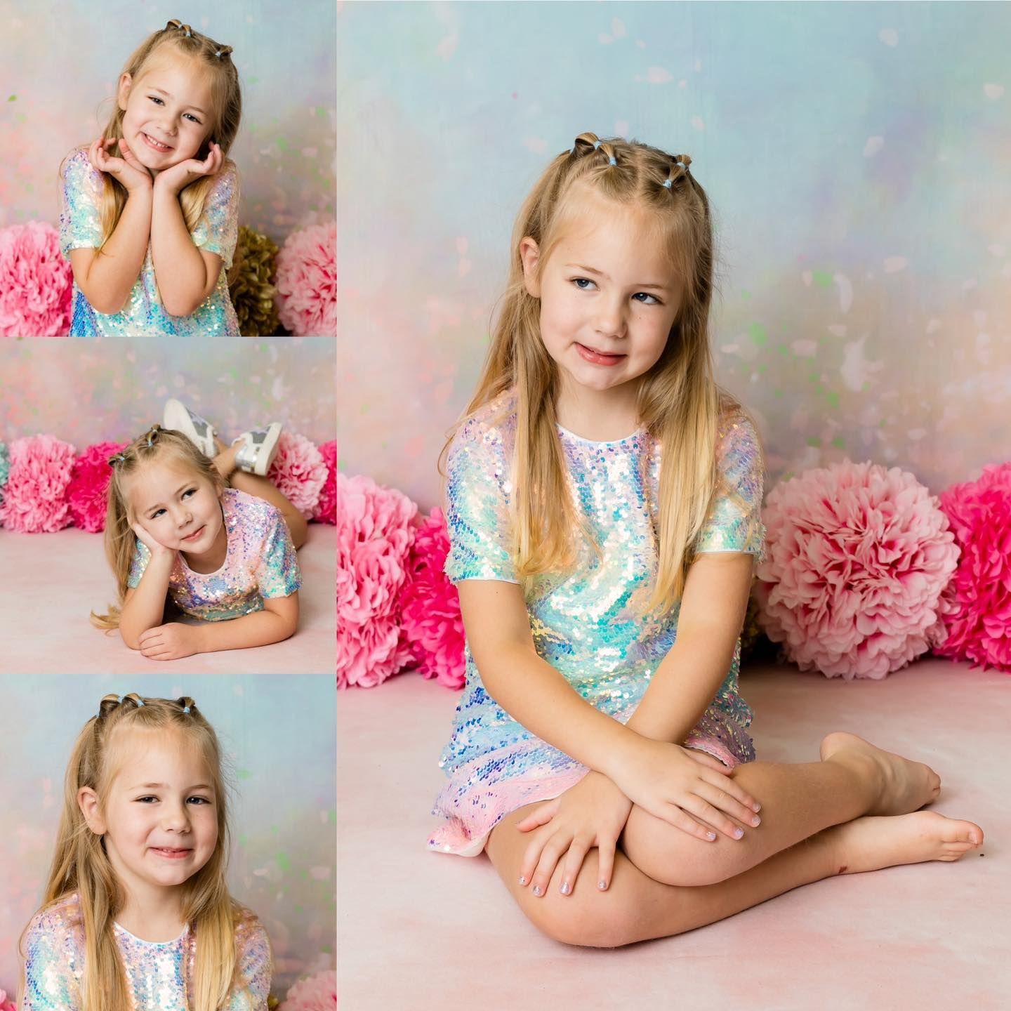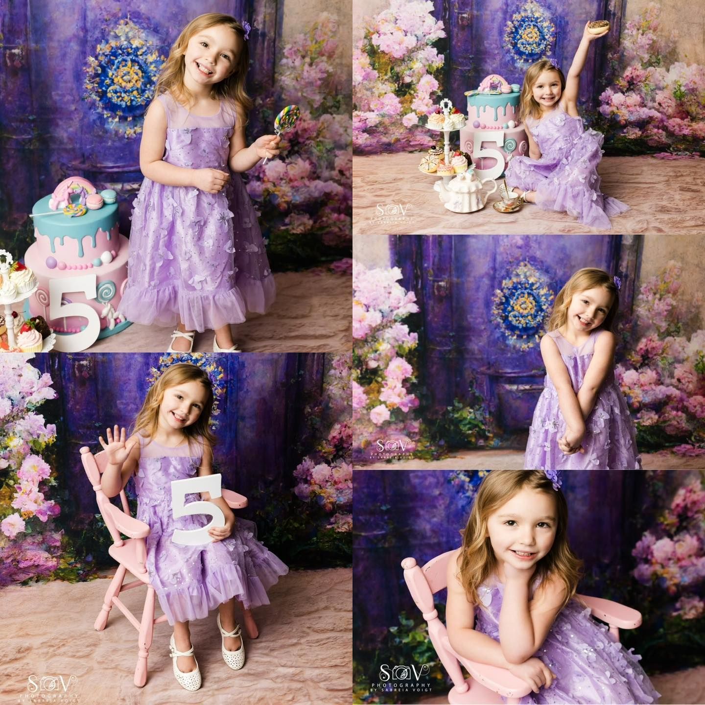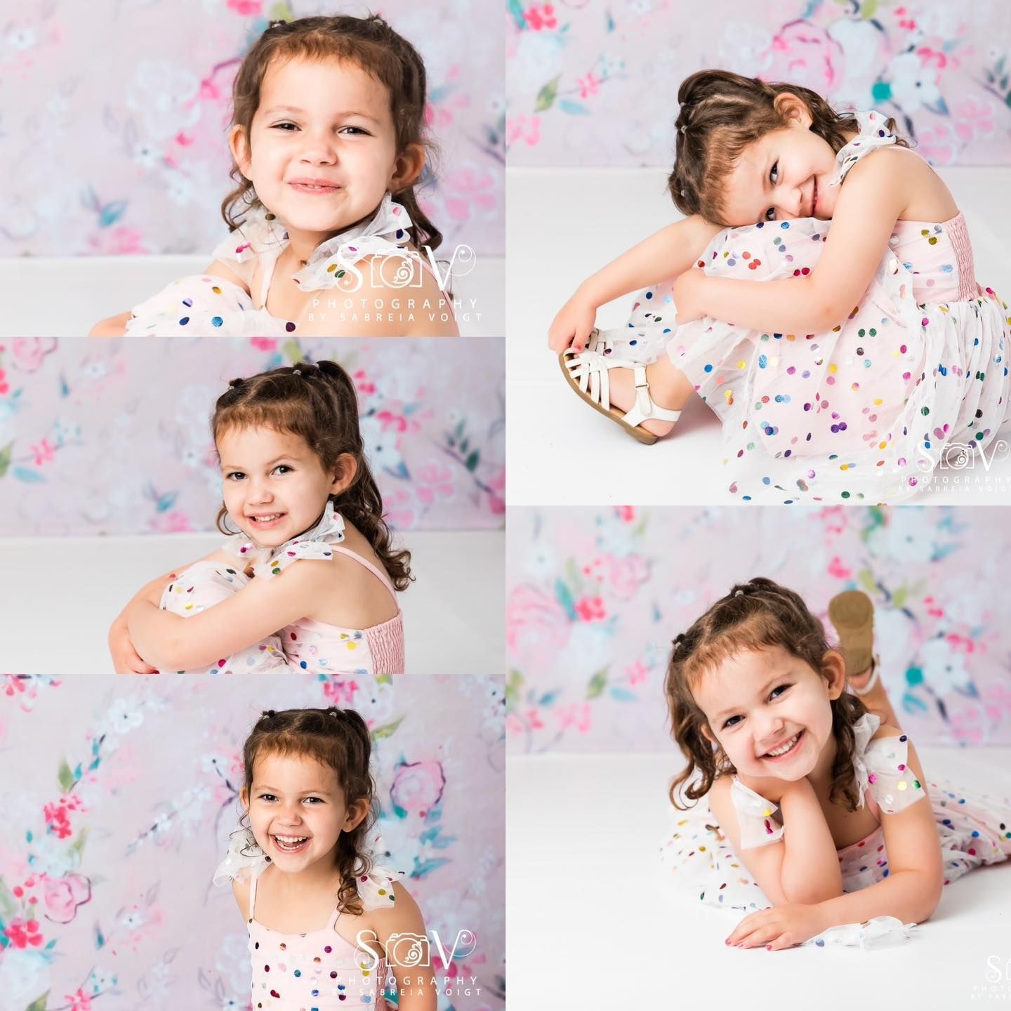 • Young girl with blue eyes smiles, seated on a swing, in front of a green floral backdrop.