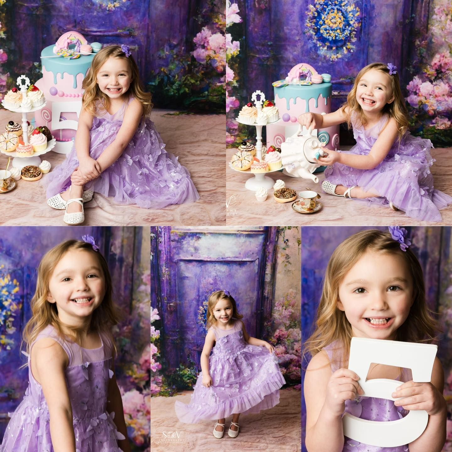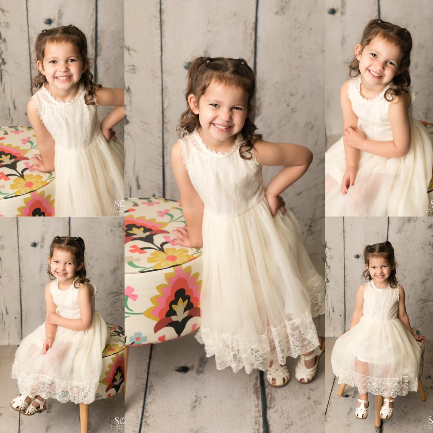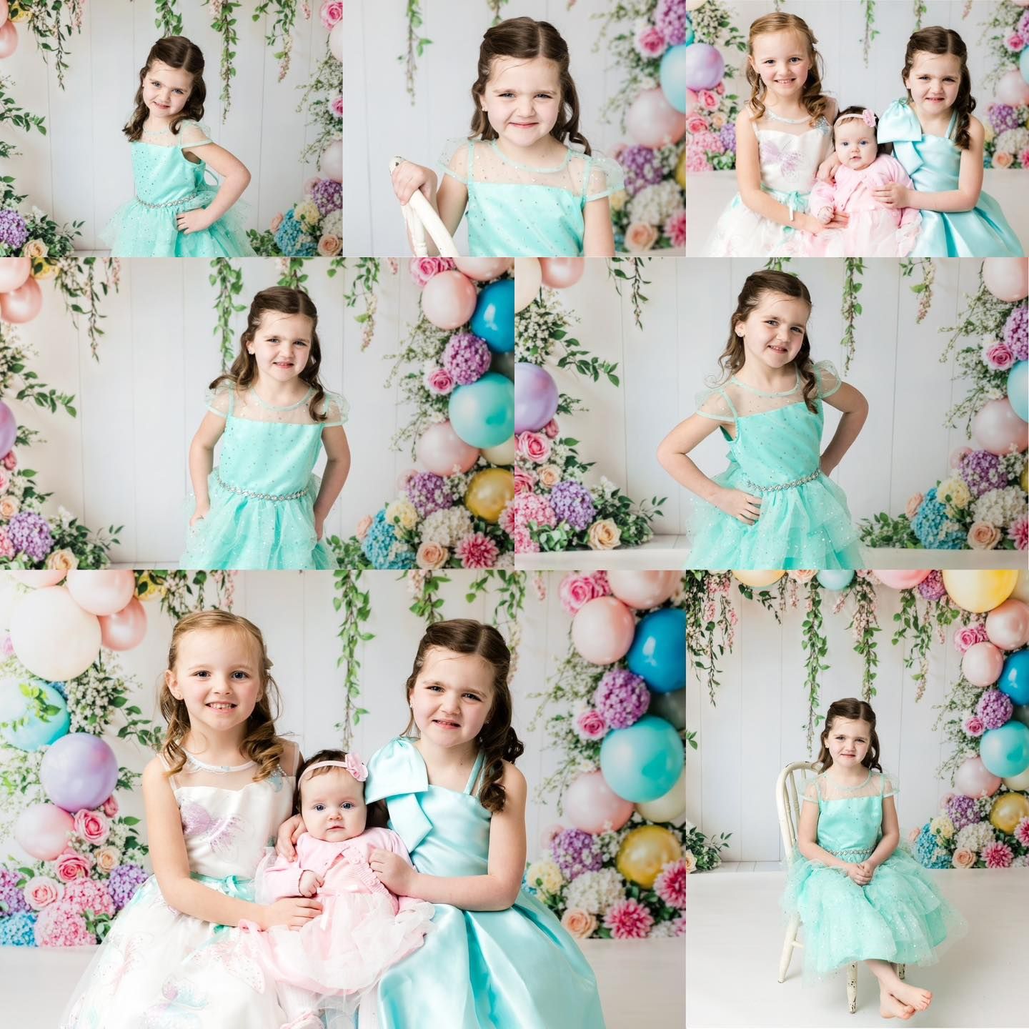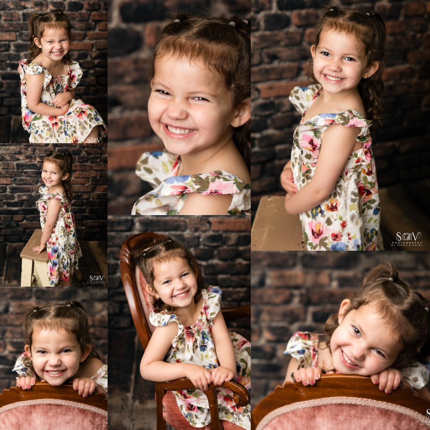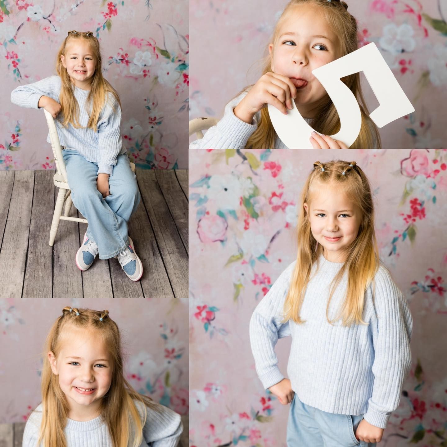 • Young girl with blue eyes smiles, seated on a swing, in front of a green floral backdrop.