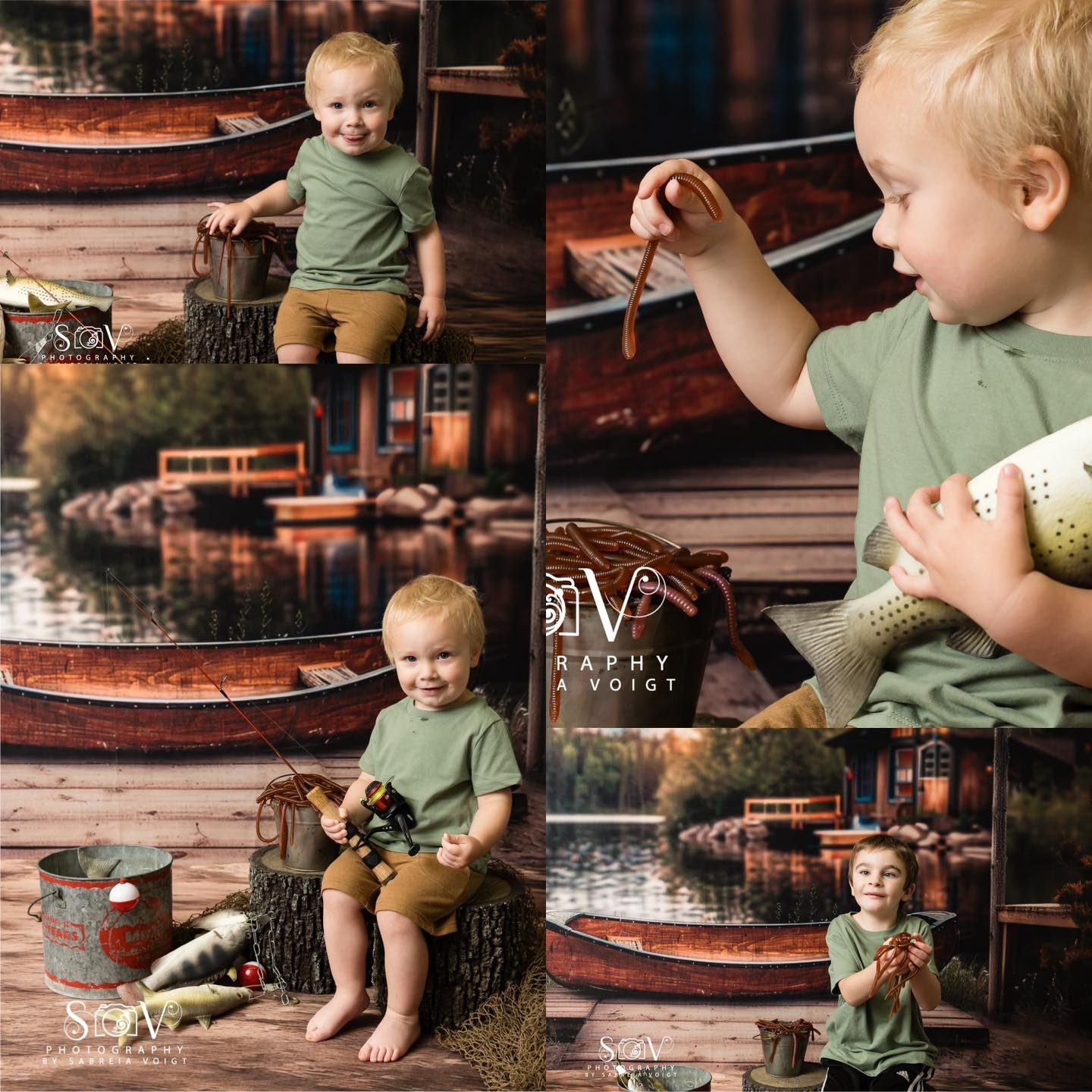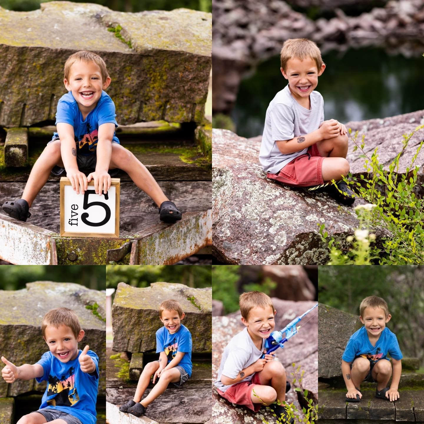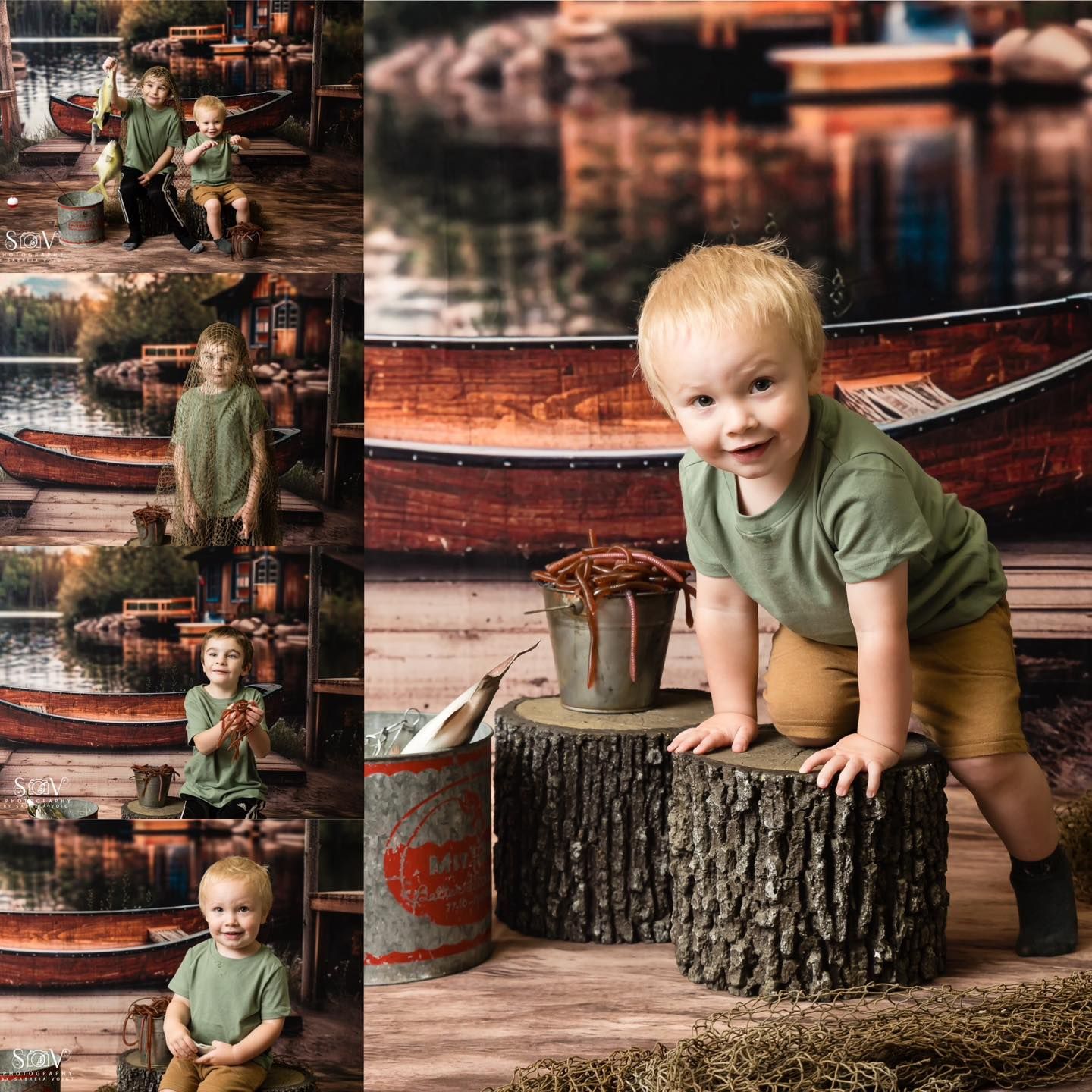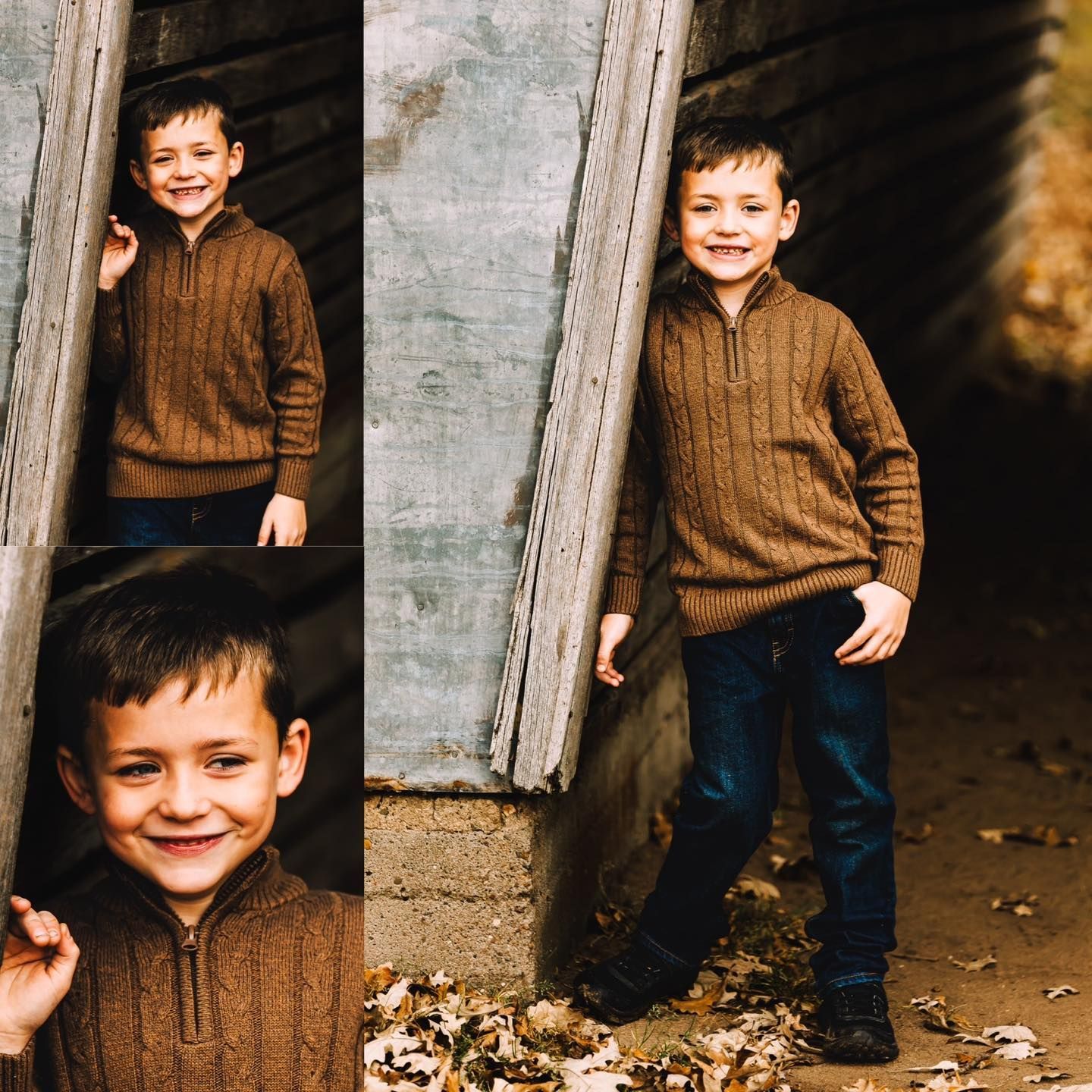 • Boy in plaid shirt and jeans, smiling, sitting on a wooden crate.