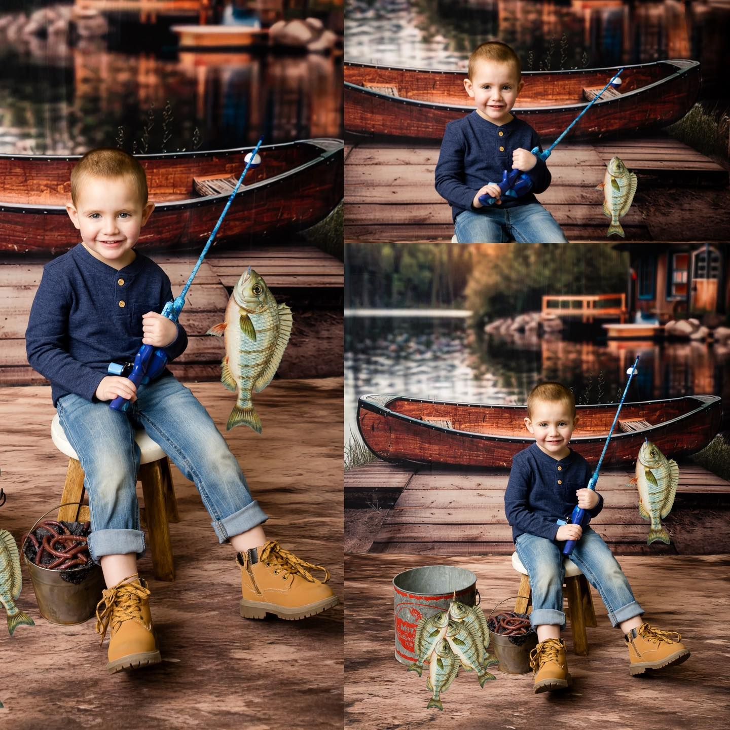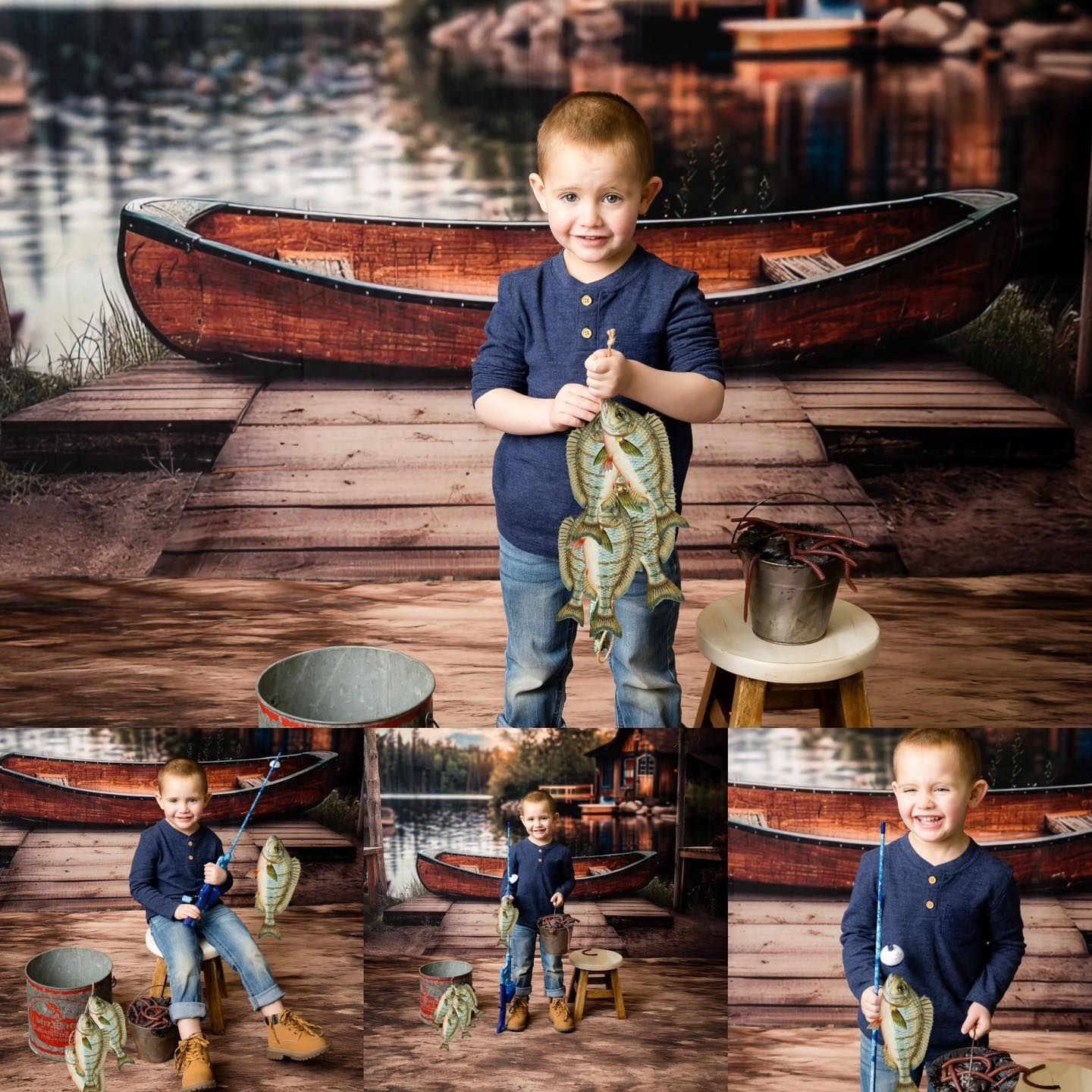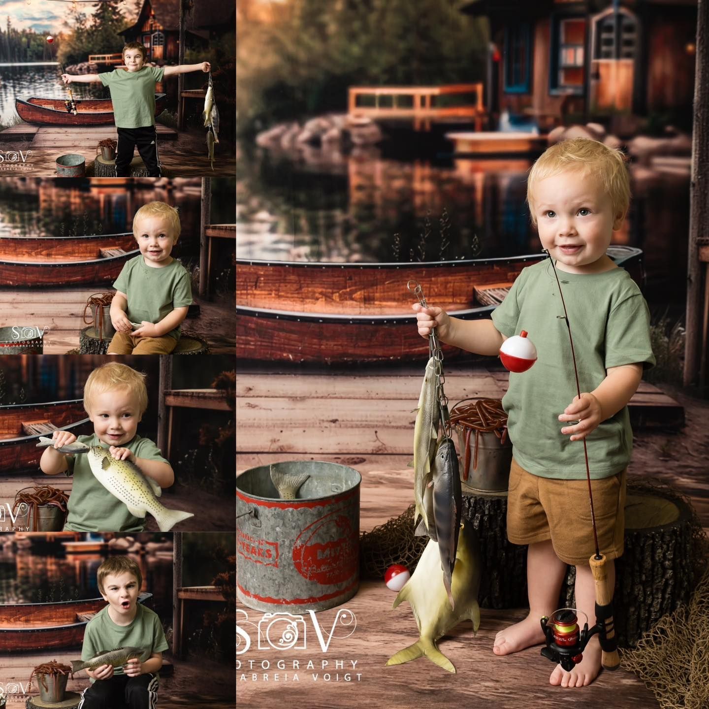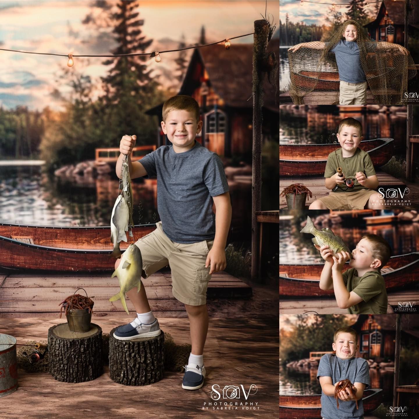 • Boy in plaid shirt and jeans, smiling, sitting on a wooden crate.
