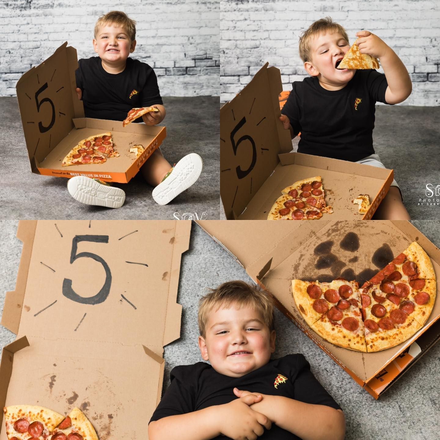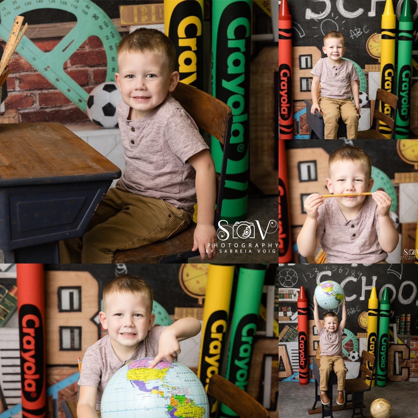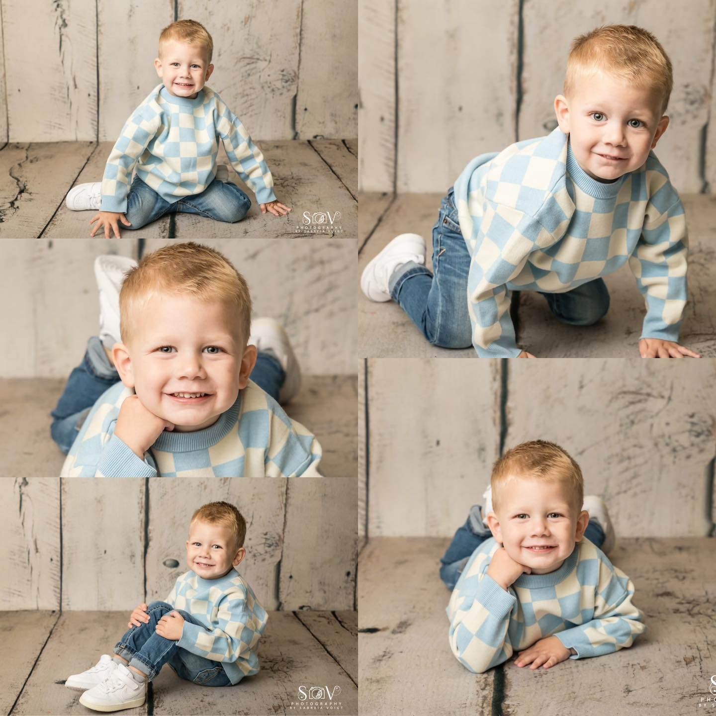 • Boy smiles, posed on a wooden box, wearing a navy blue shirt and jeans; blue background.