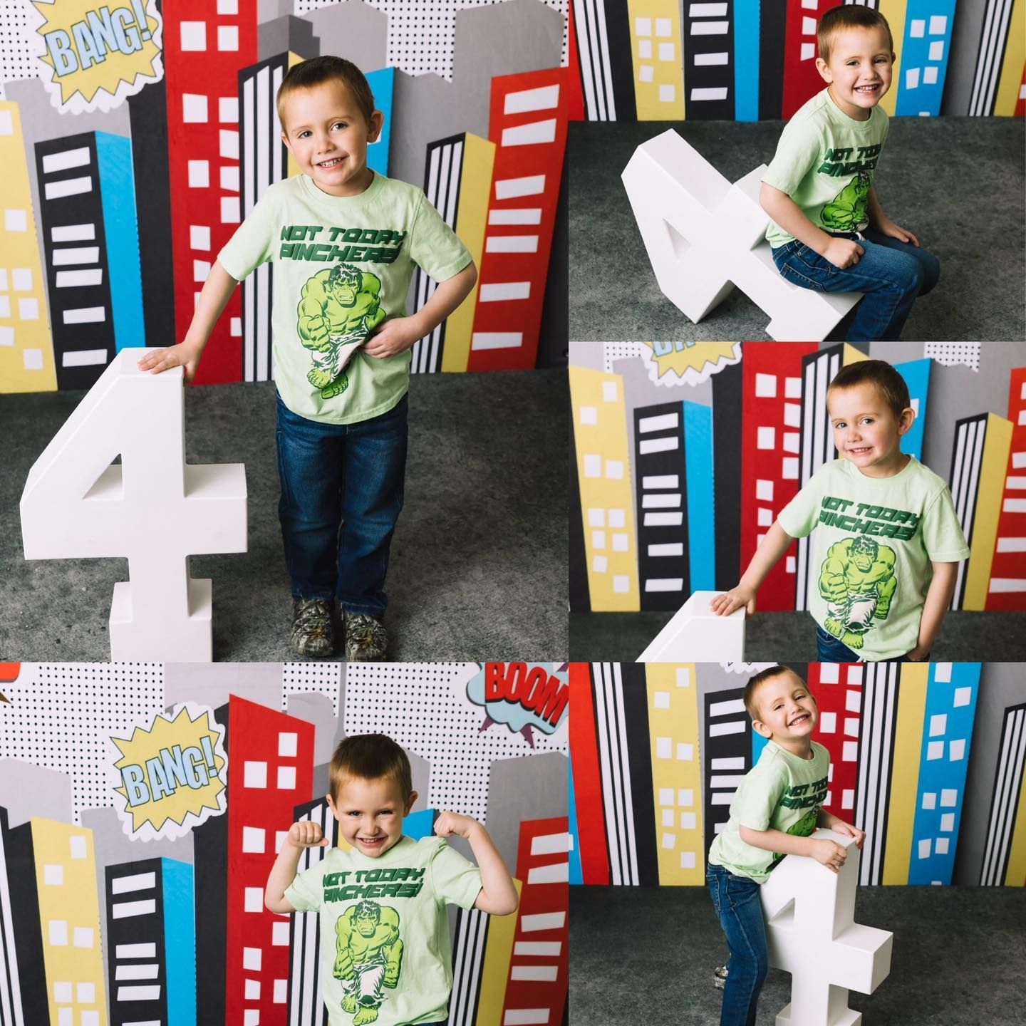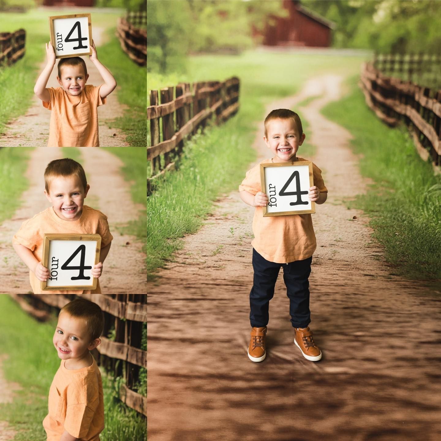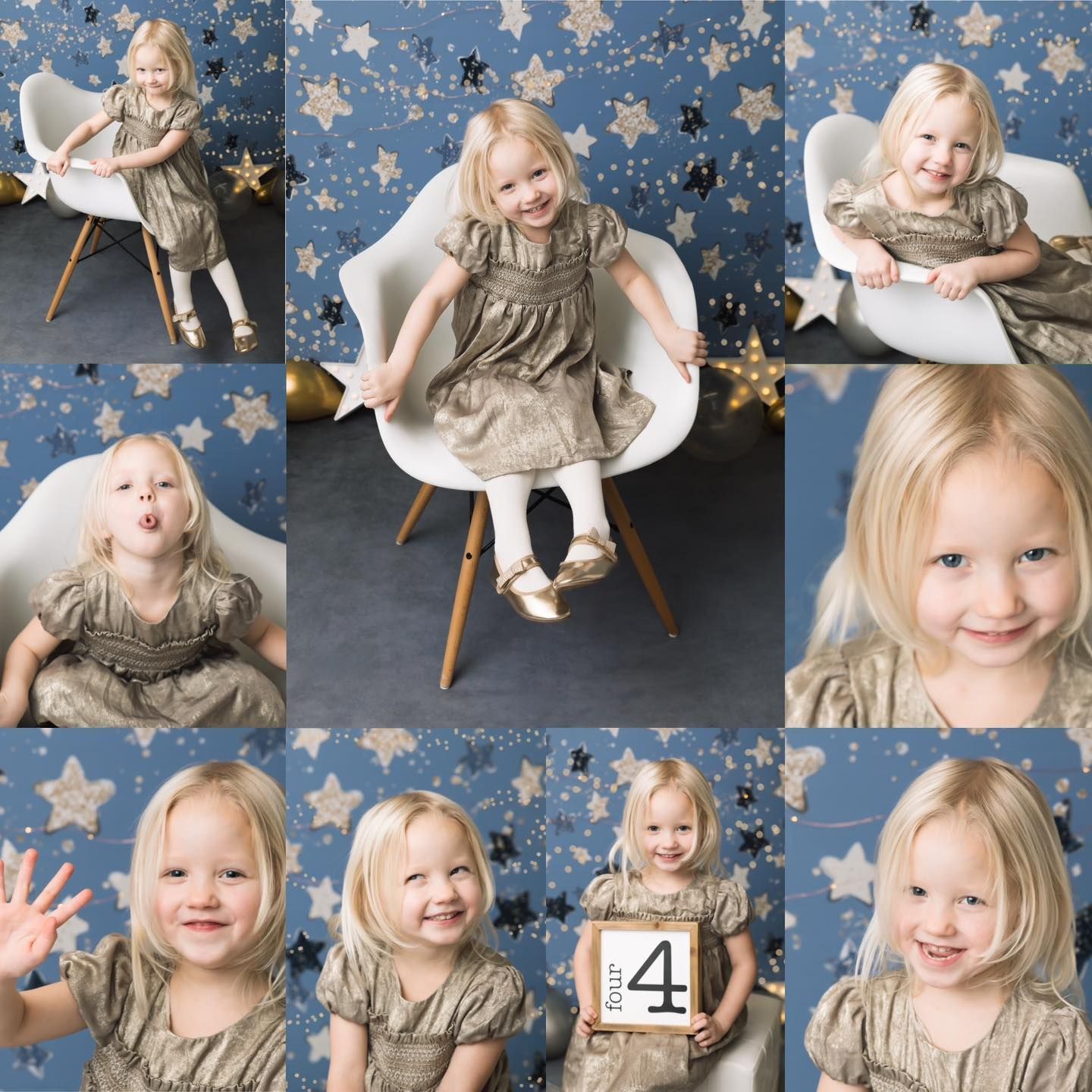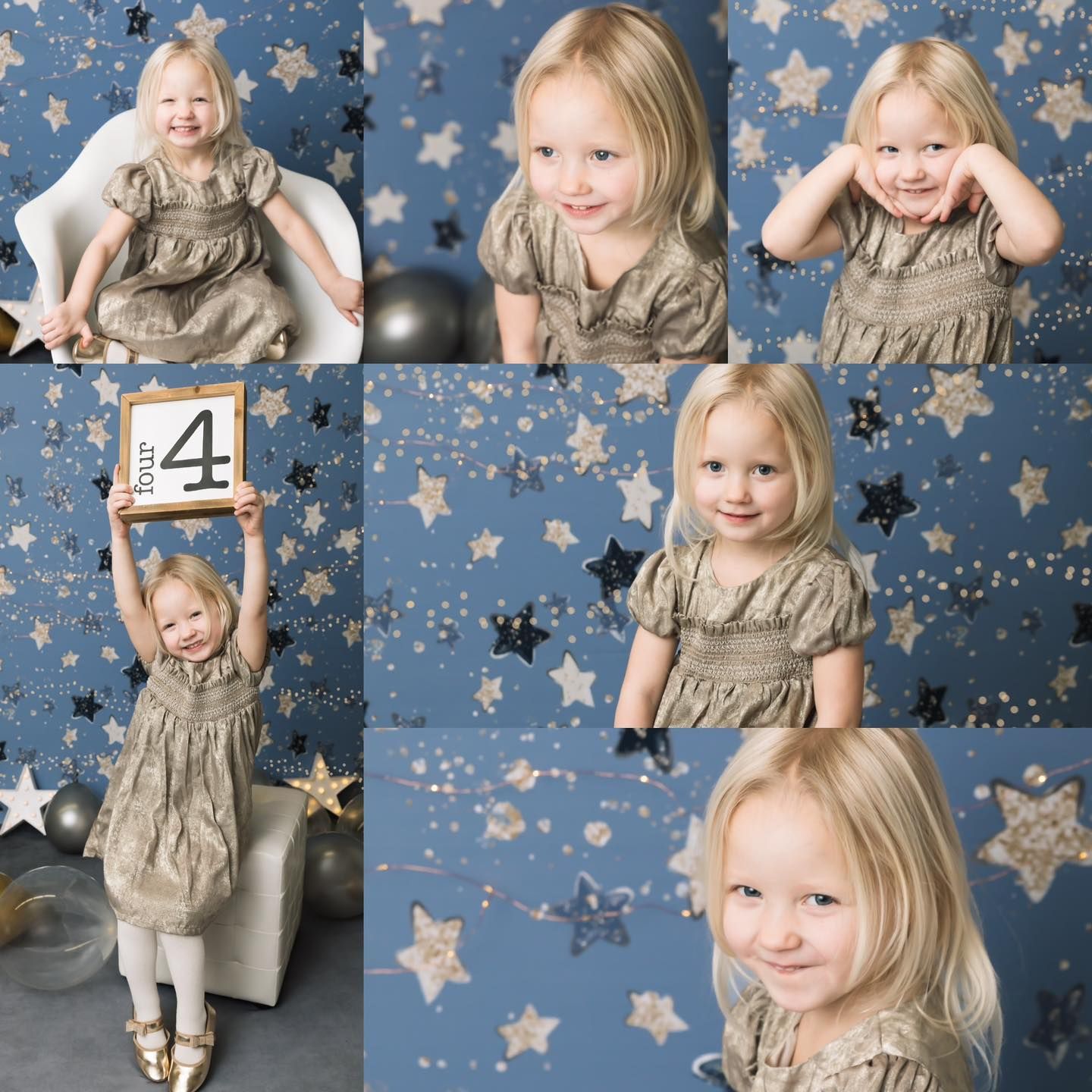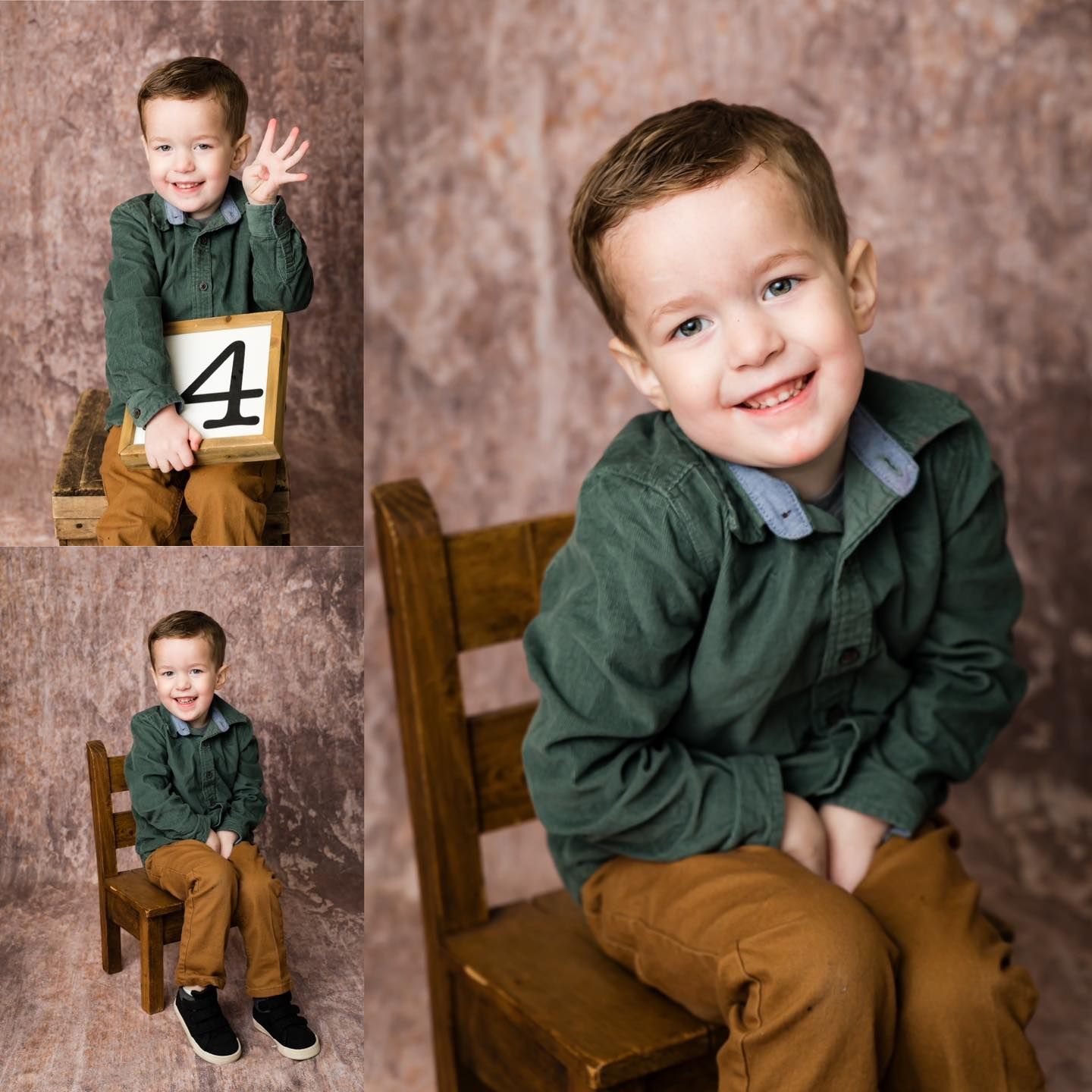 • Young child with a happy expression holding up four fingers against a blue backdrop.