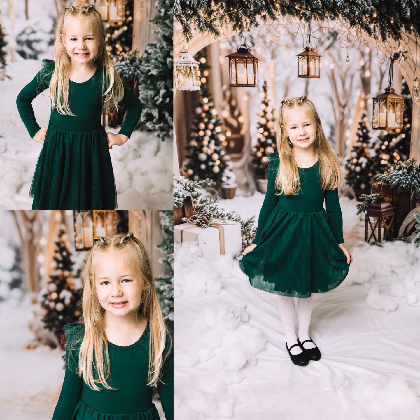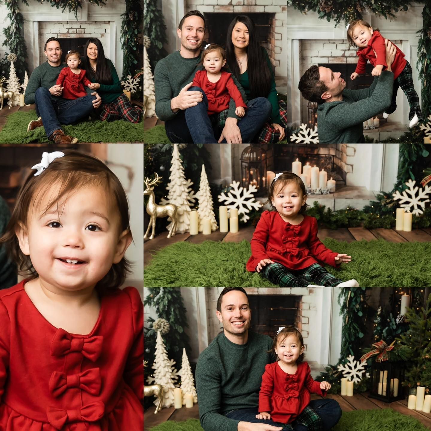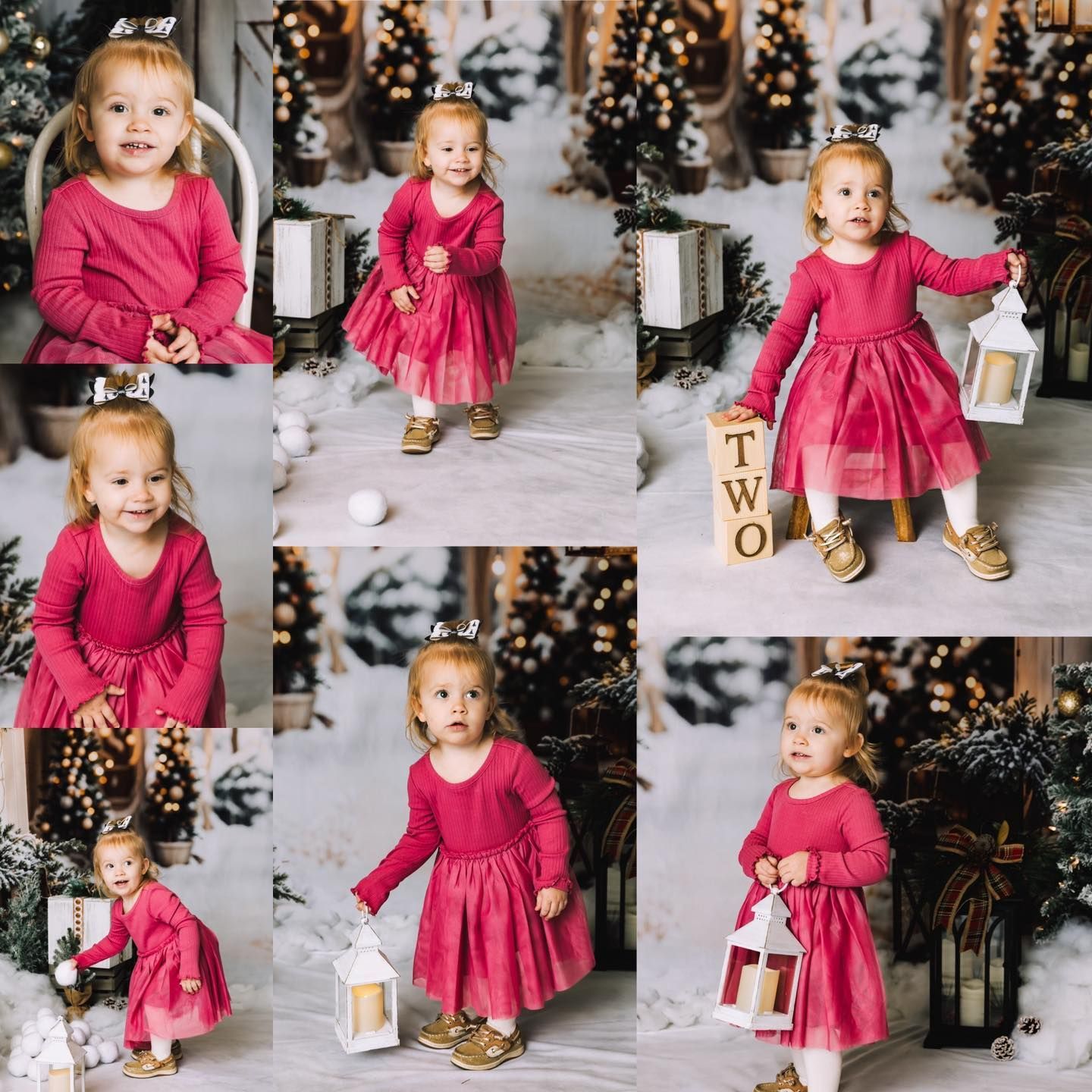 • A toddler sits on a wooden bench, smiling at the camera. Festive winter backdrop with decorations.