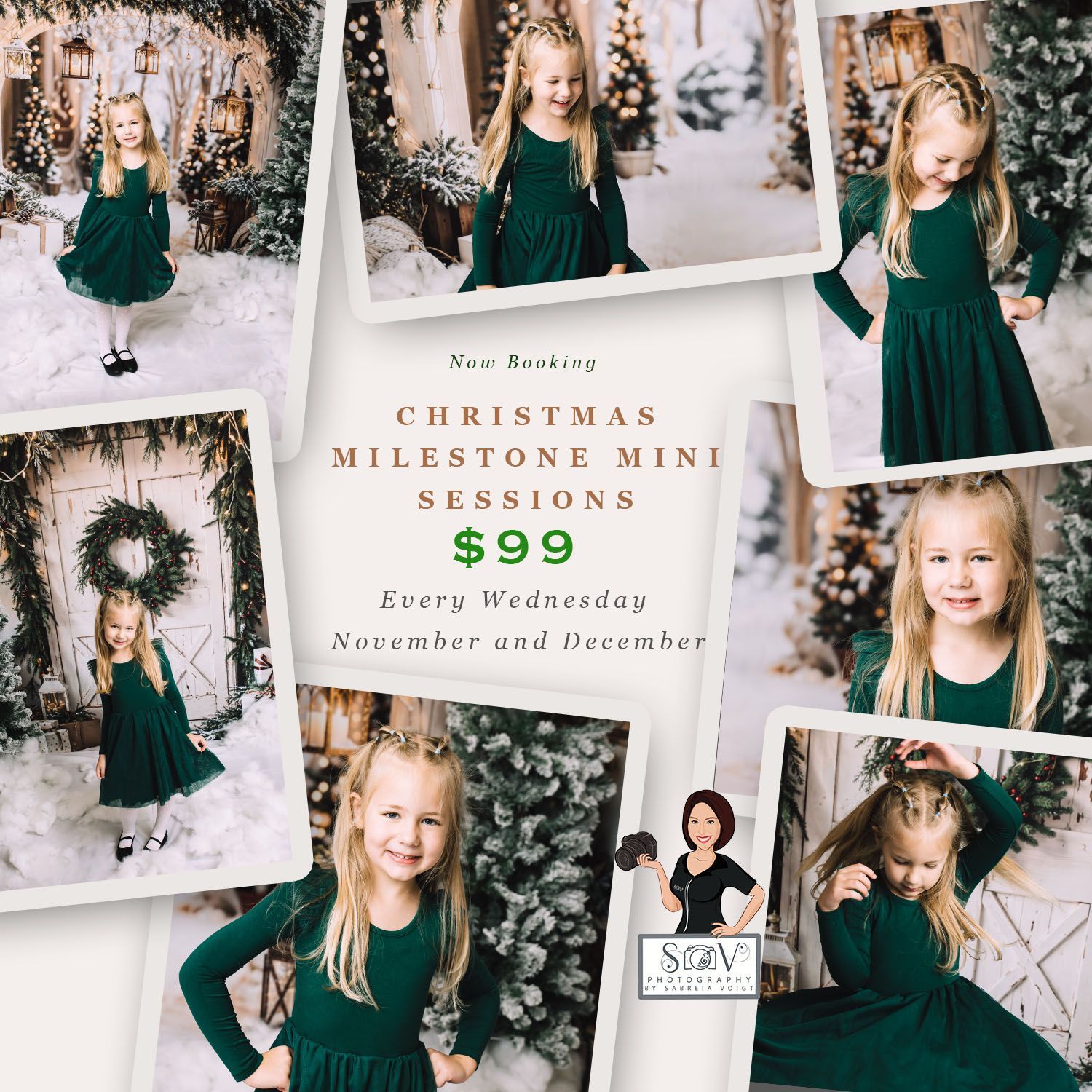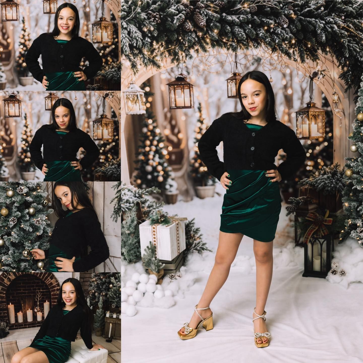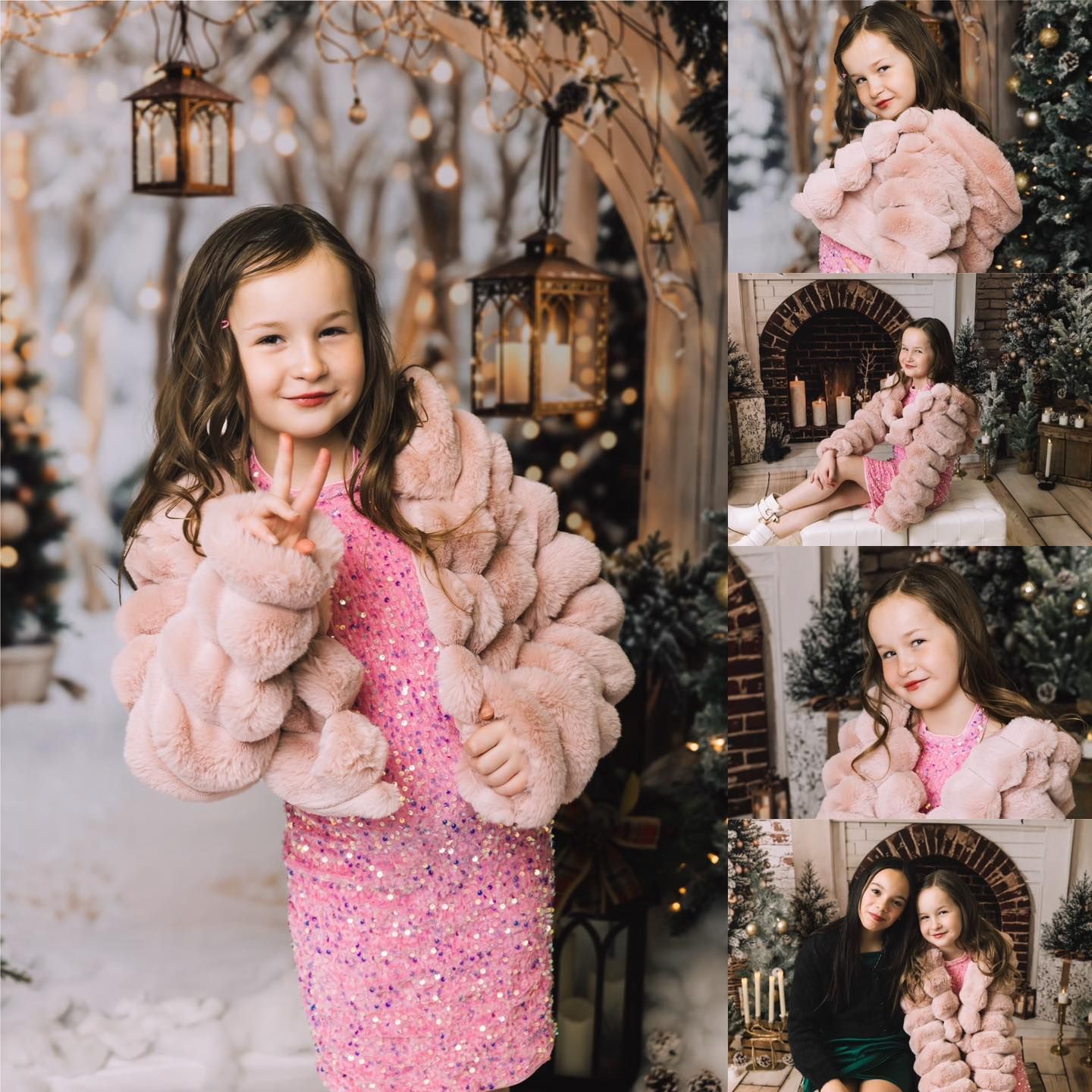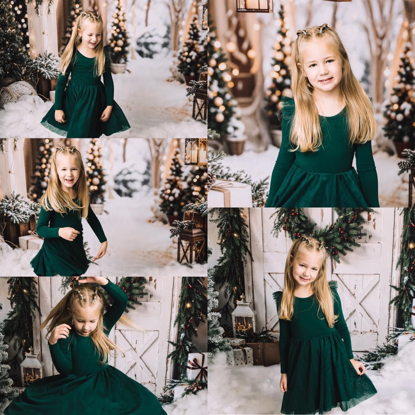 • A toddler sits on a wooden bench, smiling at the camera. Festive winter backdrop with decorations.