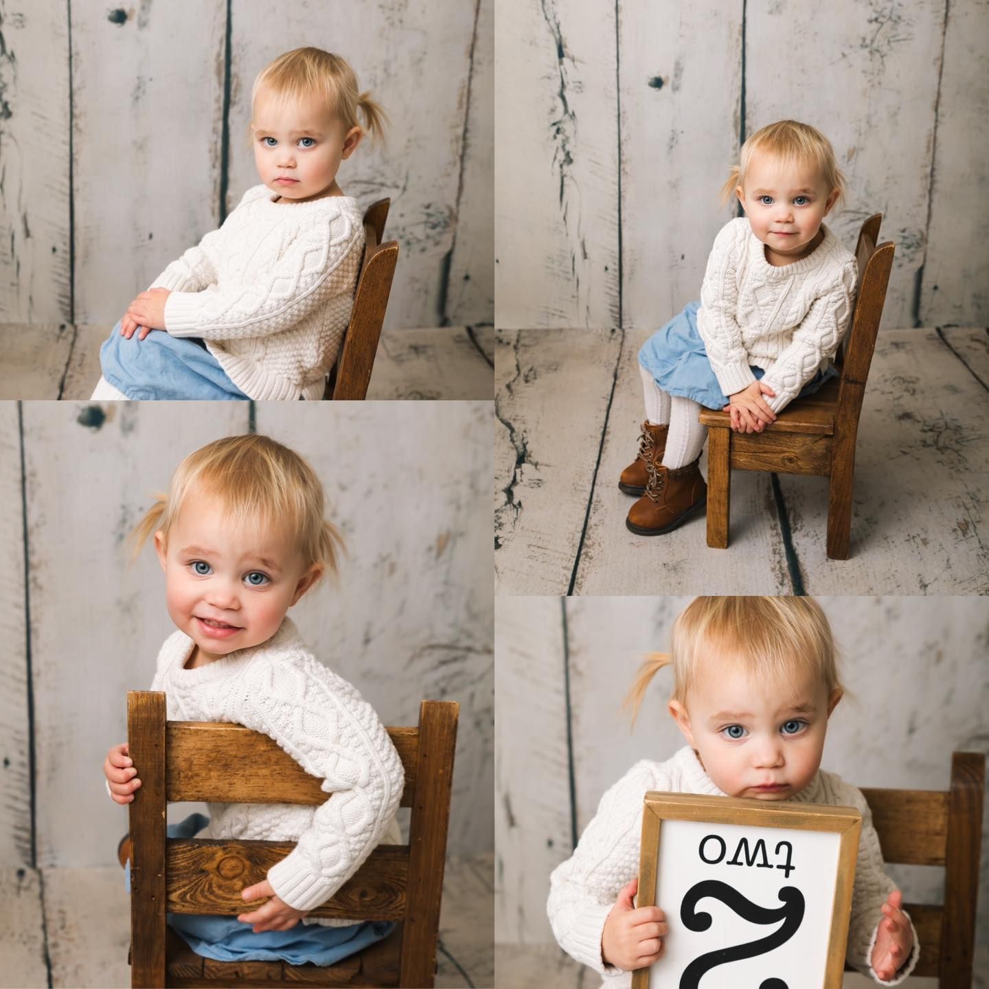 • Baby seated on a gray ottoman, wearing blue sweater and jeans; blue textured backdrop.