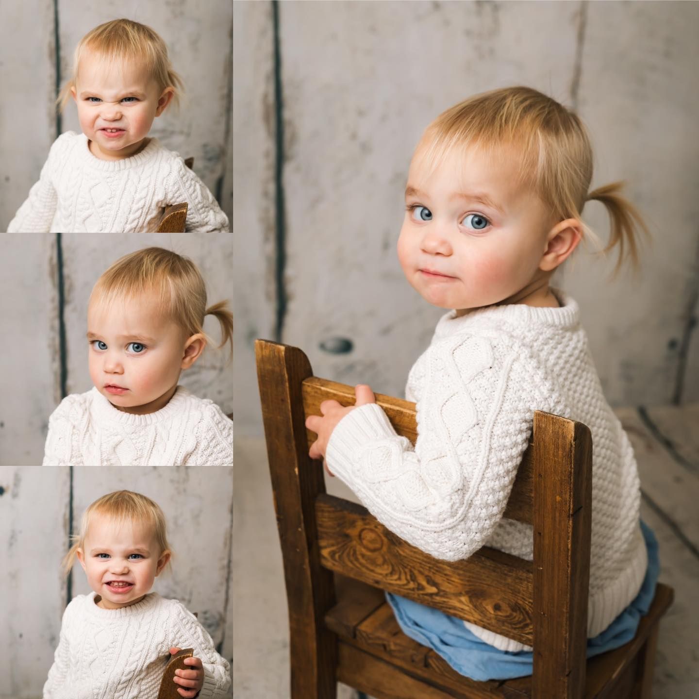 • Smiling toddler with brown hair in a gray and blue sweater, holding a blue chair, against a blue brick wall.