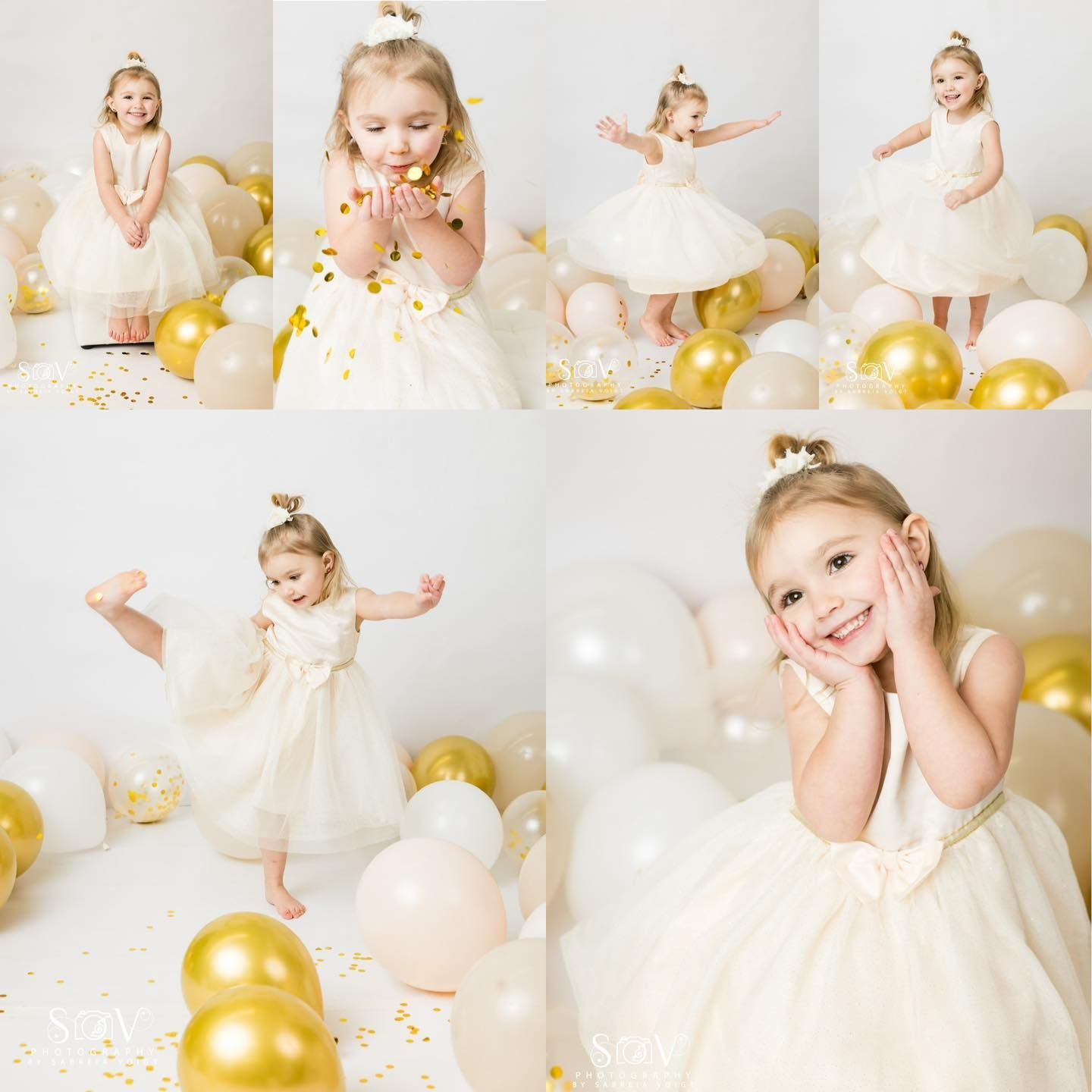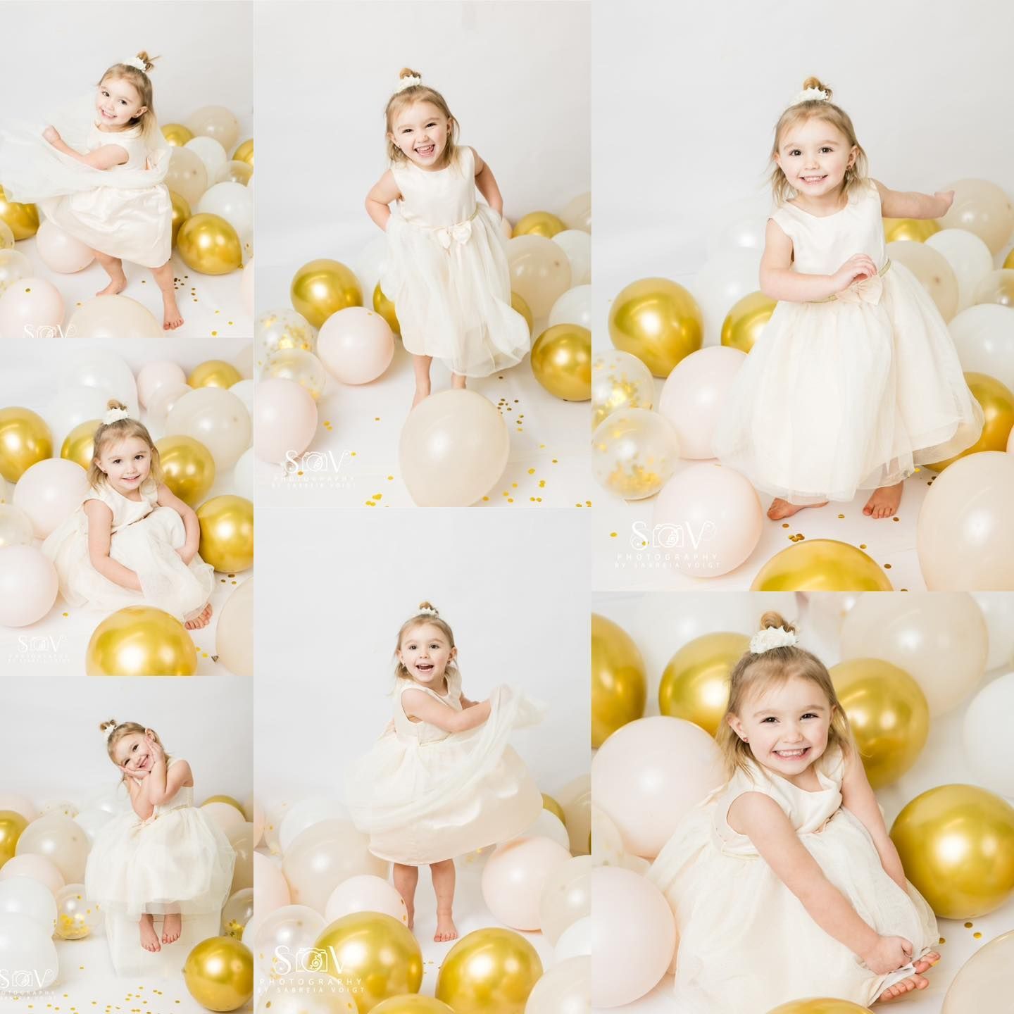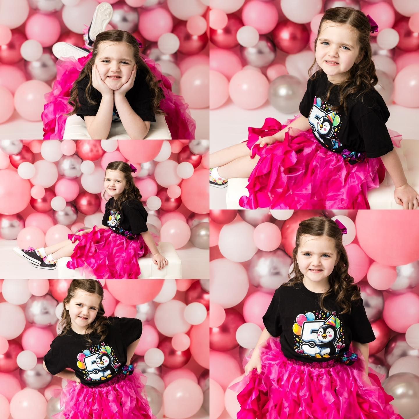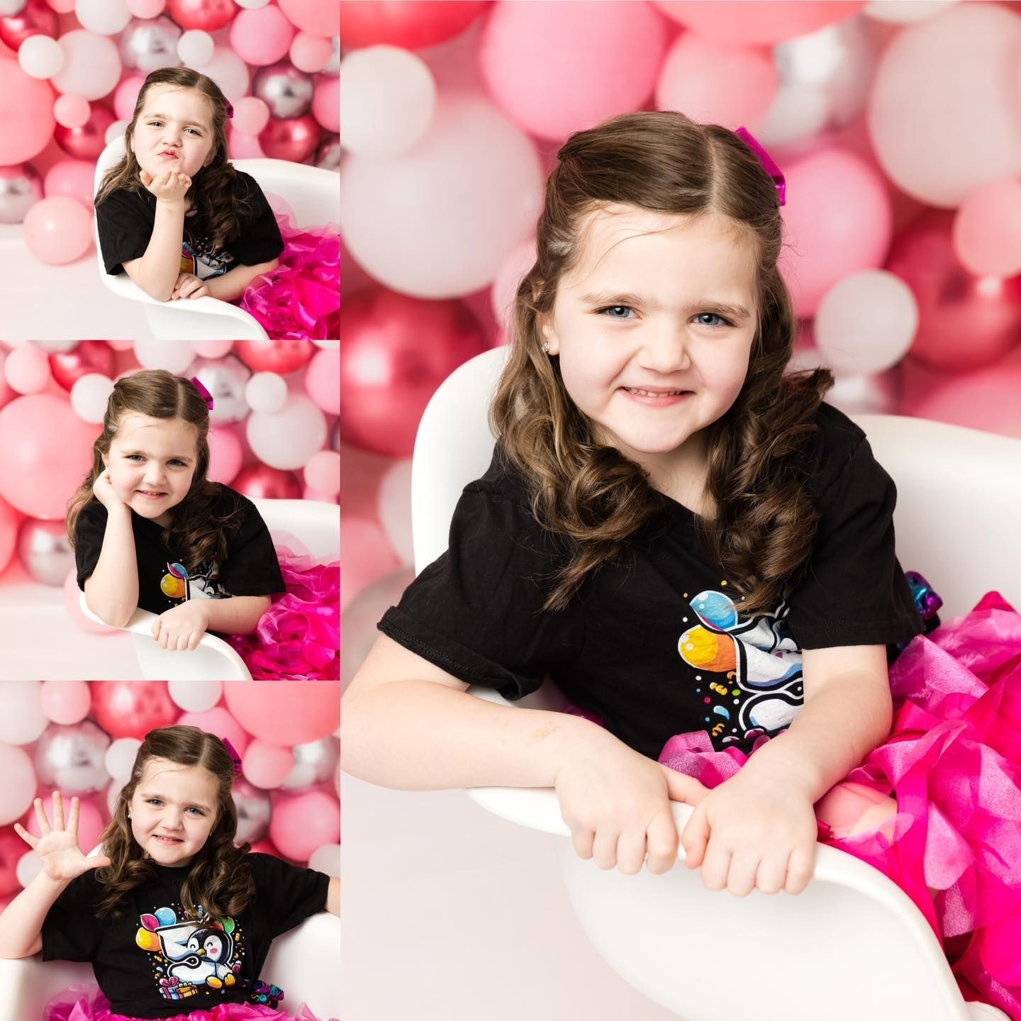 • Girl in pink sweatshirt, standing in front of colorful balloons.