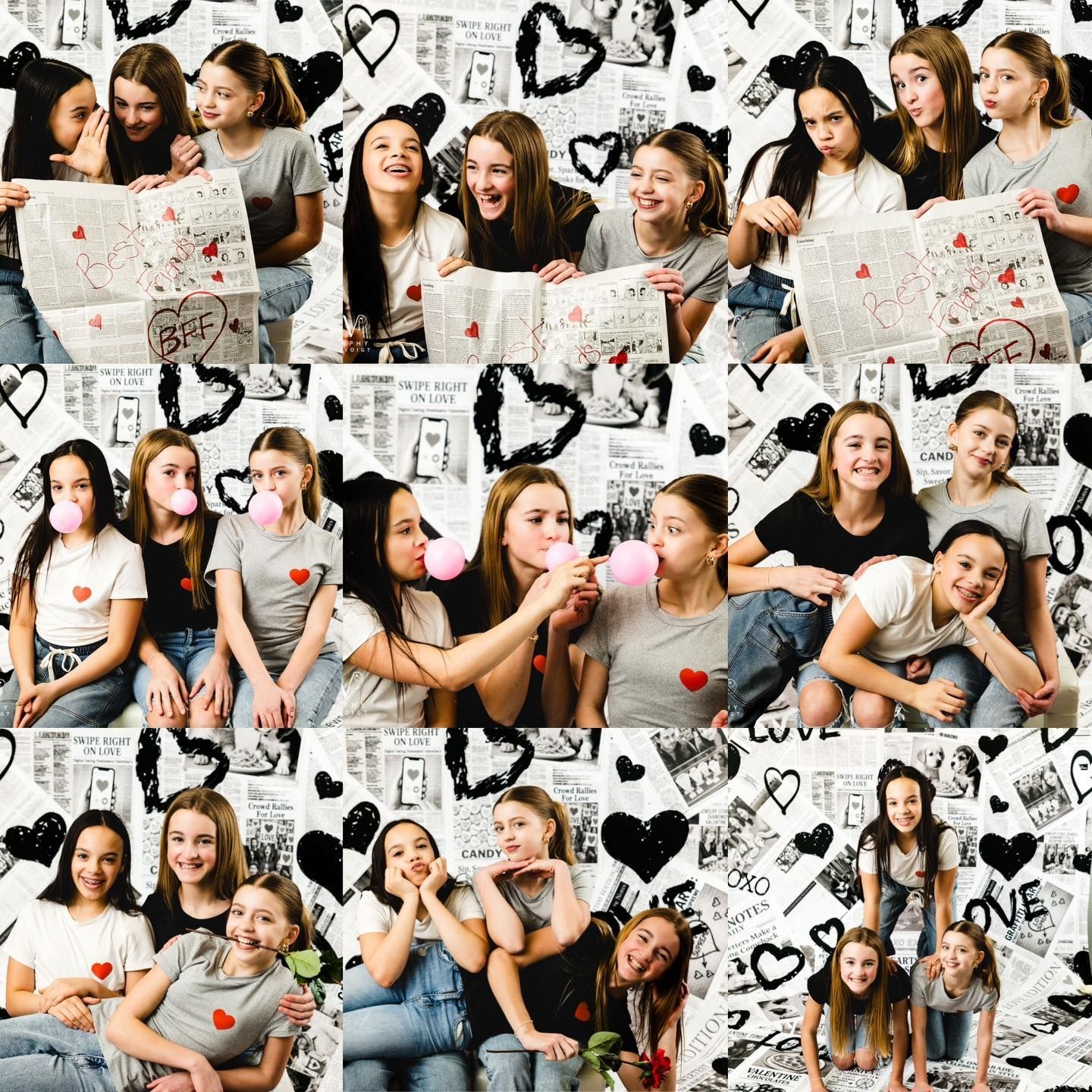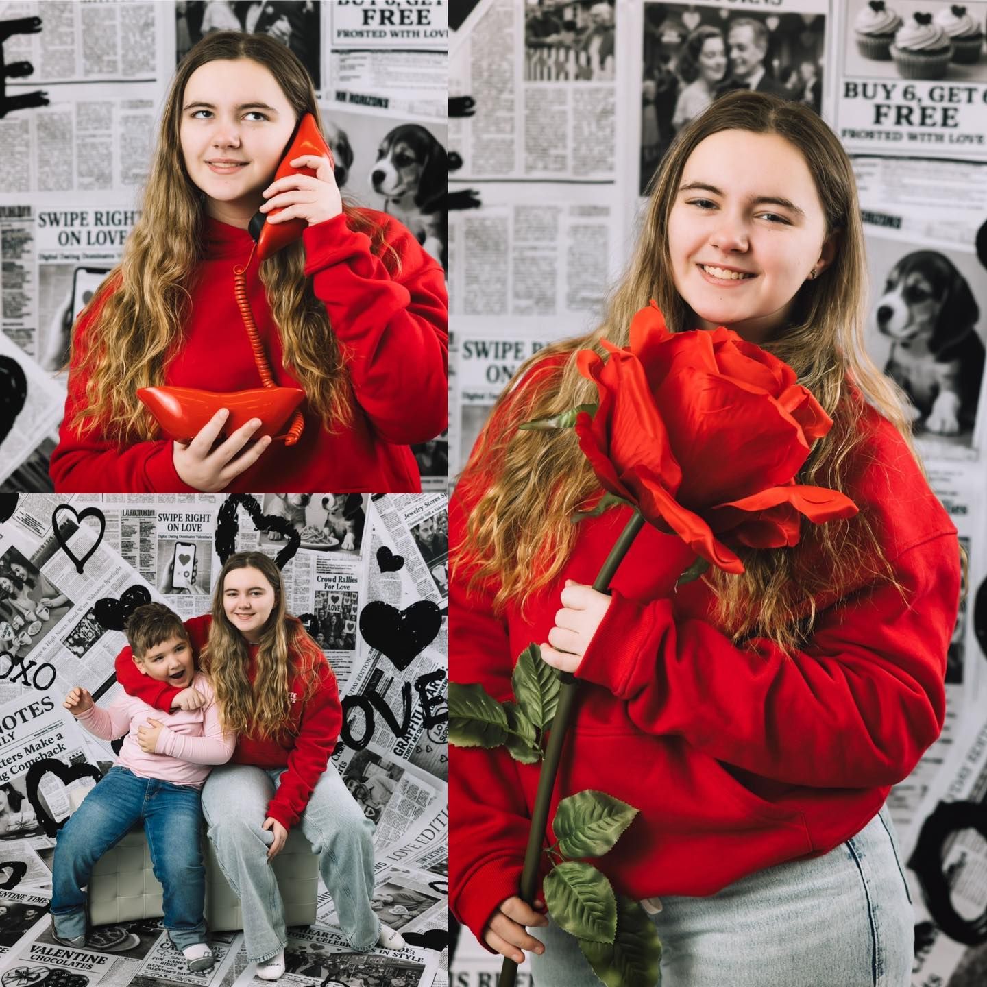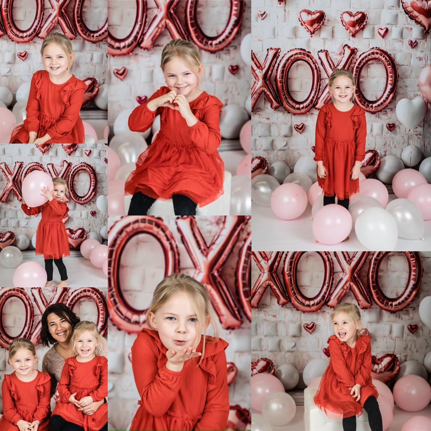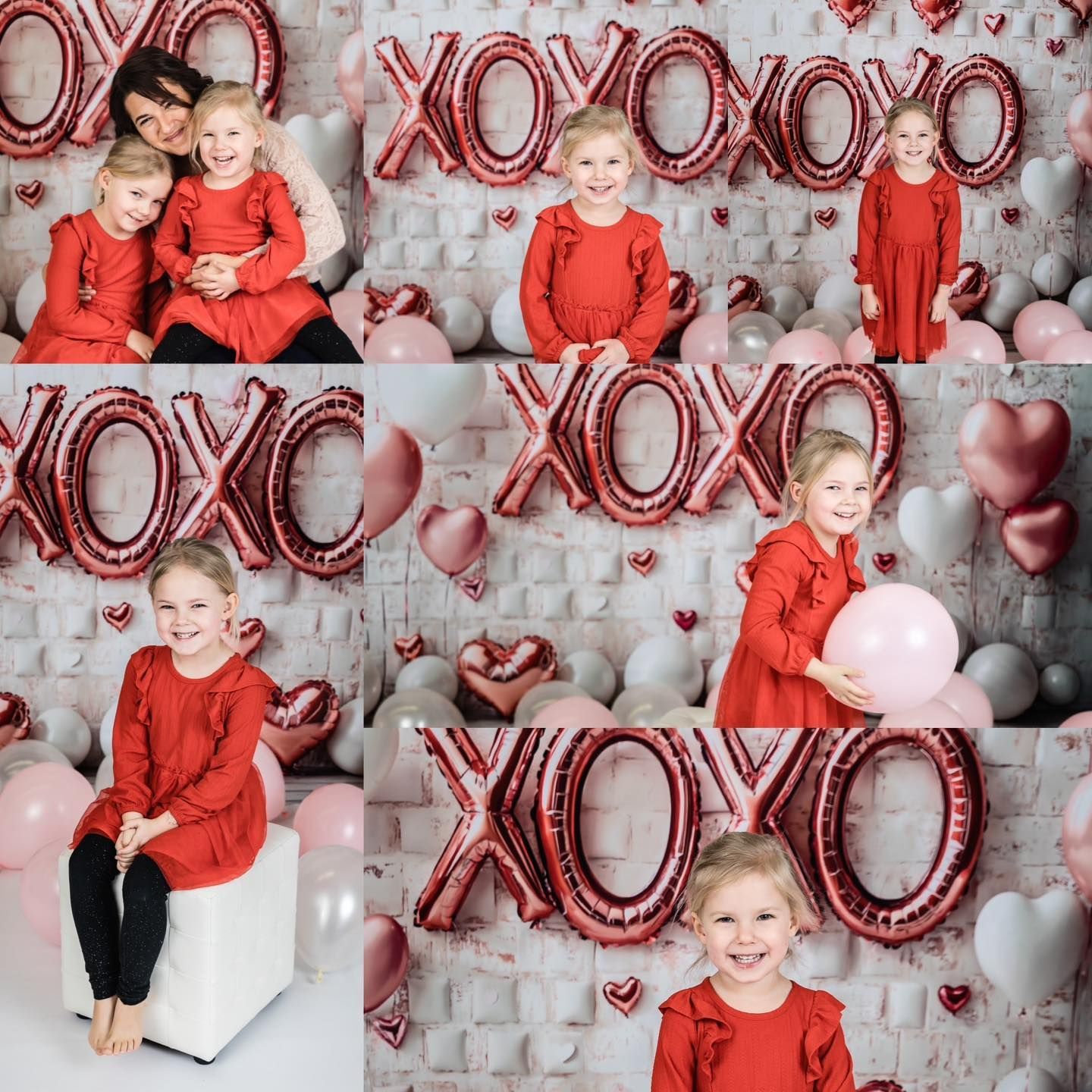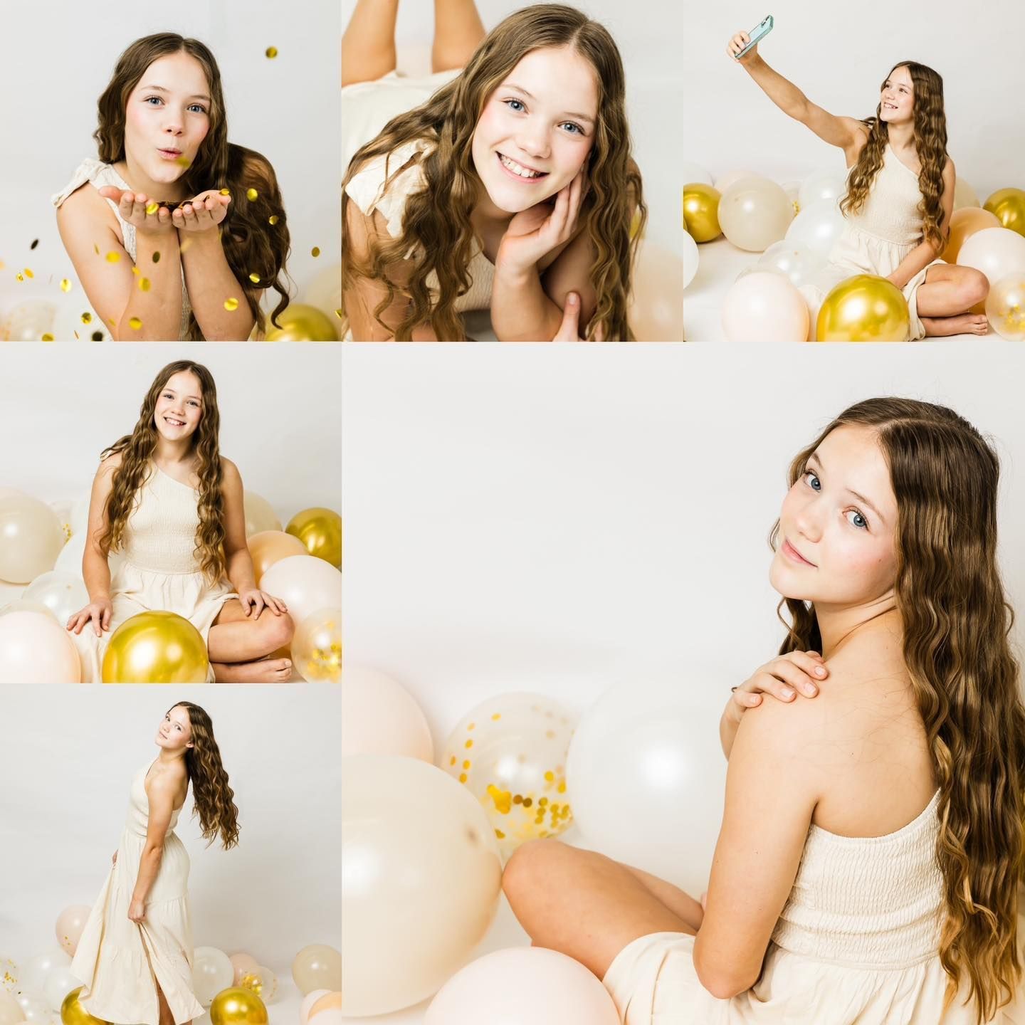 • Girl in pink sweatshirt, standing in front of colorful balloons.