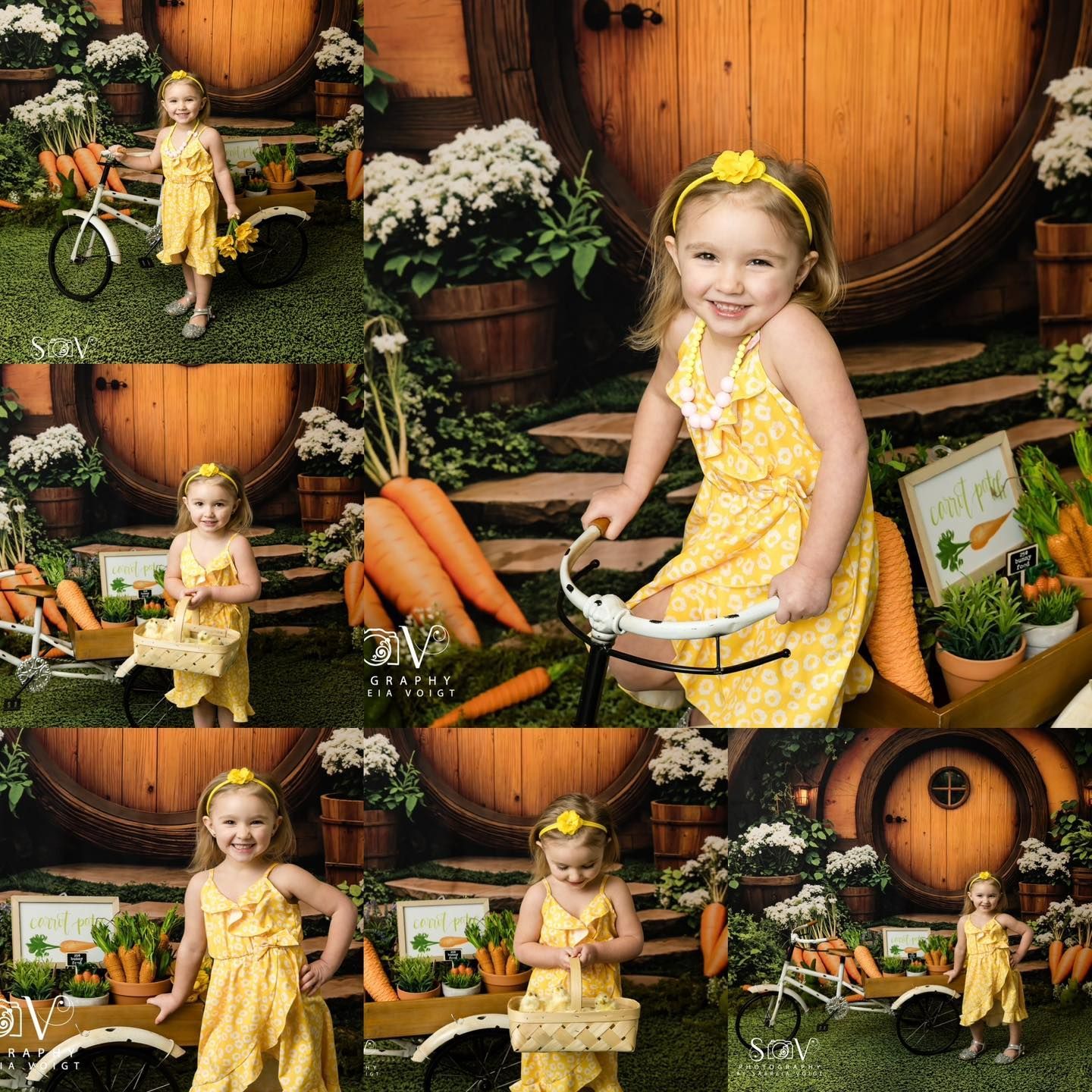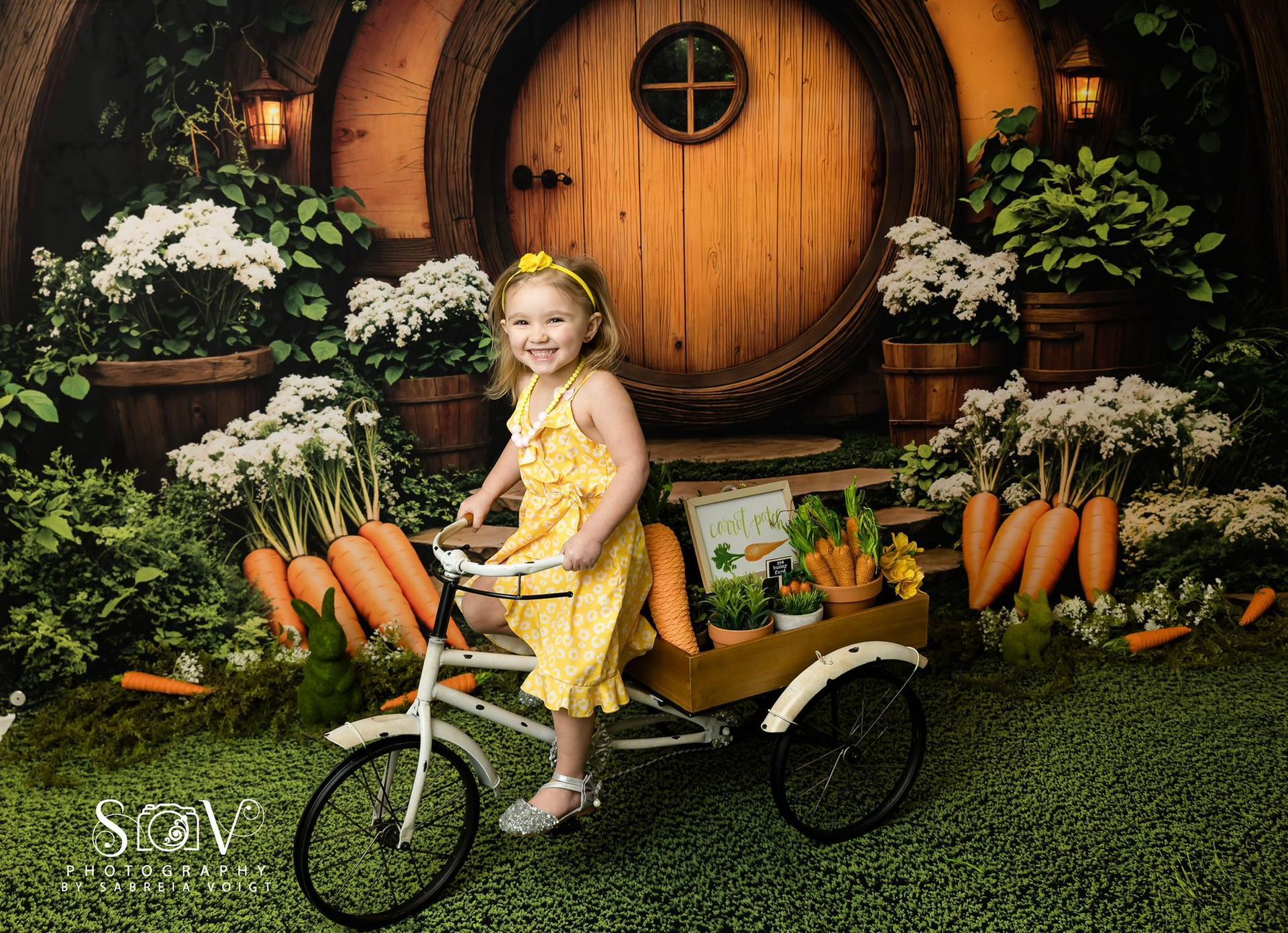• Girl in pink dress with butterflies on her hand, sitting on a bicycle in front of flowers and a decorative door.