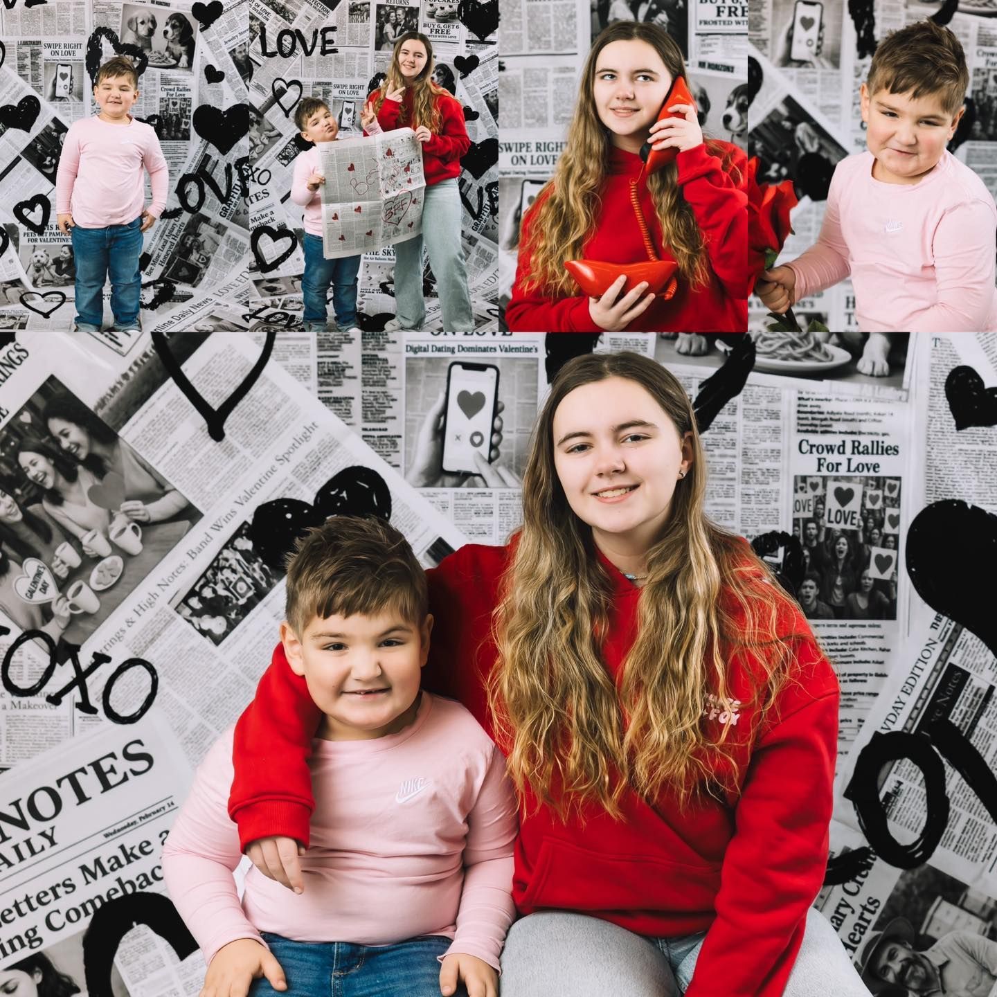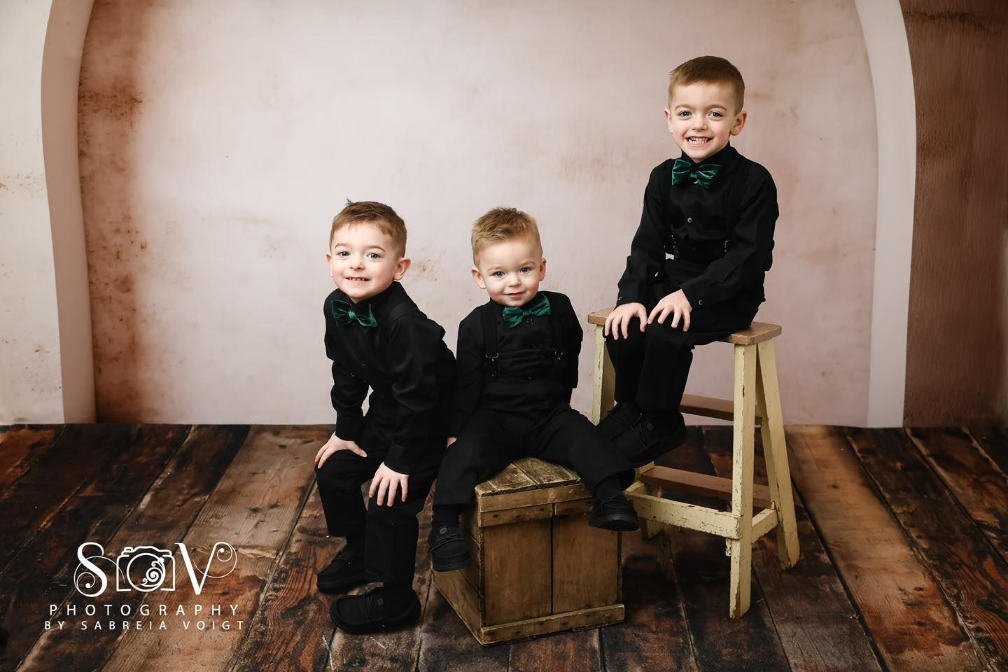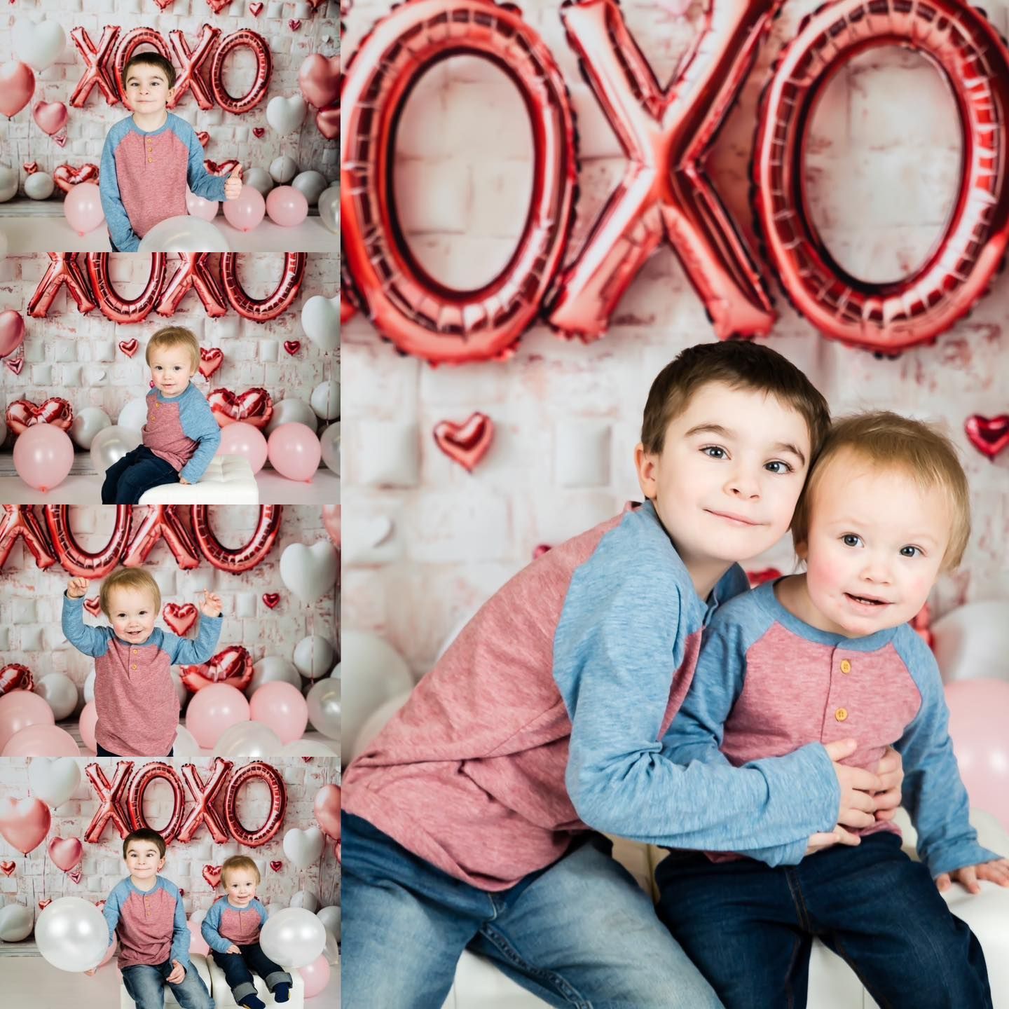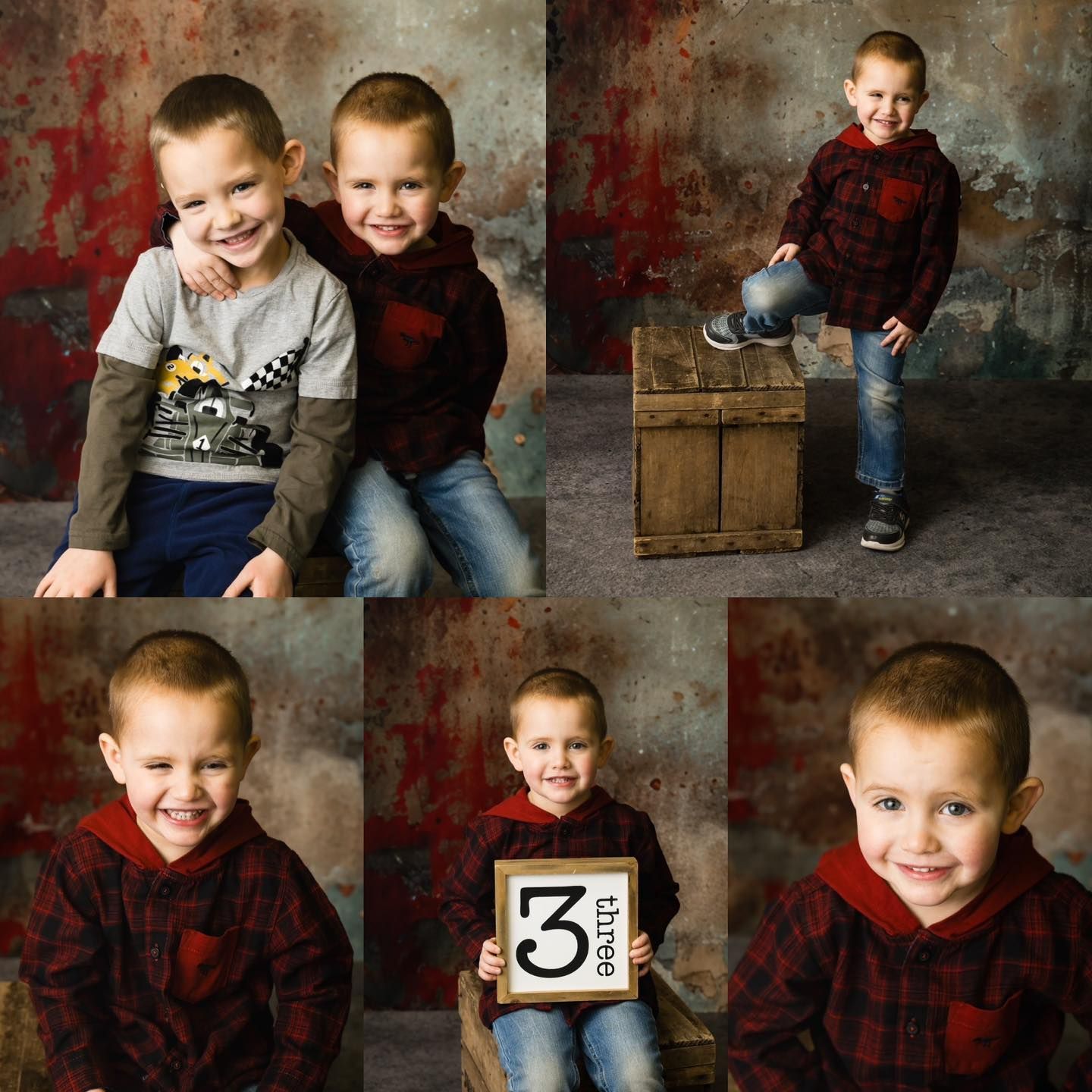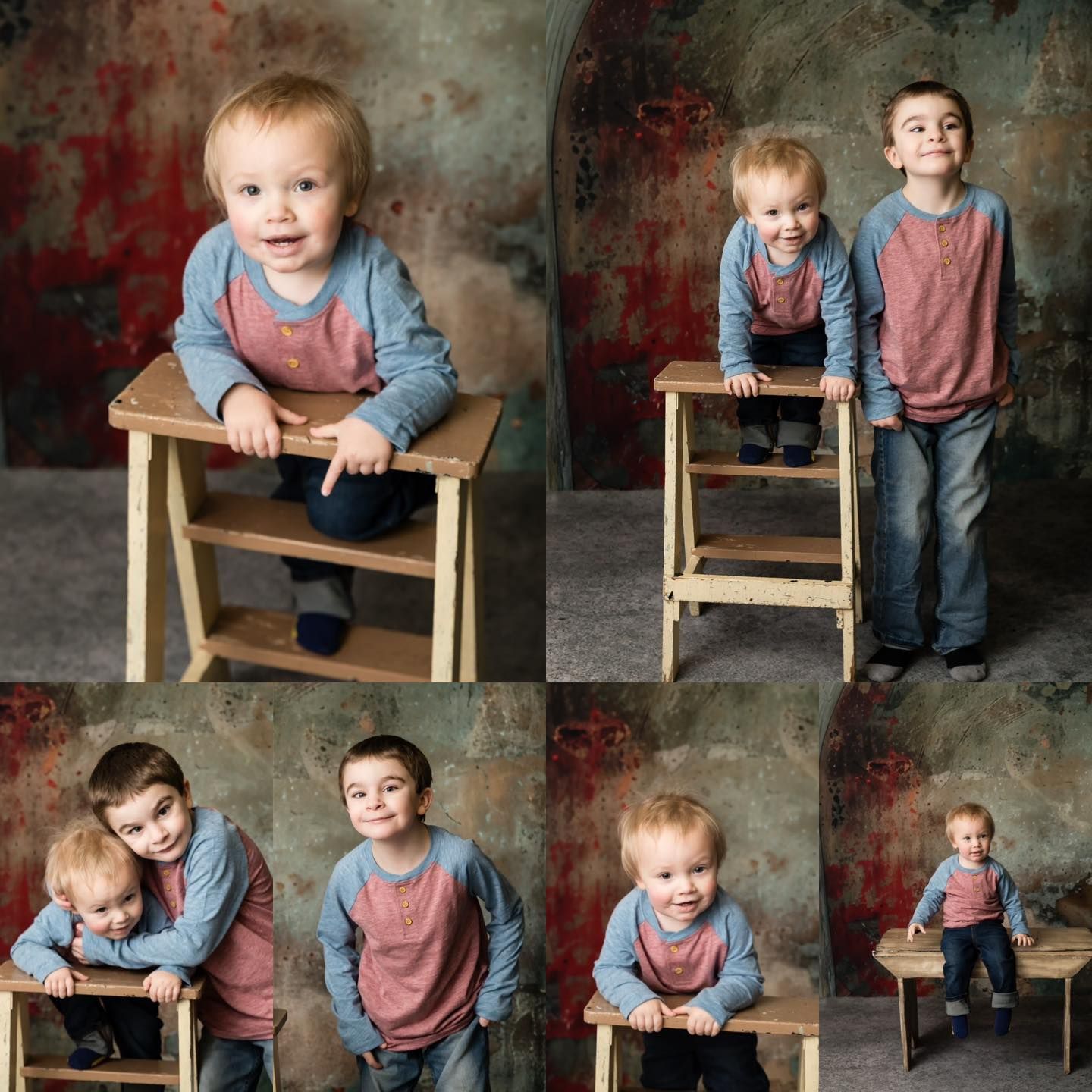 • Two young boys smiling, embracing in front of a red backdrop; one on a small step stool.