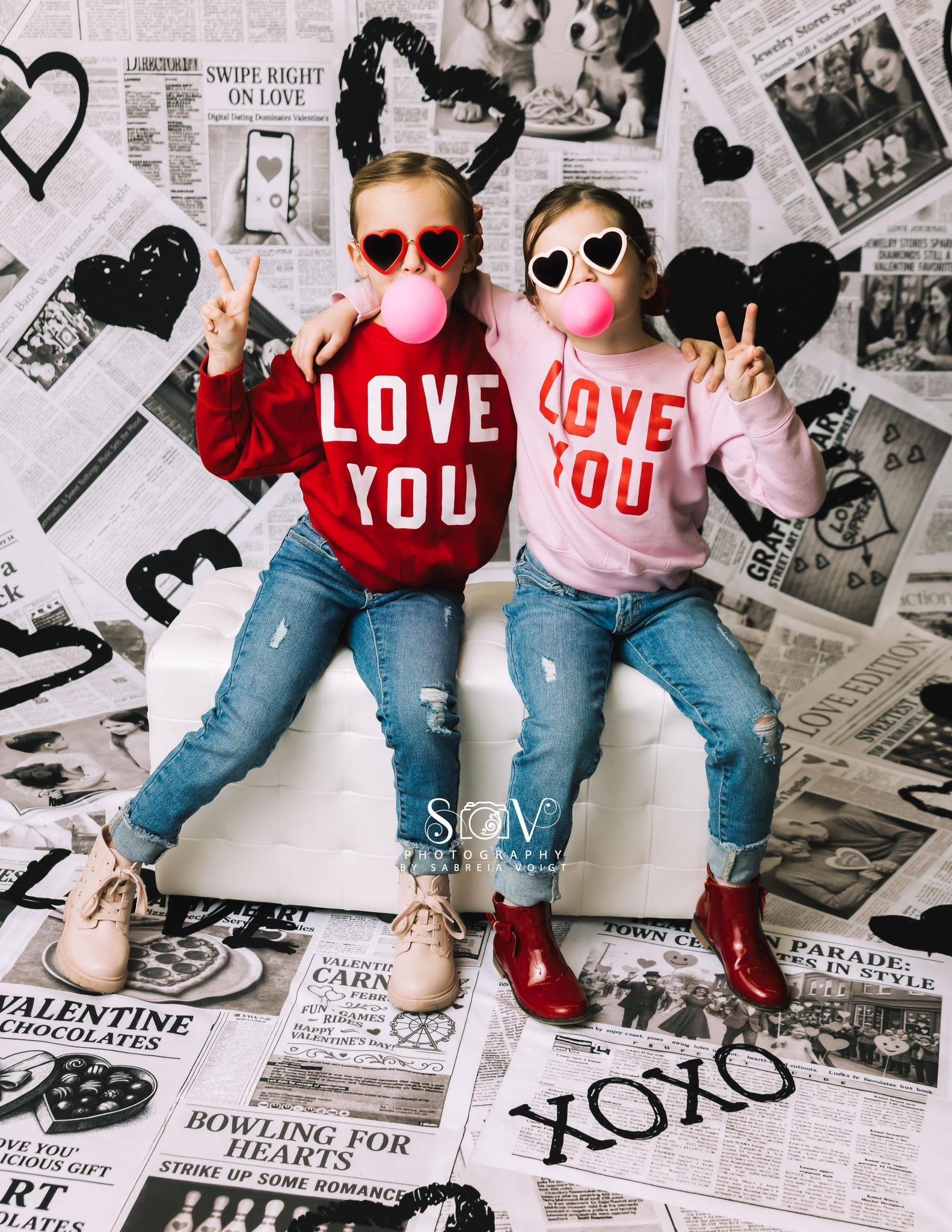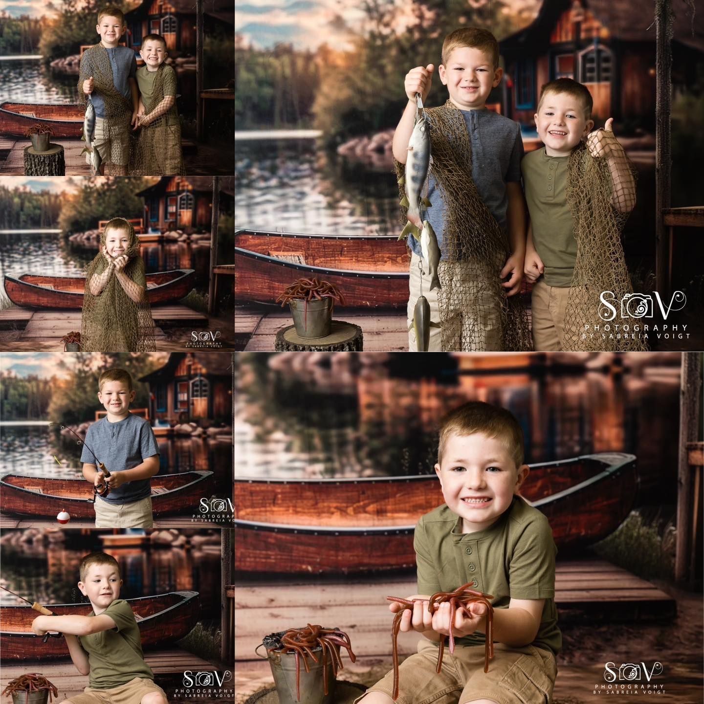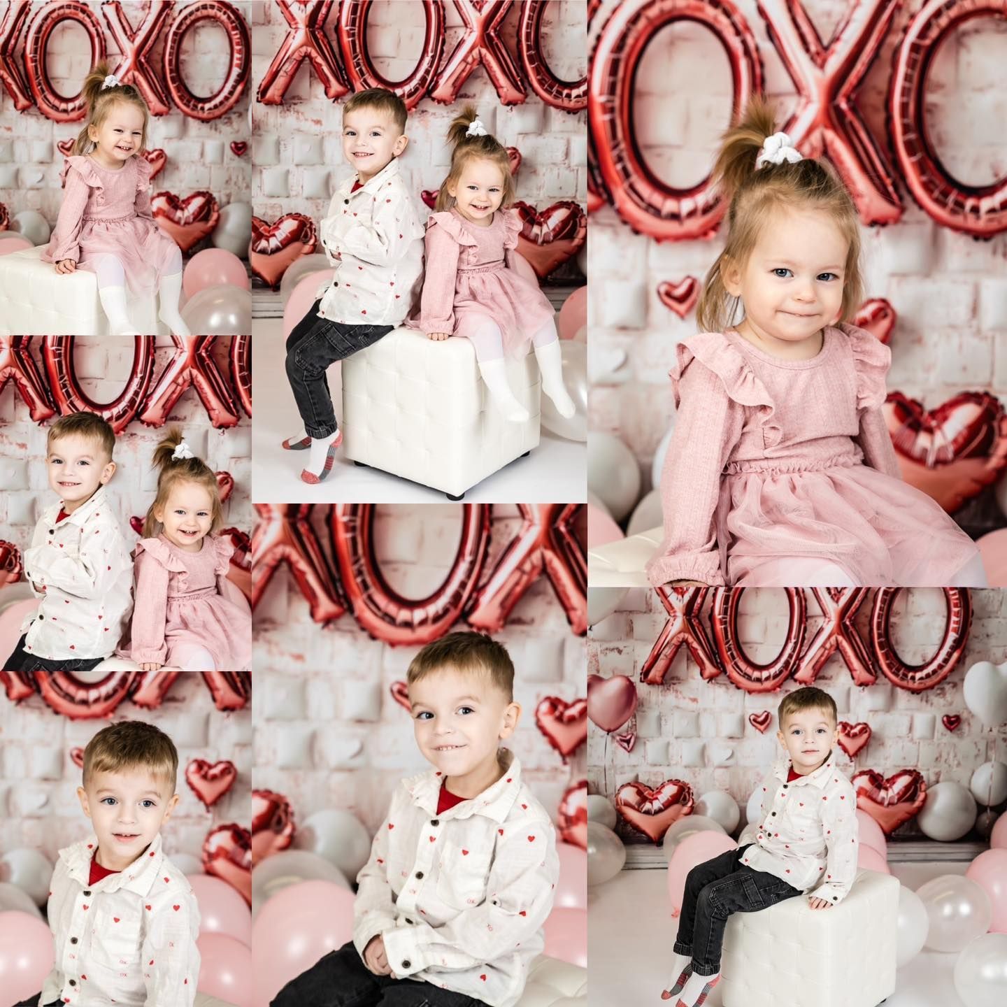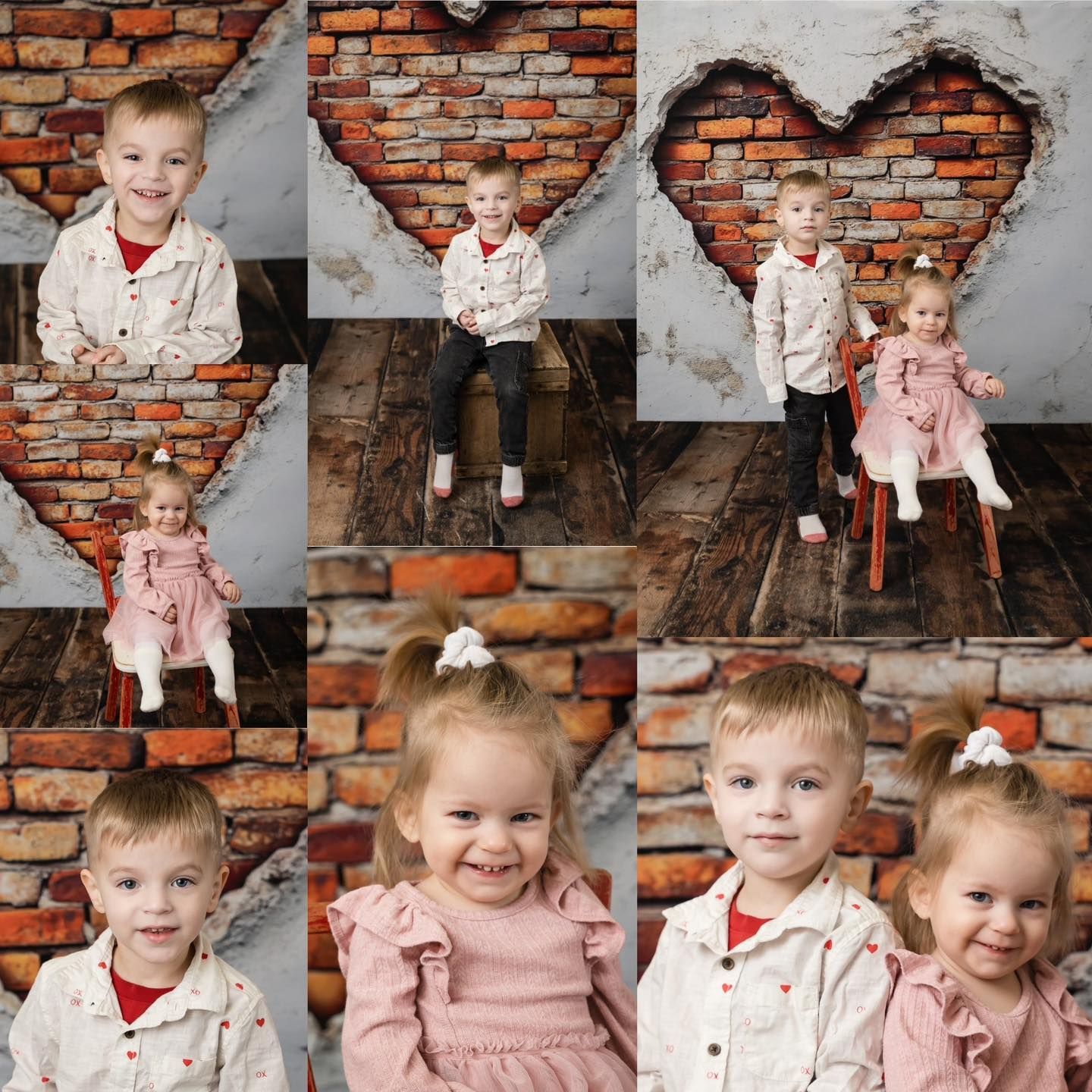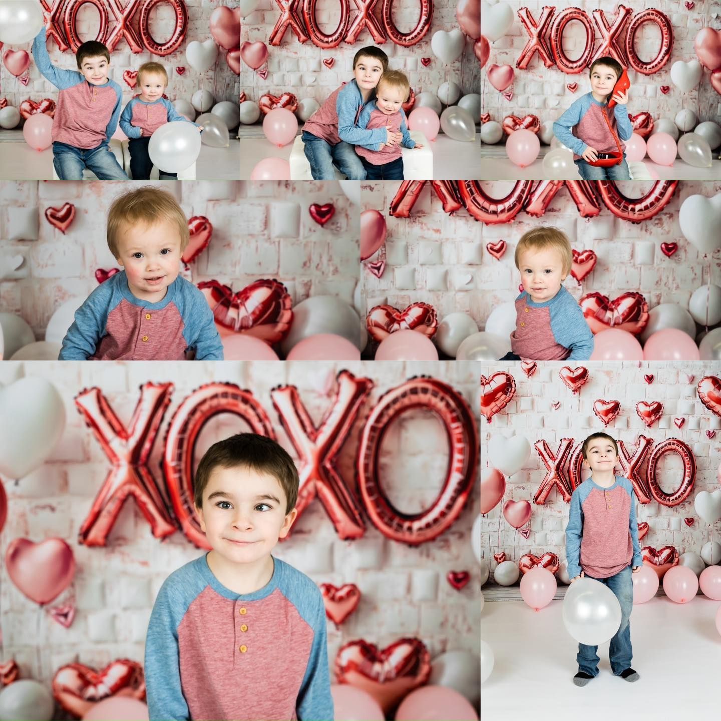 • Two young boys smiling, embracing in front of a red backdrop; one on a small step stool.
