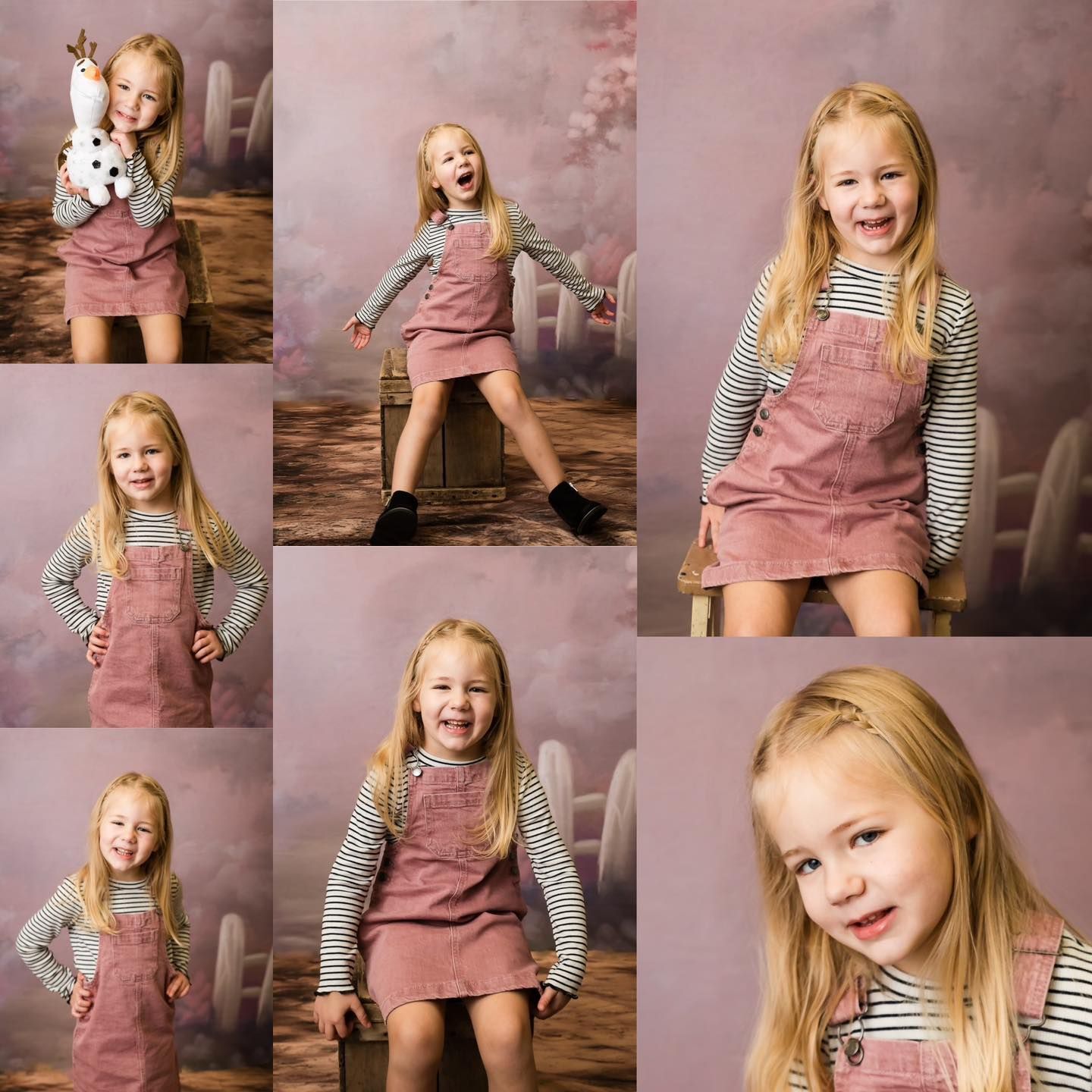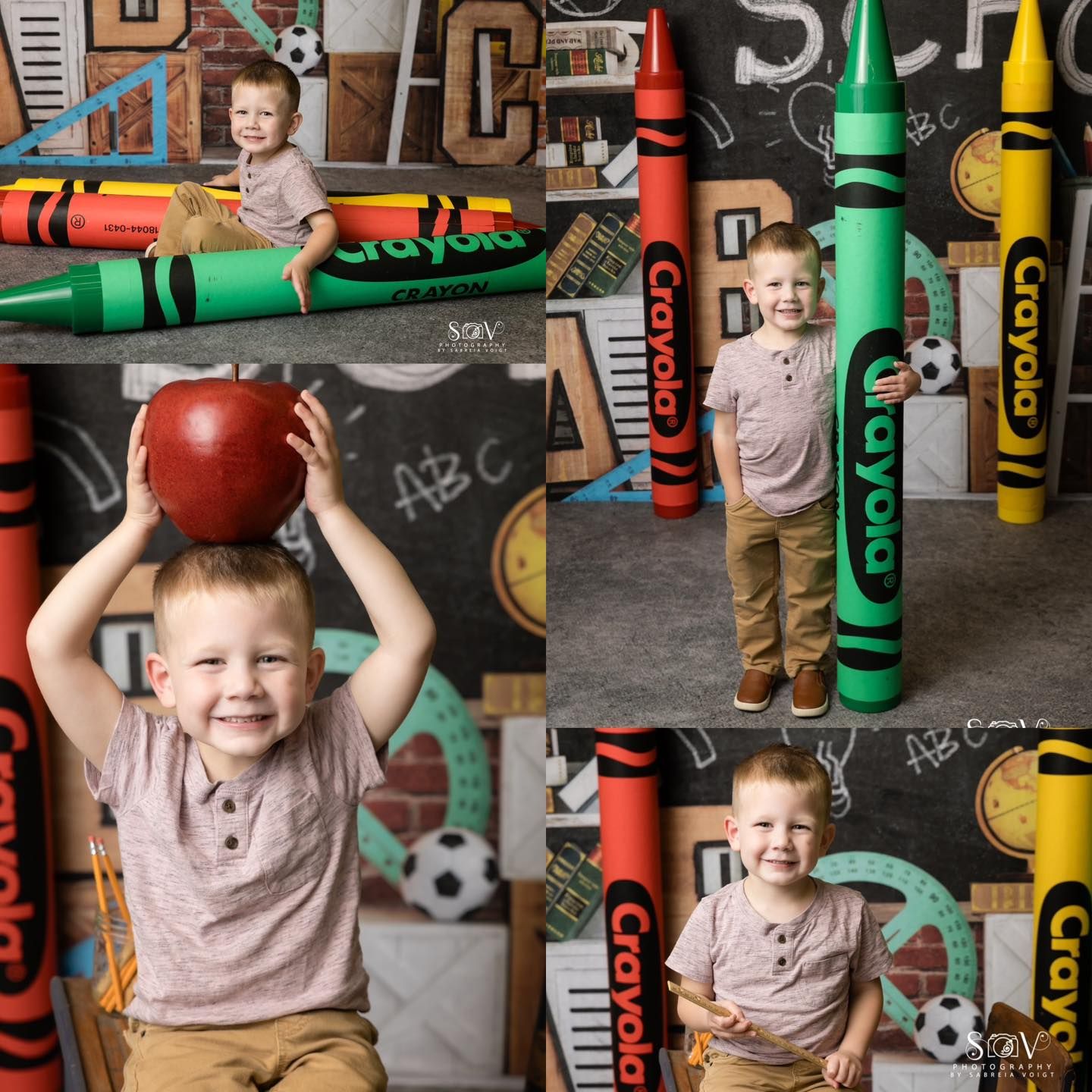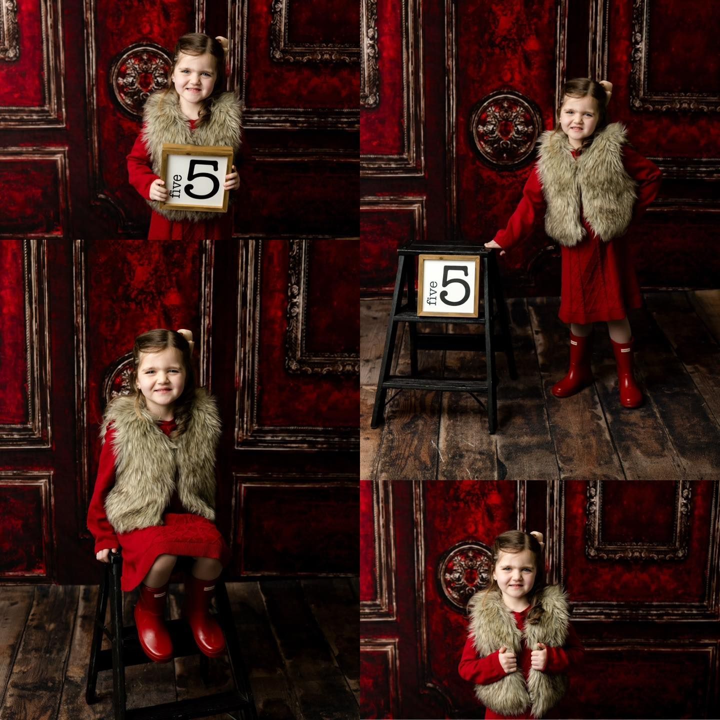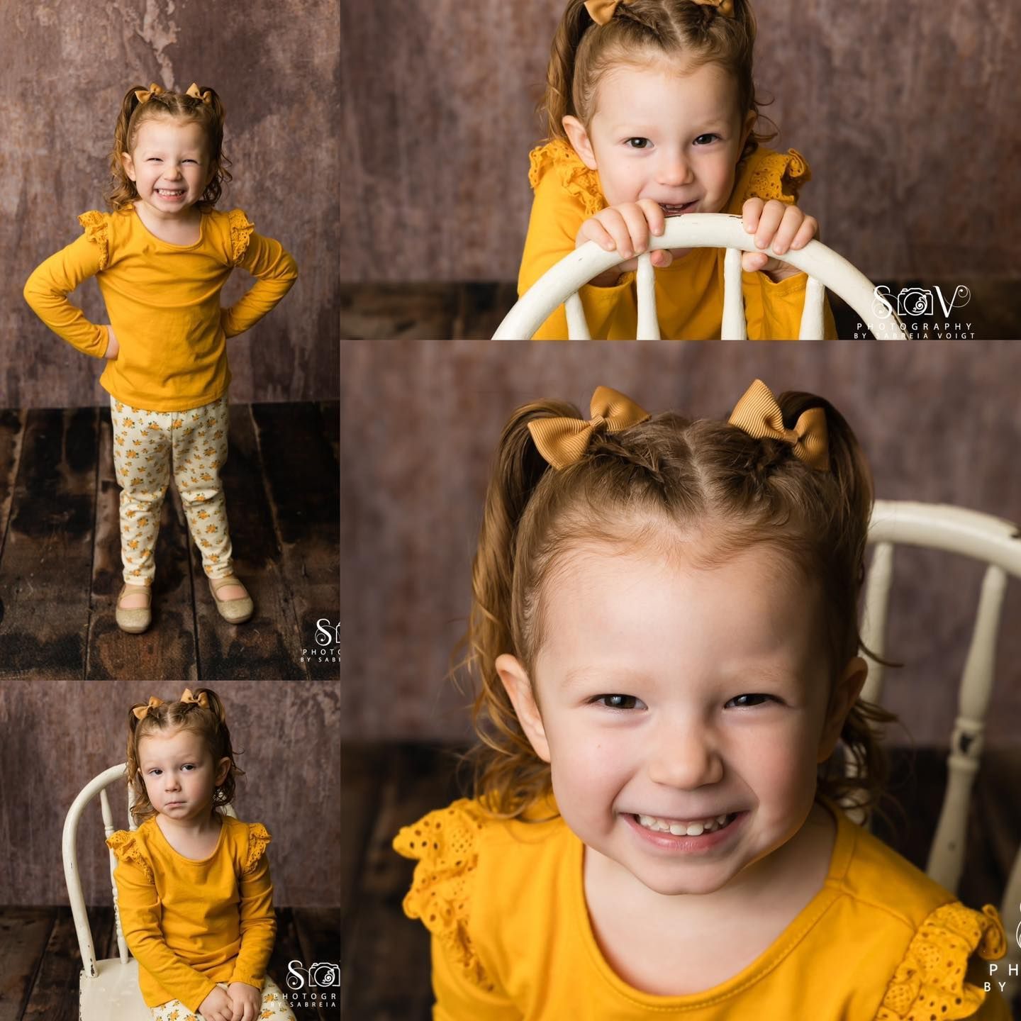 • Blond-haired child with blue eyes, smiling, resting arms on a chair, red backdrop.