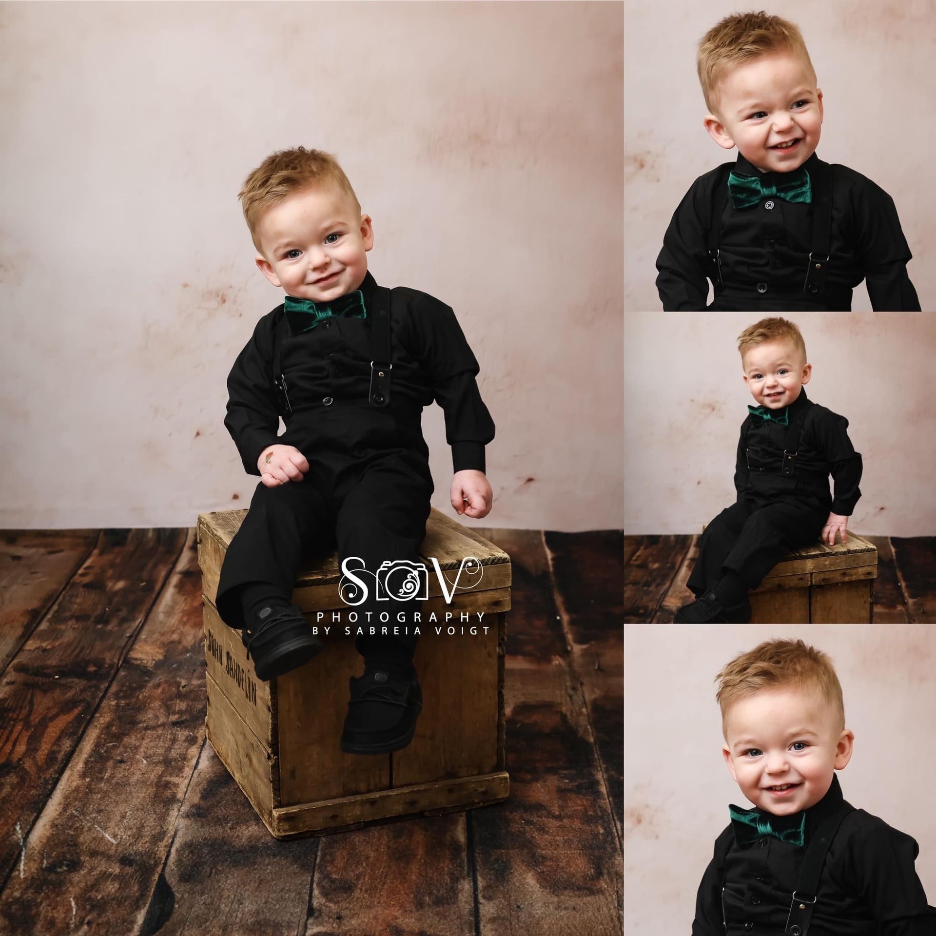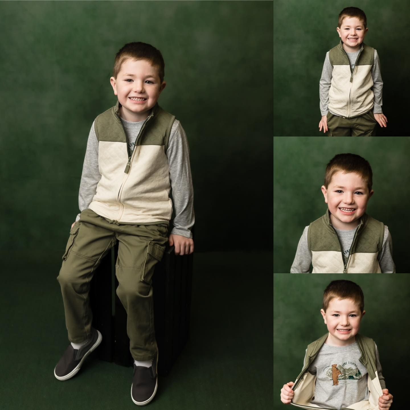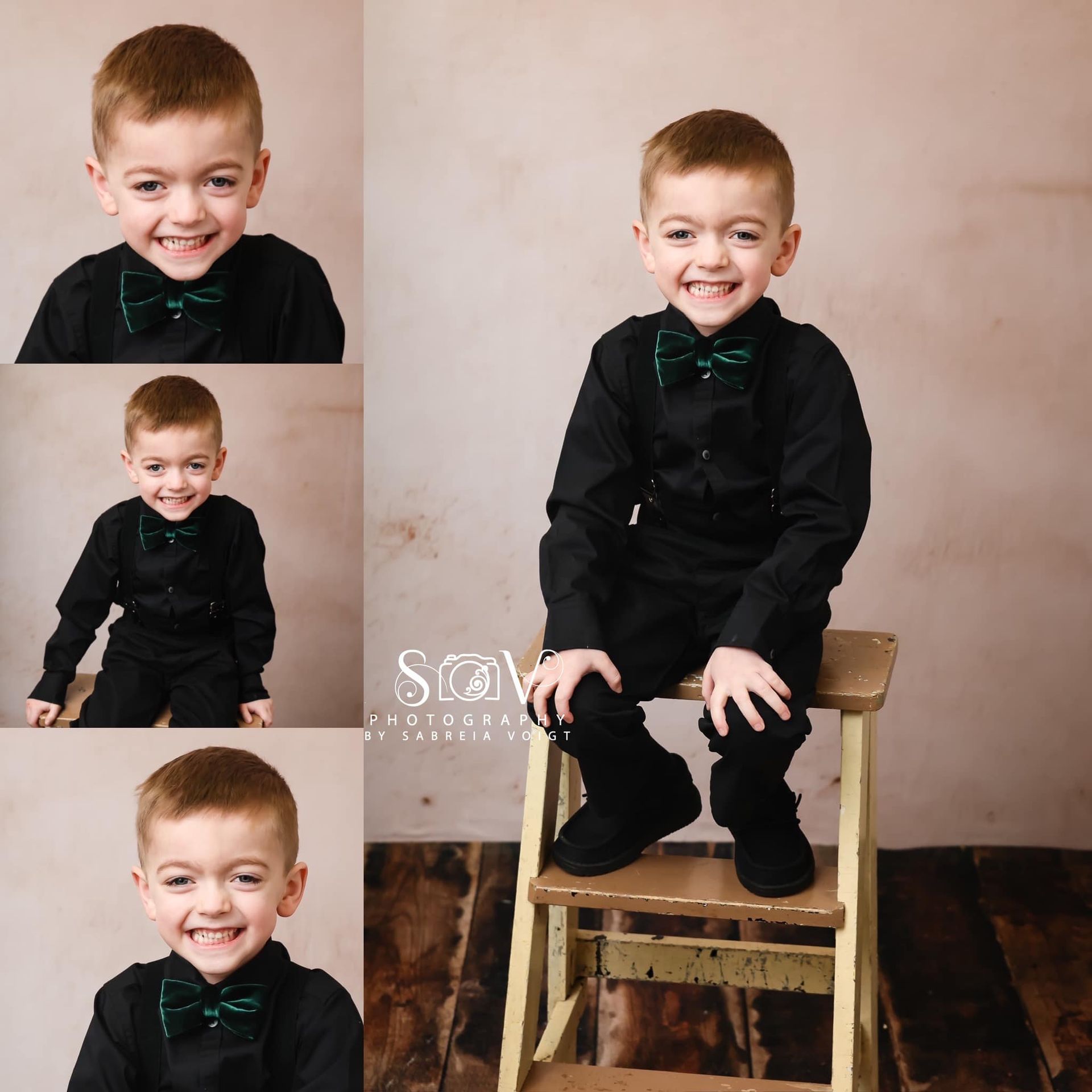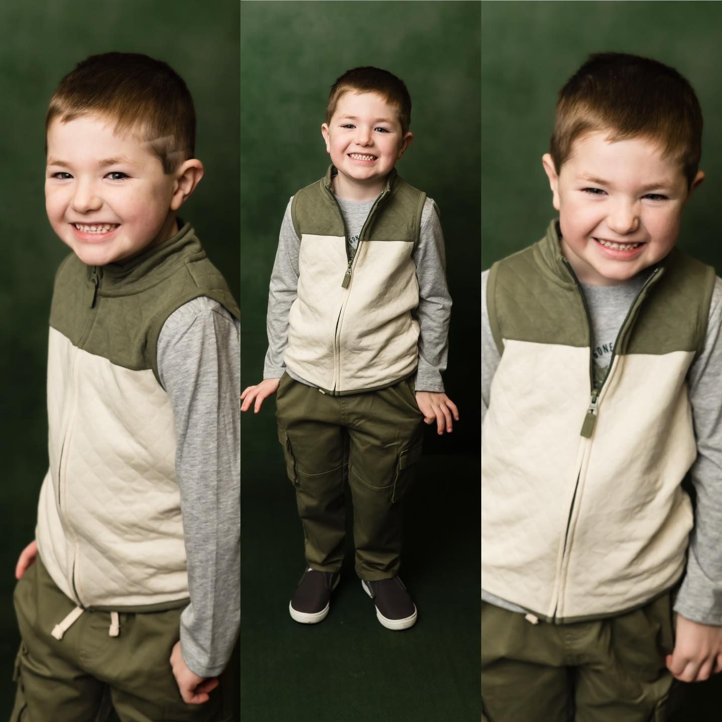 • Young boy in black vest and shirt smiles in front of ornate black backdrop.
