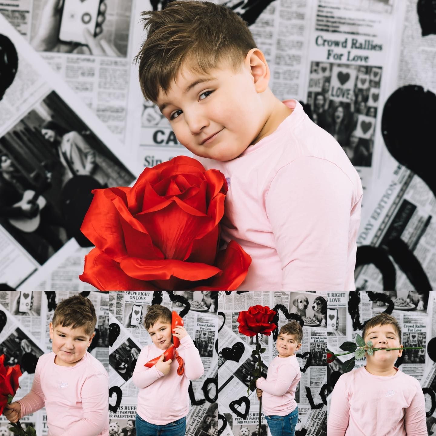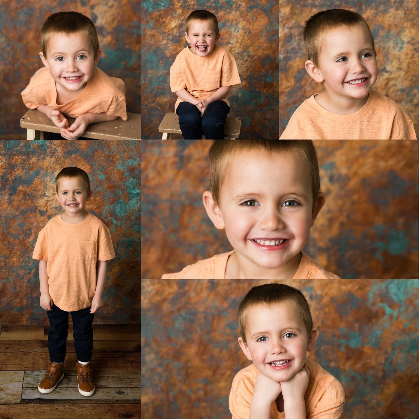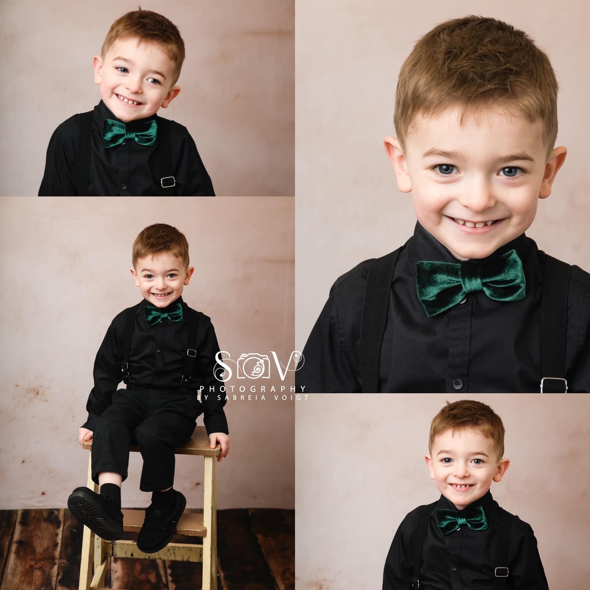 • Young boy in black vest and shirt smiles in front of ornate black backdrop.