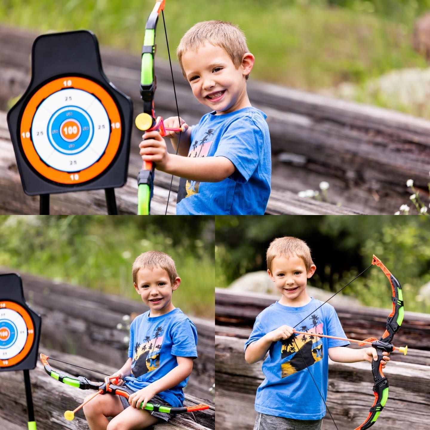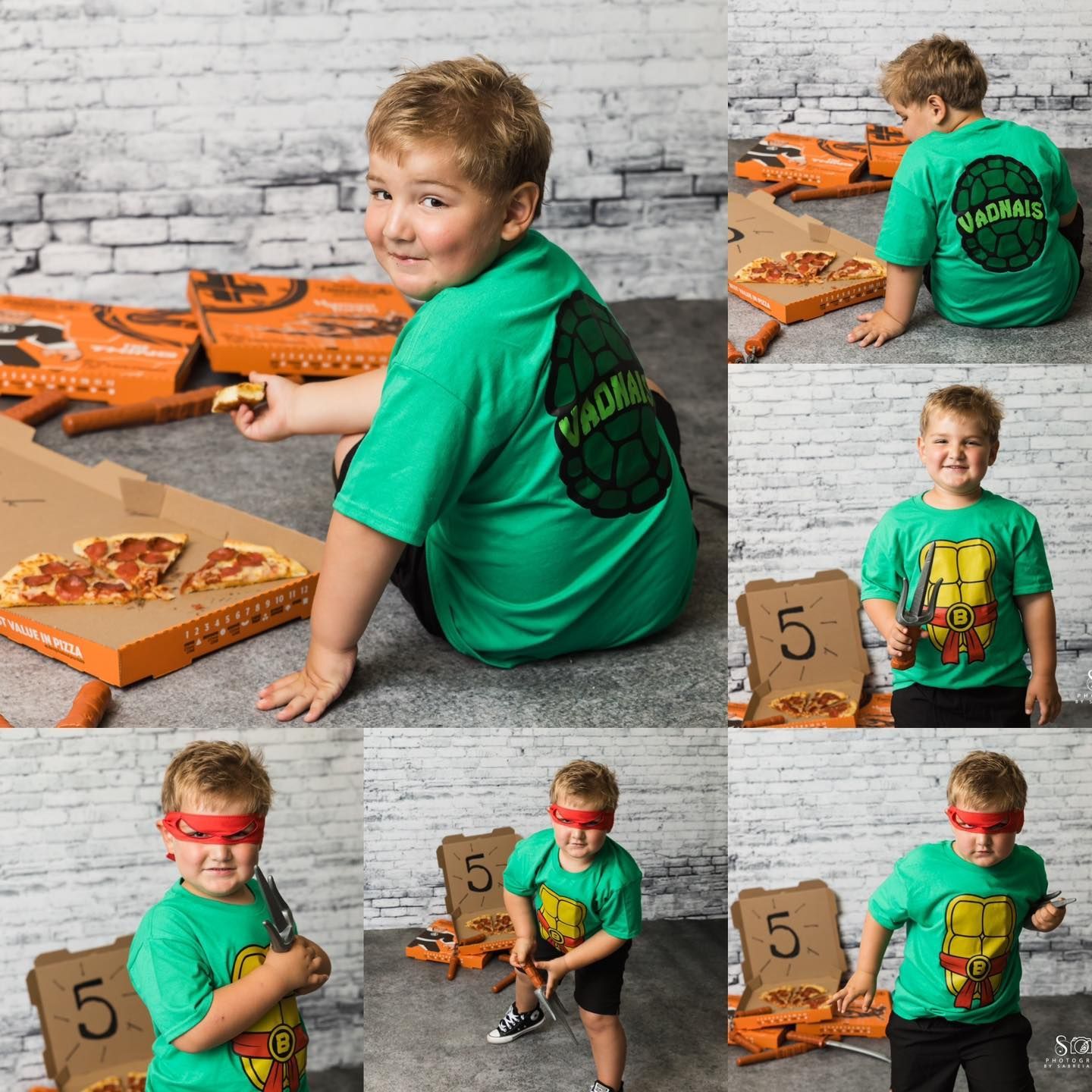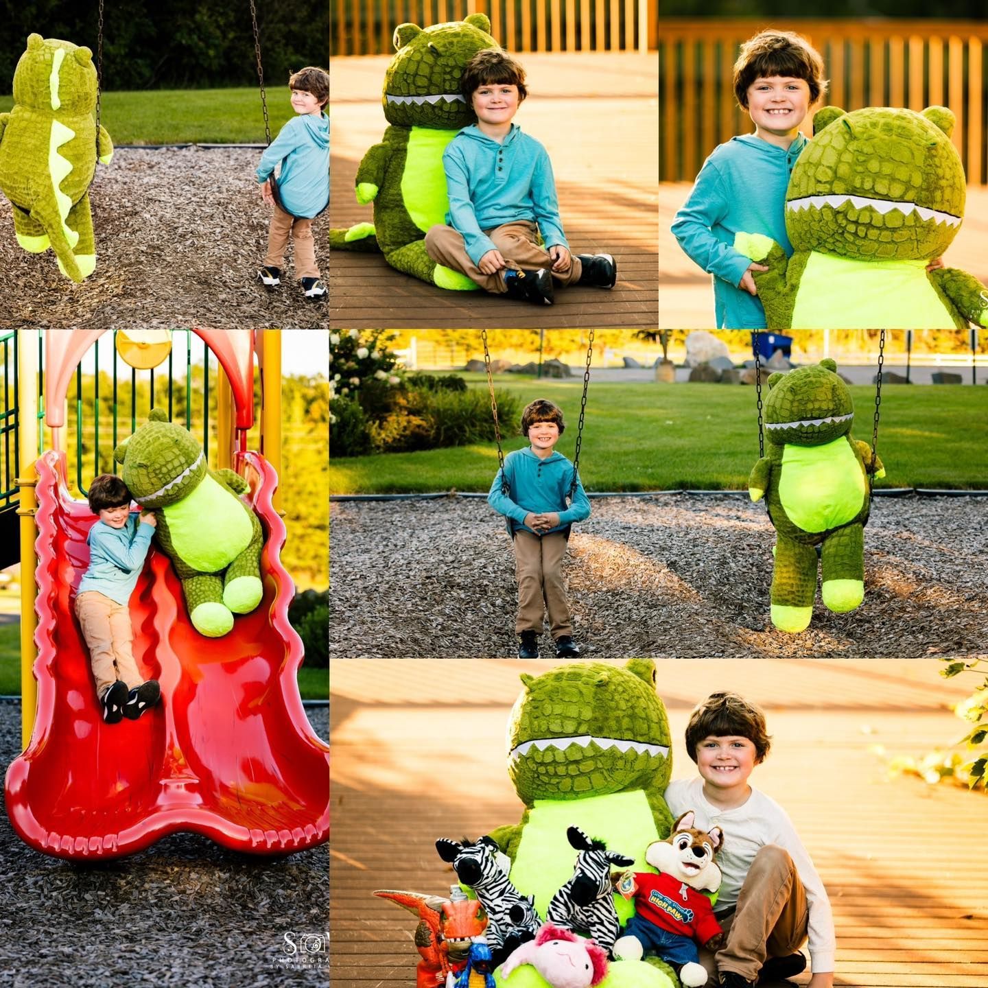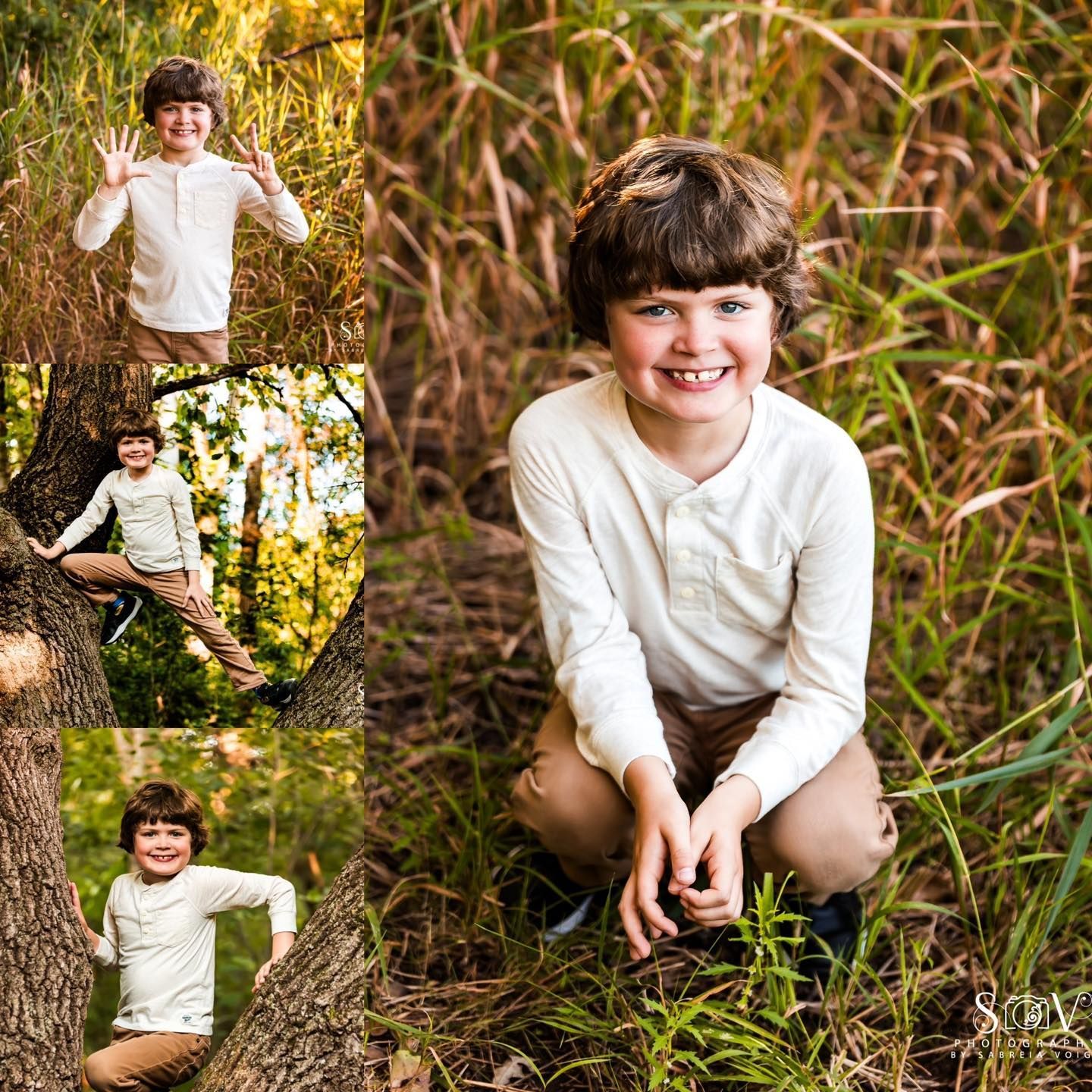 • Young boy in black vest and shirt smiles in front of ornate black backdrop.