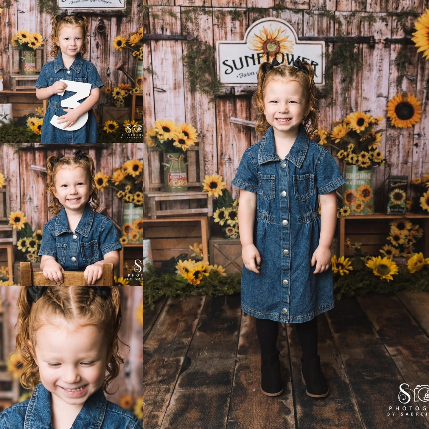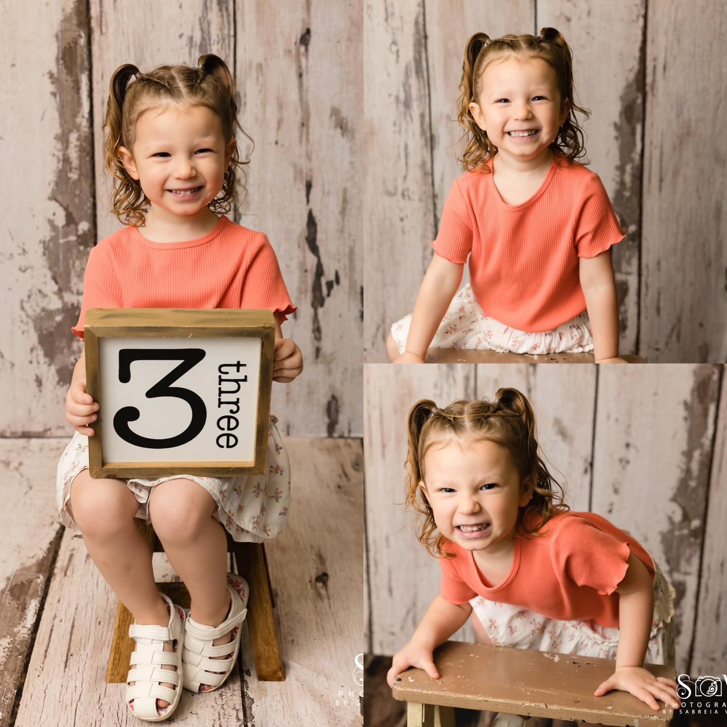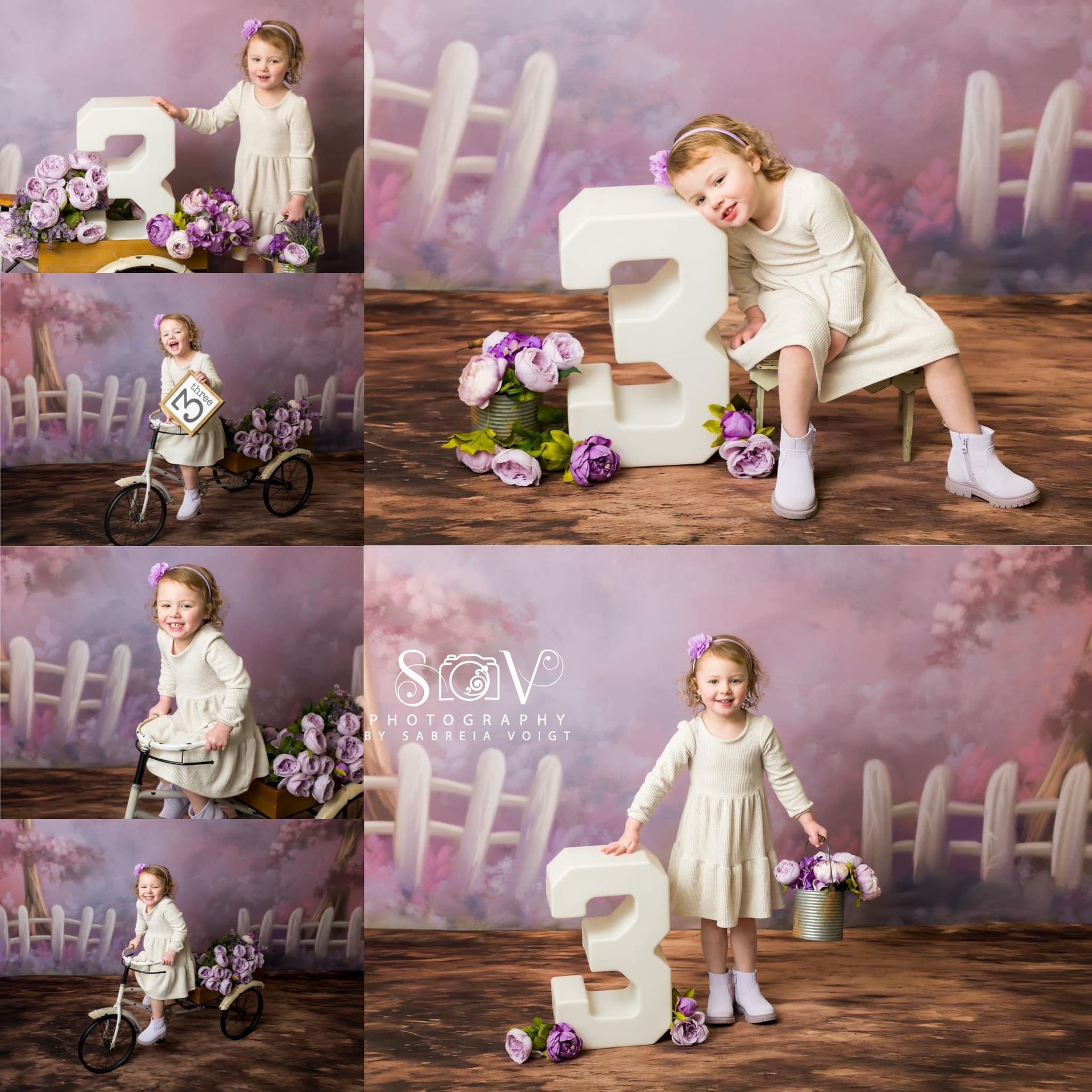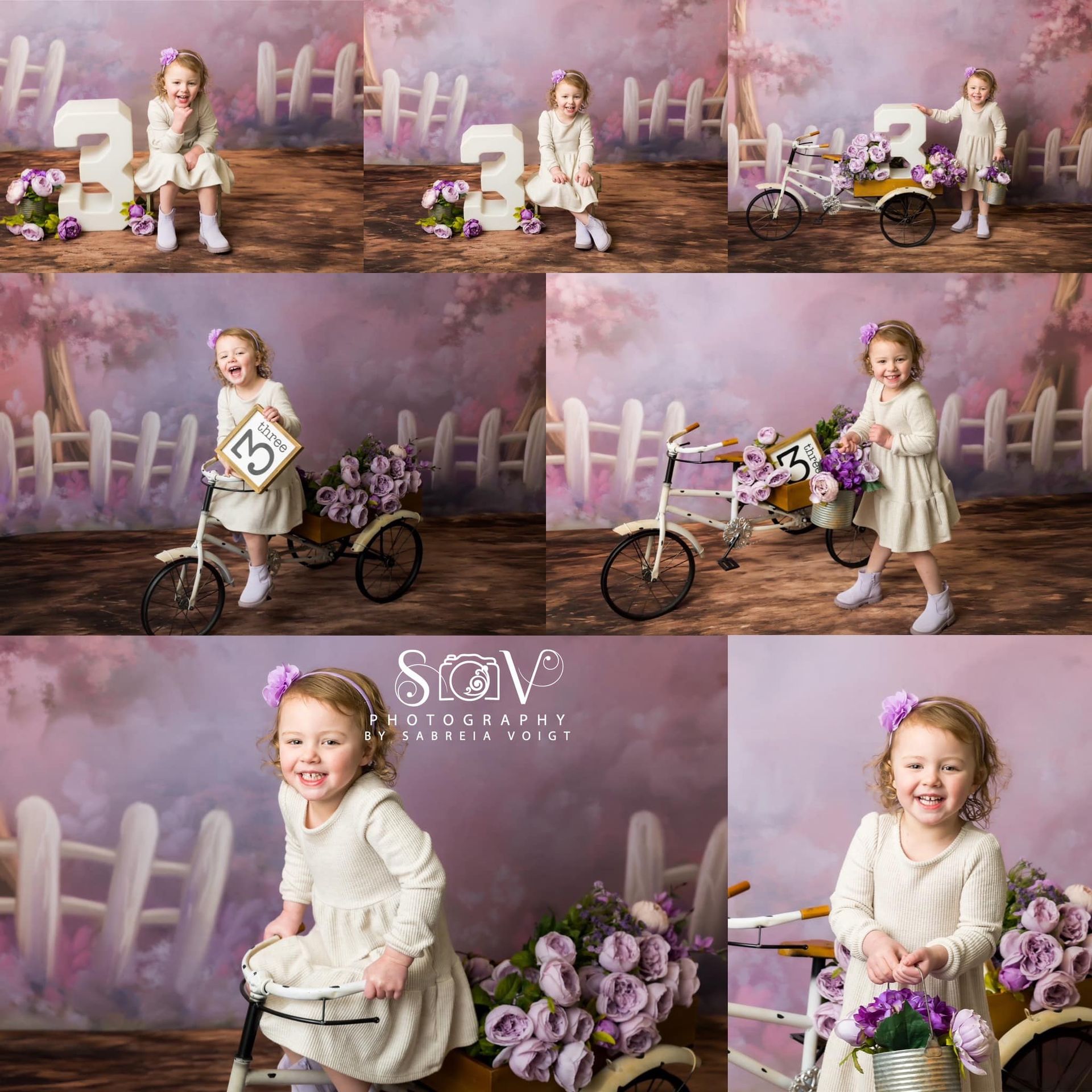 • Girl in pink dress sits on tricycle, surrounded by flowers; wooden block reads