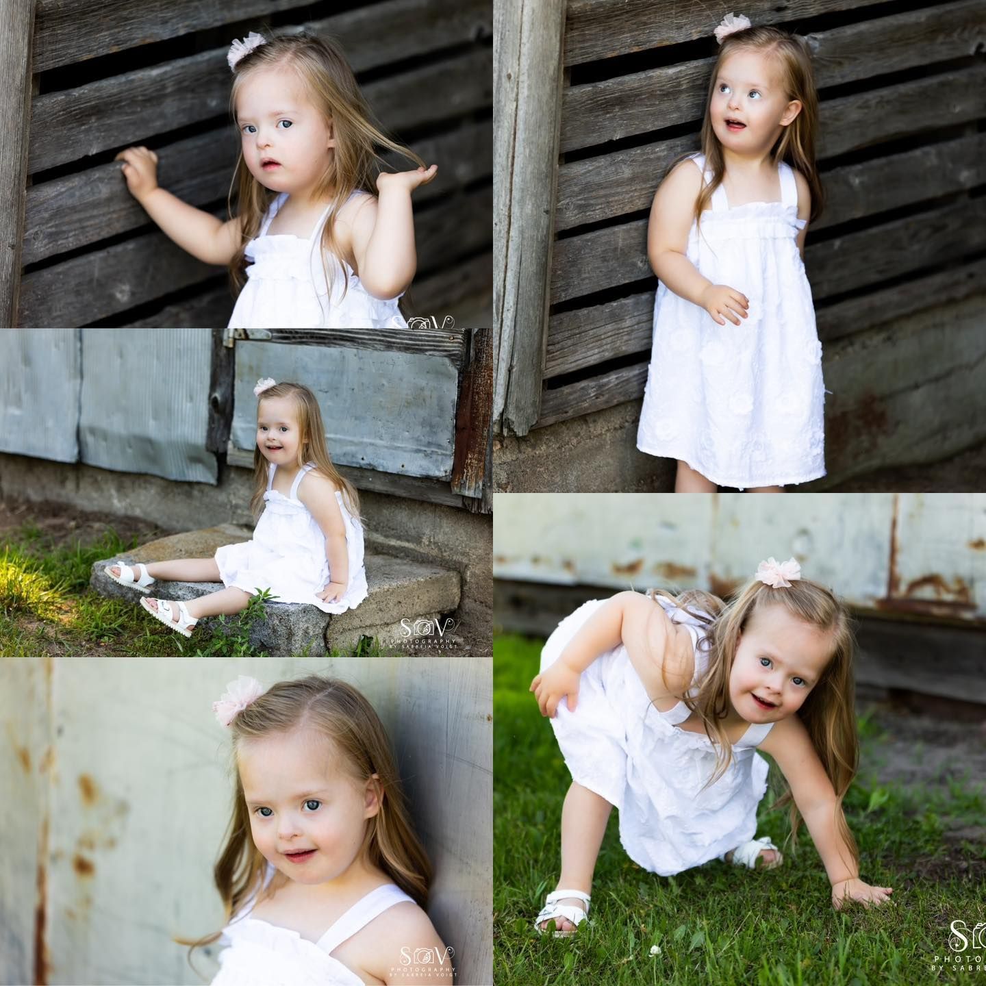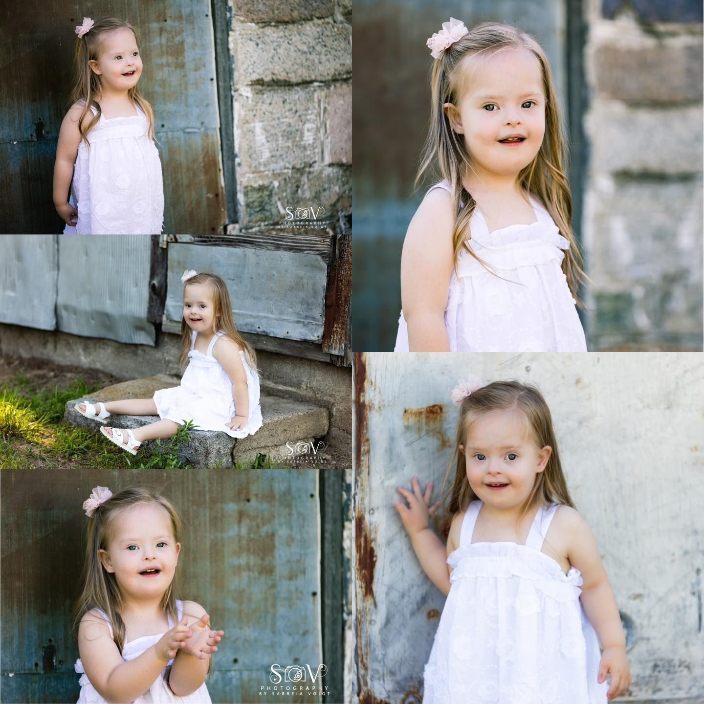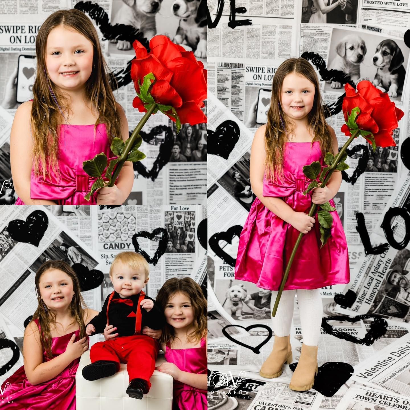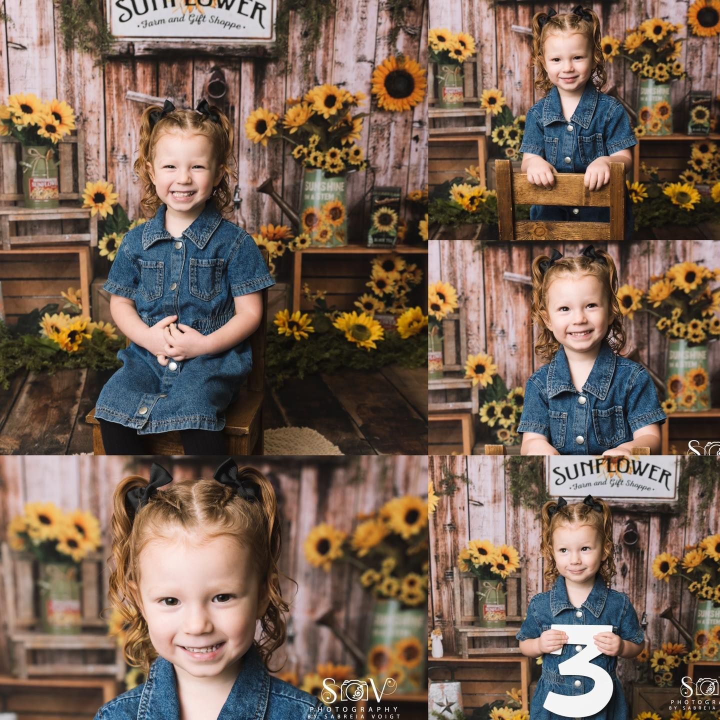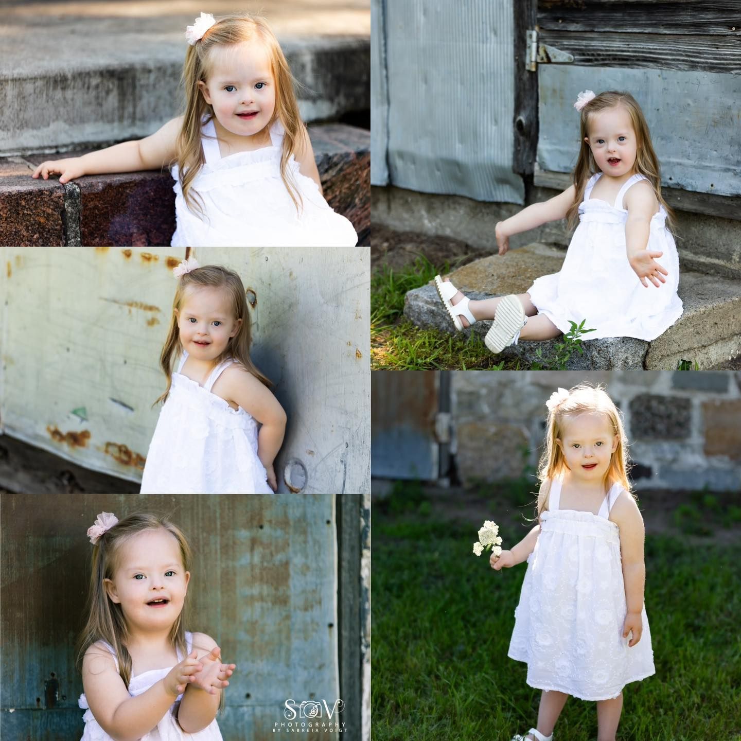 • Girl in pink dress sits on tricycle, surrounded by flowers; wooden block reads