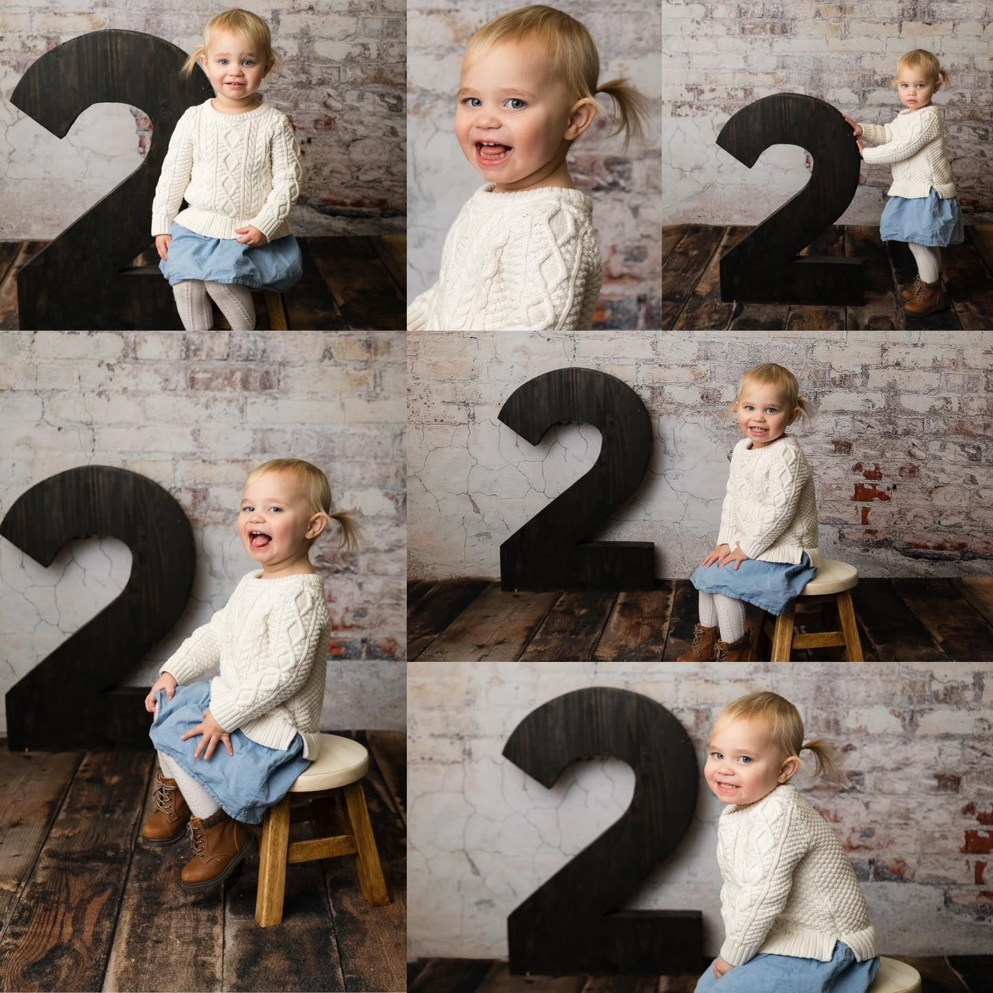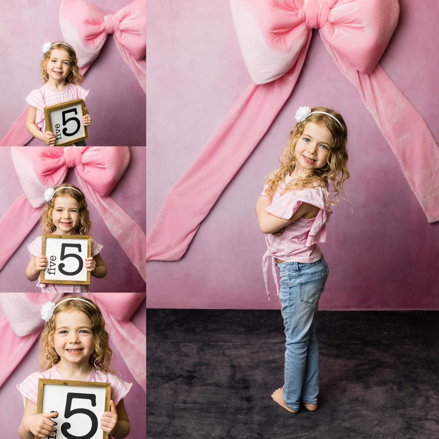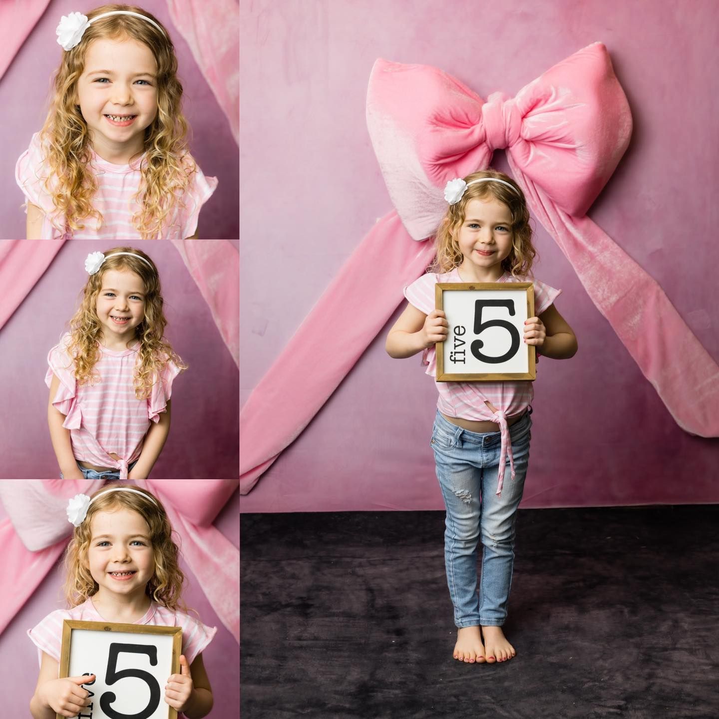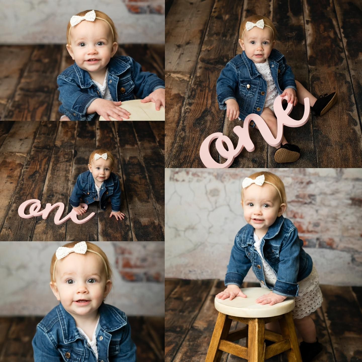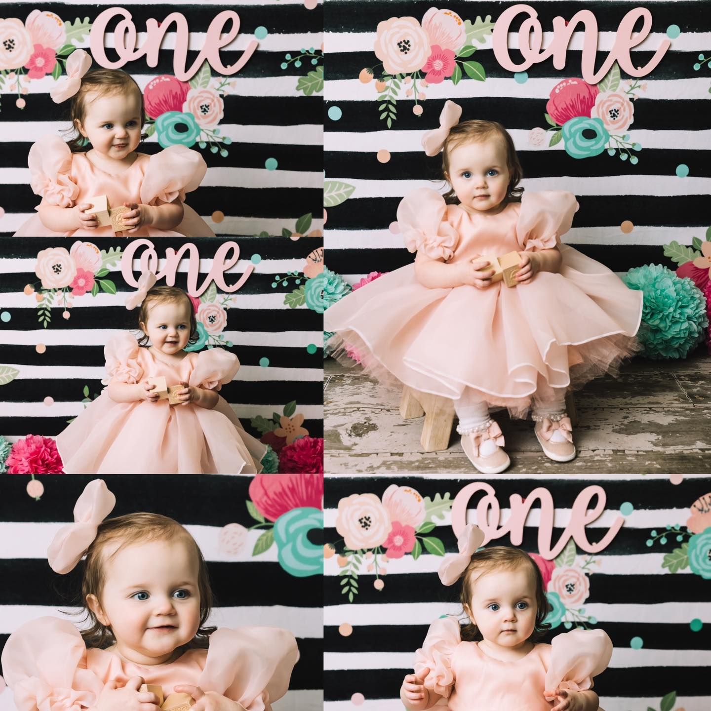 • Smiling toddler wearing a beige dress and a pink bow headband leans on a white number one.