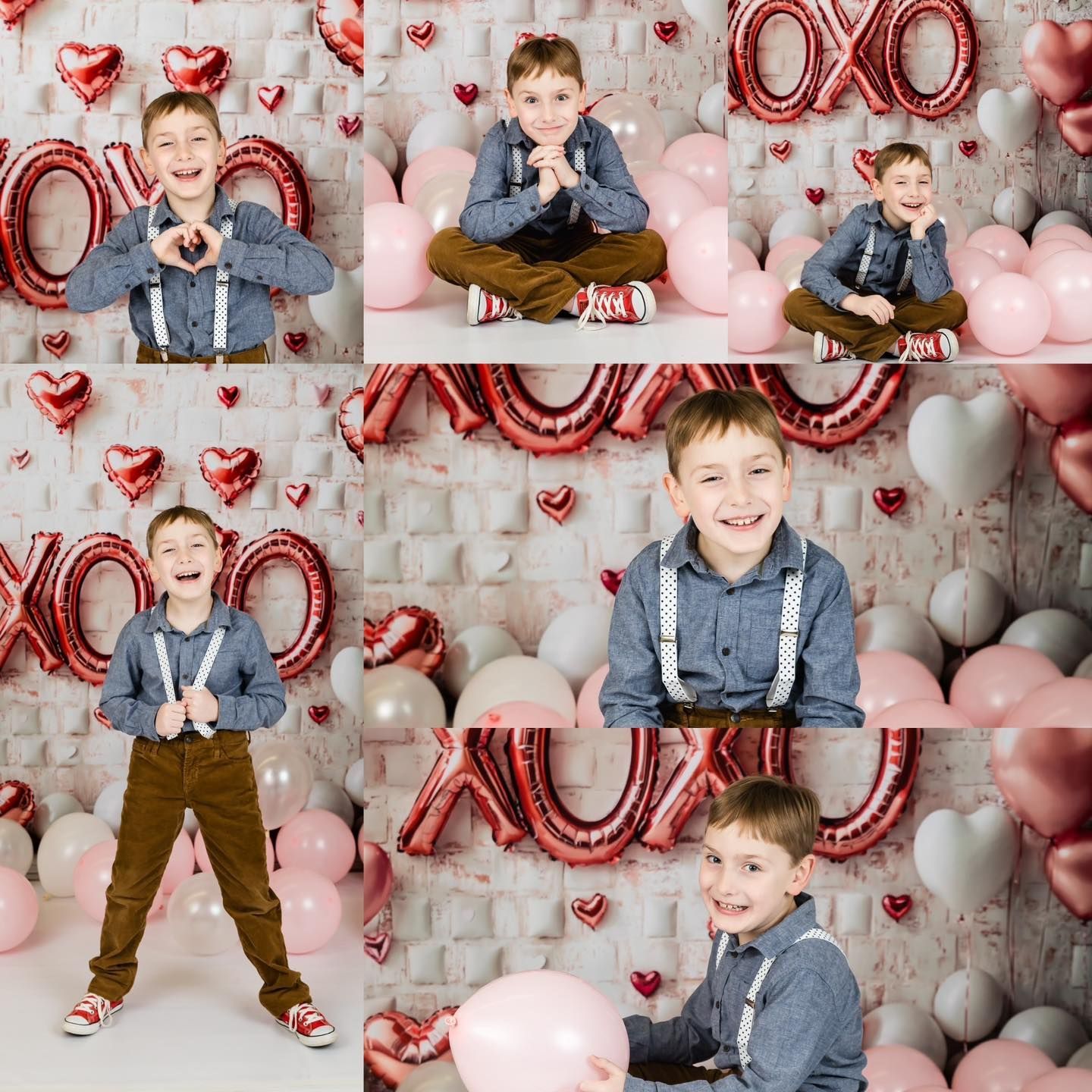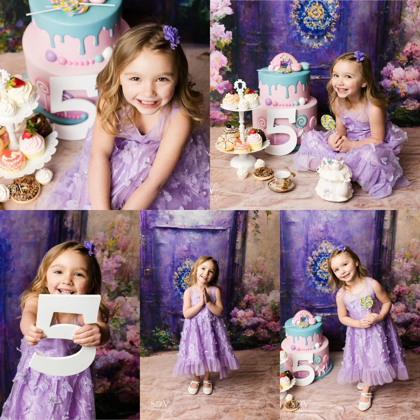 • Smiling child sits surrounded by pink, purple, and blue balloons.