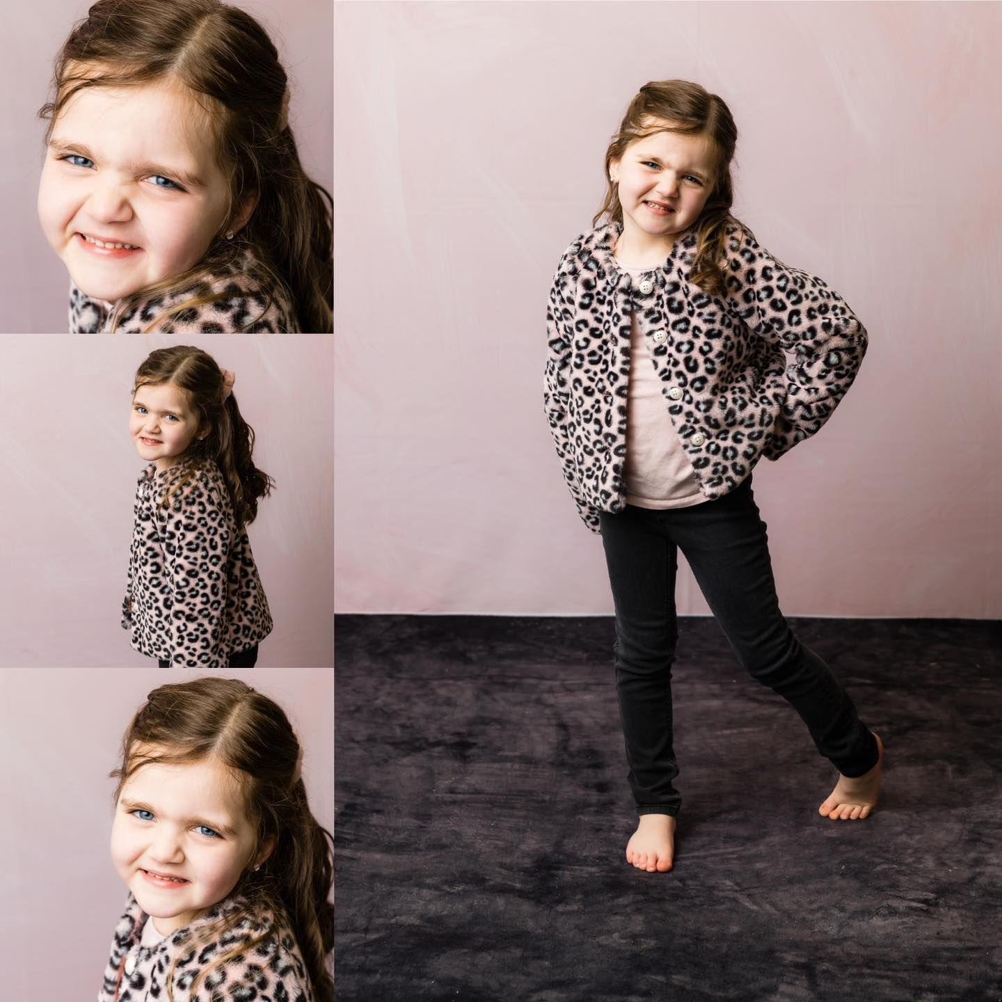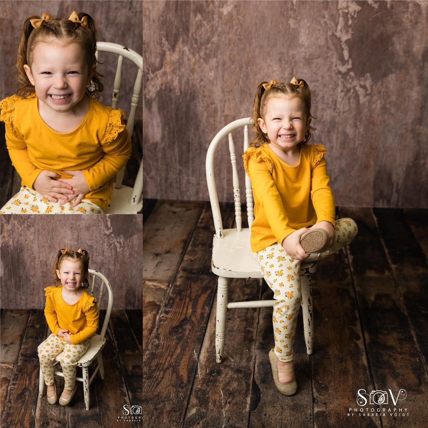 • A young child sitting in a gray round chair against a textured blue backdrop, smiling.