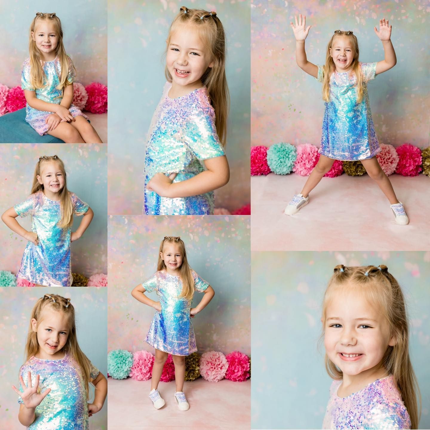 • Girl in mermaid-themed outfit, smiling with hands on hips, in front of an aquatic background.