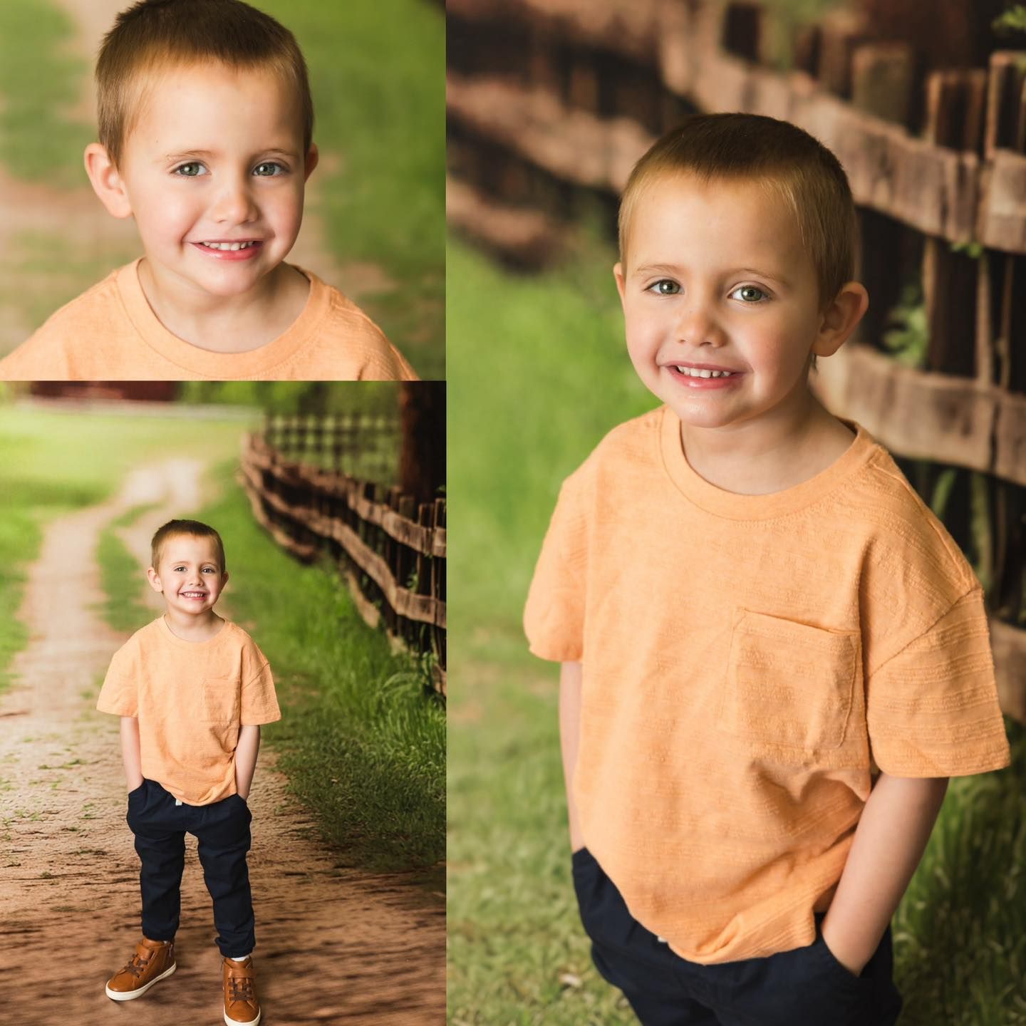 • Boy smiling in orange shirt and dark pants, hands in pockets, against a brick wall and wooden floor.