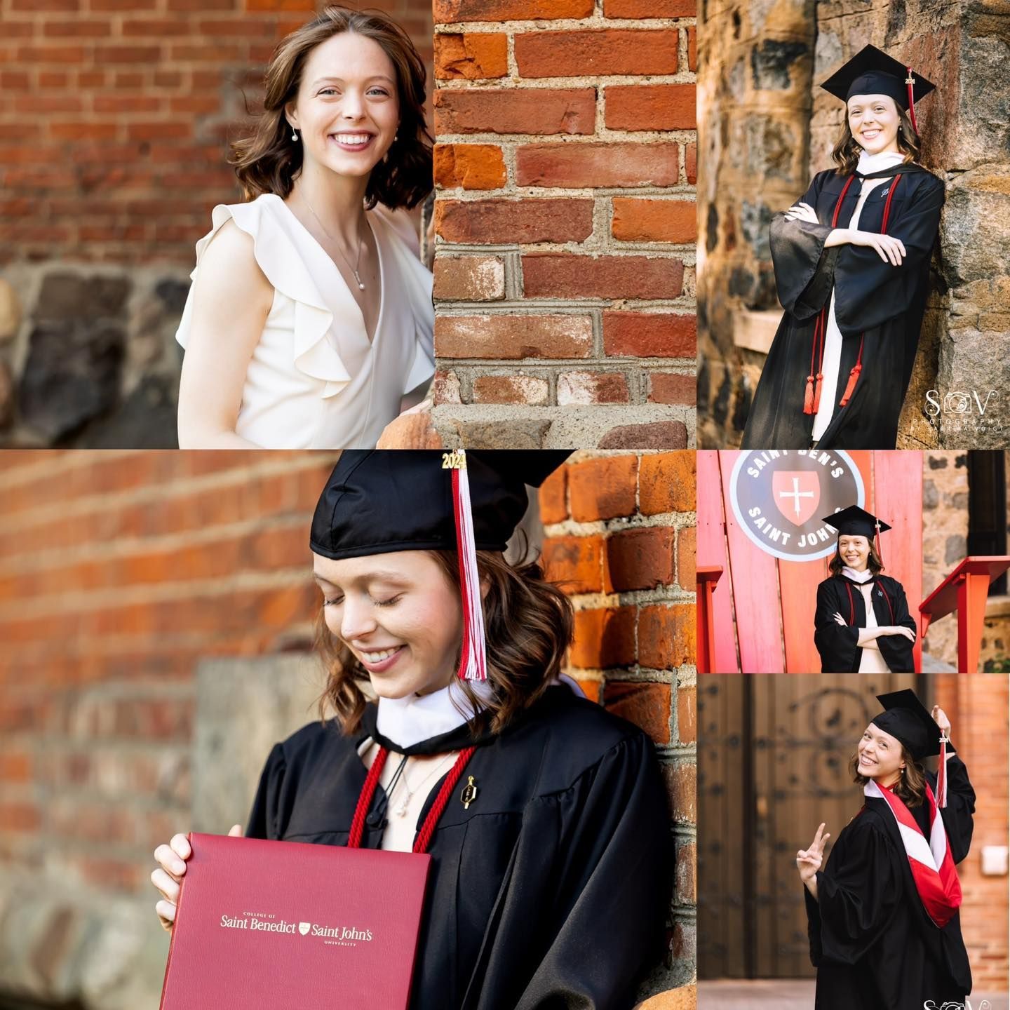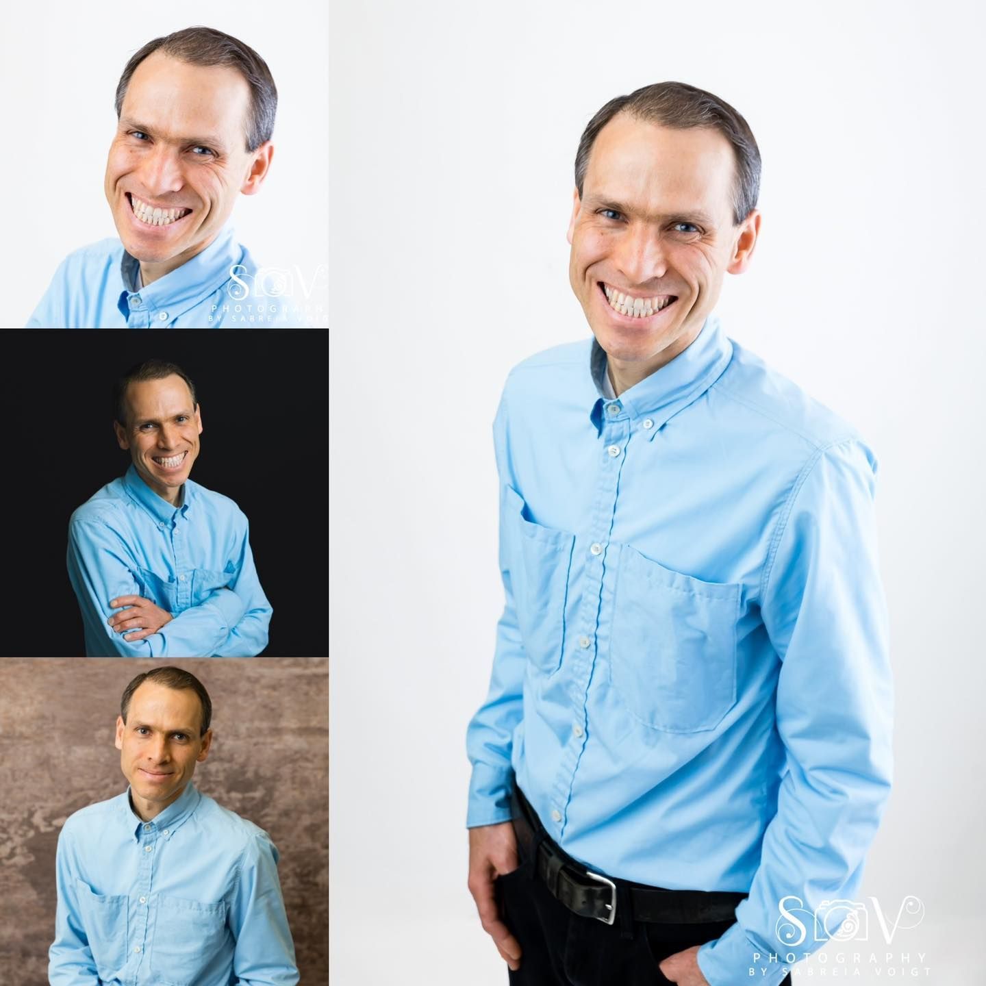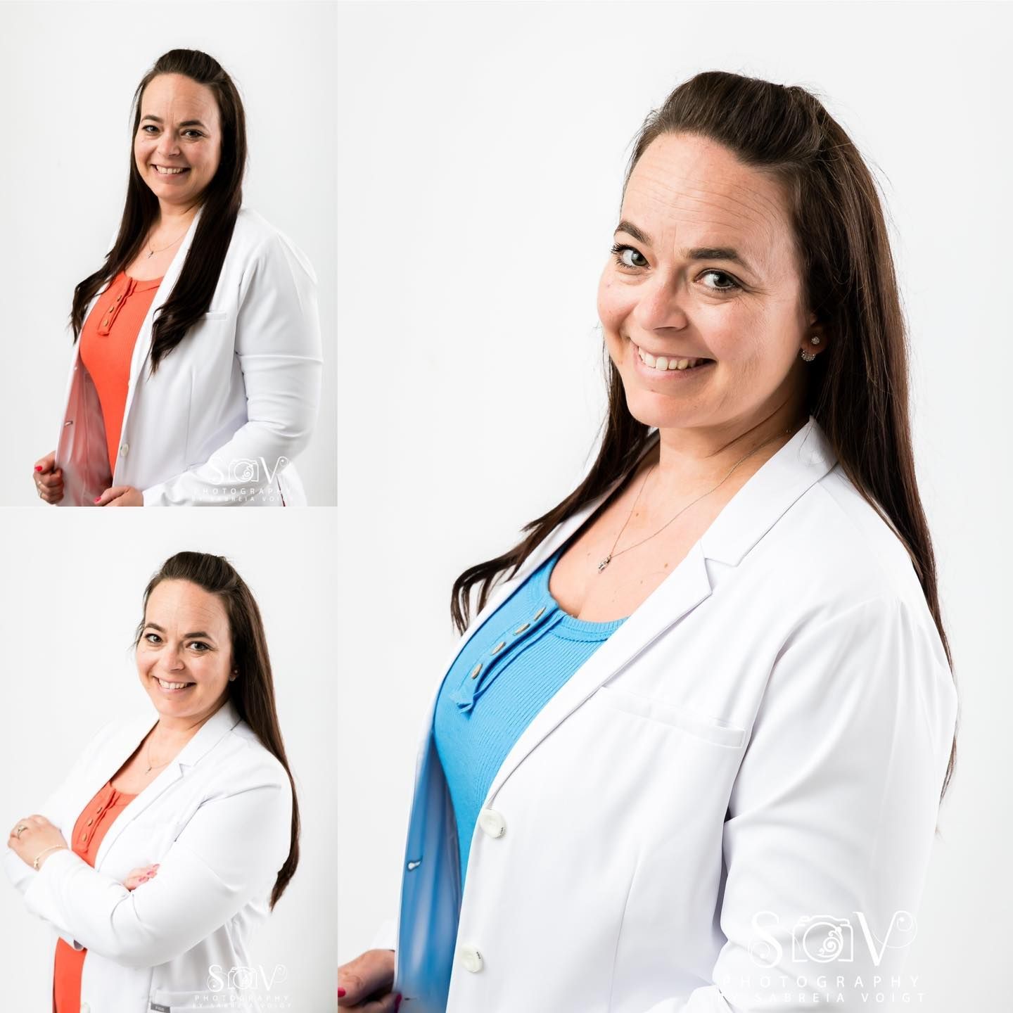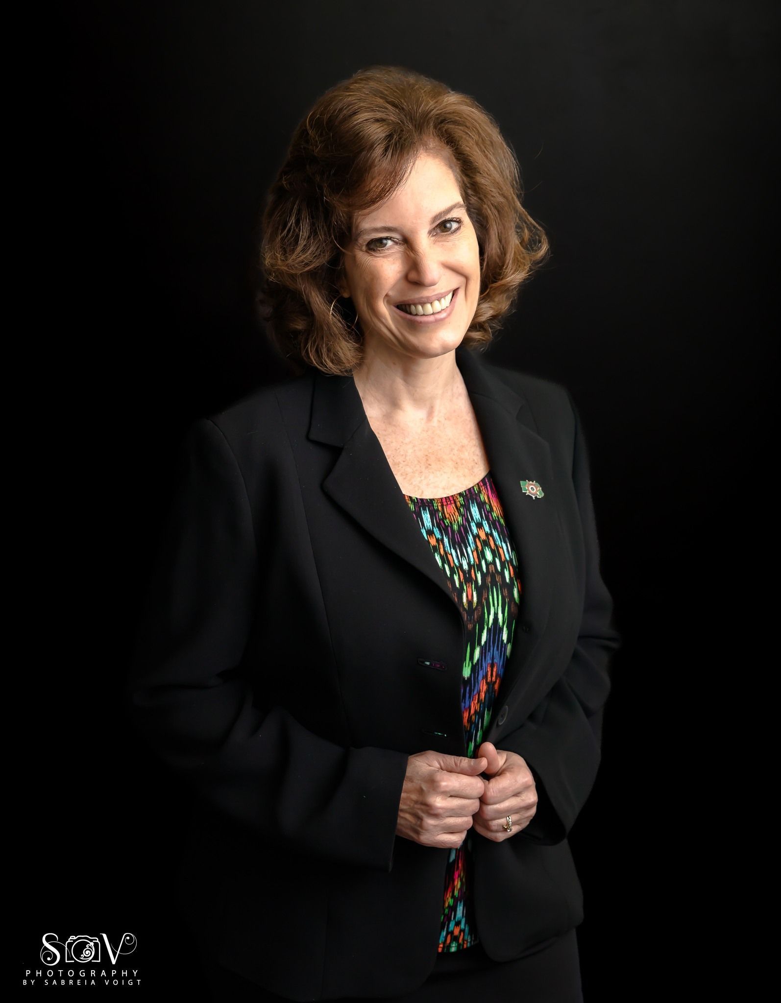 Woman holding camera, smiling, above gray sign "SOV Photography by Sabria Voigt."