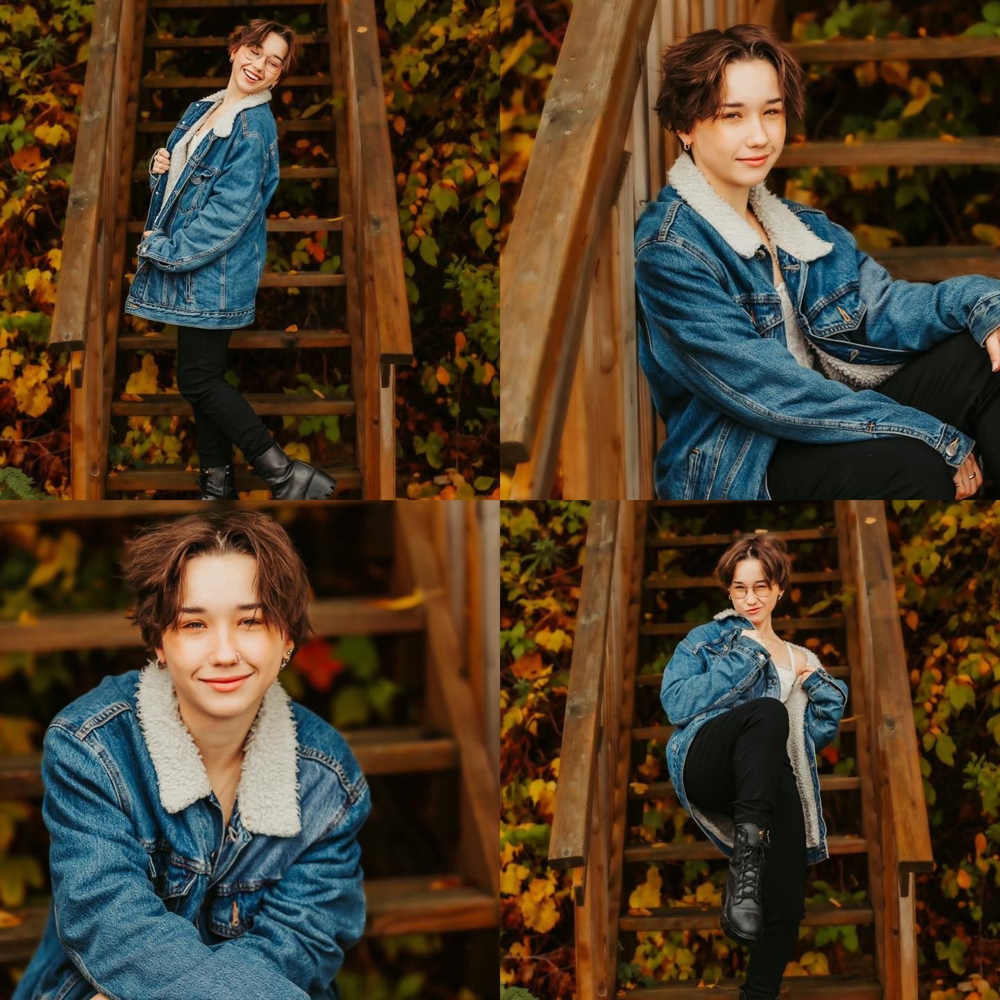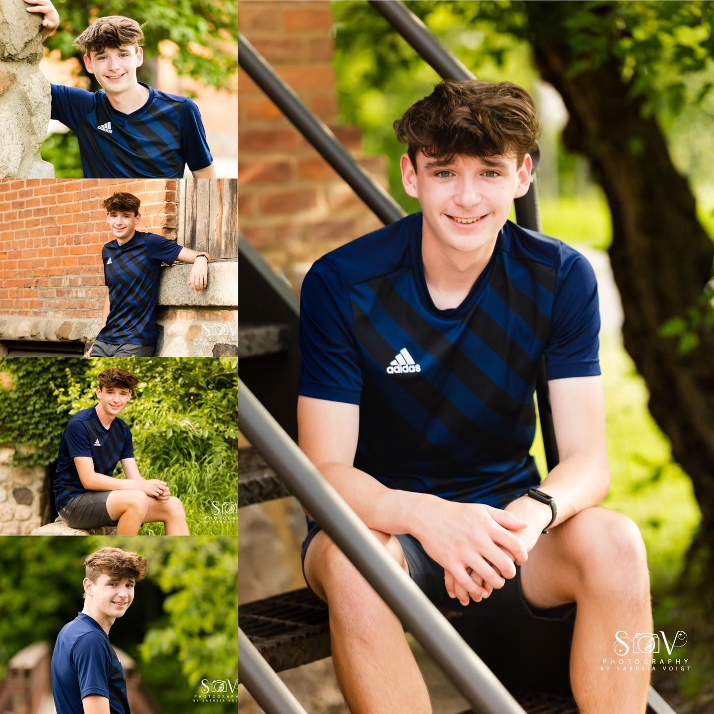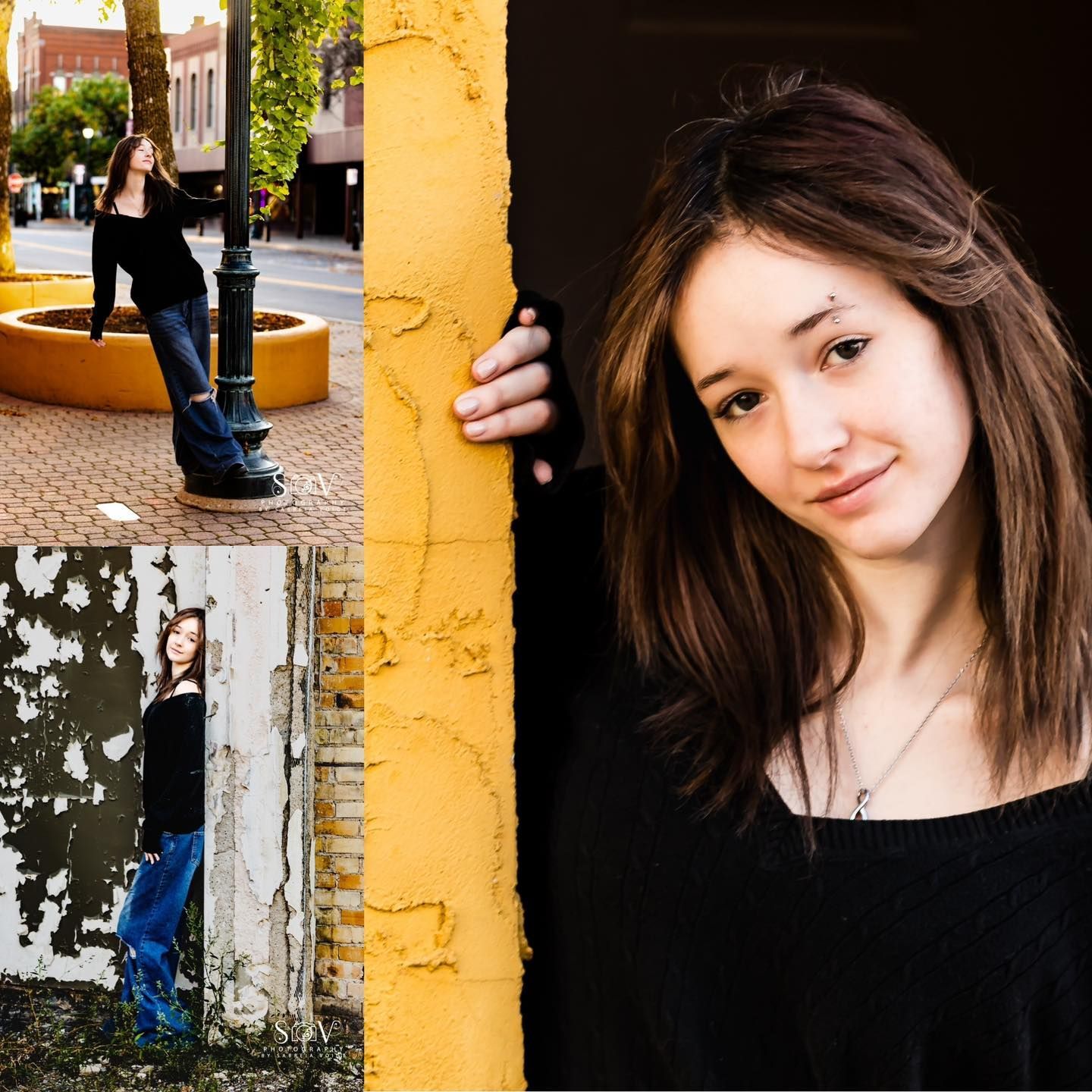 Woman holding camera, smiling, above gray sign "SOV Photography by Sabria Voigt."